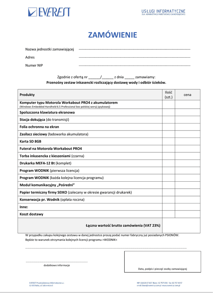ZAMÓWIENIE Nazwa jednostki zamawiającej ------------------------------------------------------------------------------------------------------ Adres ------------------------------------------------------------------------------------------------------ Numer NIP ------------------------------------------------------------------------------------------------------ Zgodnie z ofertą nr ______/______ z dnia _____ zamawiamy: Przenośny zestaw inkasencki rozliczający dostawę wody i odbiór ścieków. Ilość (szt.) Produkty cena Komputer typu Motorola Workabout PRO4 z akumulatorem (Windows Embedded Handheld 6.5 Professional bez polskiej wersji językowej) Spolszczona klawiatura ekranowa Stacja dokująca (do transmisji) Folia ochronna na ekran Zasilacz sieciowy (ładowarka akumulatora) Karta SD 8GB Futerał na Motorola Workabout PRO4 Torba inkasencka z kieszeniami (czarna) Drukarka MEFA-12 Bt (komplet) Program WODNIK (pierwsza licencja) Program WODNIK (każda kolejna licencja programu) Moduł komunikacyjny „Pośredni” Papier termiczny firmy SEIKO (zalecany w okresie gwarancji drukarek) Konserwacja pr. Wodnik (opłata roczna) Inne: Koszt dostawy Łączna wartość brutto zamówienia (VAT 23%) W przypadku zakupu kolejnego zestawu w danej jednostce proszę podać numer fabryczny już posiadanych PSIONÓW. Będzie to warunek otrzymania kolejnych licencji programu >WODNIK< ………………………………………………………………………………….………………………………………………………………………………….………………………………………………… …………………………………………………………………………………. dodatkowe informacje Data, podpis i pieczęć osoby zamawiającej