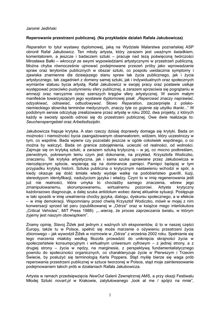 Jaromir Jedliński Reperowanie przestrzeni publicznej. (Na przykładzie działań Rafała Jakubowicza) Reparation to tytuł wystawy dyplomowej, jaką na Wydziale Malarstwa poznańskiej ASP obronił Rafał Jakubowicz. Ten młody artysta, który zarazem jest uważnym świadkiem, komentatorem, a jeszcze i badaczem sztuki – pracuje nad tezą poświęconą twórczości Mirosława Bałki – wkroczył ze swymi wypowiedziami artystycznymi w przestrzeń publiczną. Można chyba równocześnie ujmować podejmowane przezeń próby jako wprowadzanie spraw oraz terytoriów publicznych w obszar sztuki, co pospołu uwidacznia symptomy i zjawiska znamienne dla dzisiejszego stanu spraw tak życia publicznego, jak i życia artystycznego, tak zagadnień z domeny samej sztuki, jak i indywidualnych oraz społecznych wymiarów statusu bycia artystą. Rafał Jakubowicz w swojej pracy oraz postawie usiłuje występować przeciwko pustynnieniu sfery publicznej, a zarazem sprzeciwia się pogrążaniu w amnezji oraz narcyzmie coraz szerszych kręgów sfery artystycznej. W swoim małym manifeście towarzyszącym jego wystawie dyplomowej pisał: „Reperować znaczy naprawiać, odzyskiwać, odnawiać, odbudowywać. Słowo Reparation, zaczerpnięte z polskoniemieckiego słownika terminów medycznych, znaczy tyle co gojenie się ubytku tkanki...” W podobnym sensie odczytuję zrealizowane przez artystę w roku 2002, dwa projekty, z których każdy w swoisty sposób odnosi się do przestrzeni publicznej. Owe dwie realizacje to: Seuchensperrgebiet oraz Arbeitsdisziplin. Jakubowicza frapuje krytyka. A stan rzeczy dzisiaj doprawdy domaga się krytyki. Bada on możności i niemożności bycia zaangażowanym obserwatorem, widzem, który uczestniczy w tym, co wspólne. Bada wpierw czy pozostało jeszcze w ogóle cokolwiek wspólnego, o co można by walczyć. Bada on granice zobojętnienia, ucieczki od realności, od wolności. Zajmuje się on krytyką sztuki, a zarazem sztuką krytyczną – w jej, co mocno podkreślam, pierwotnym, pokrewnym temu czym jest dokonanie, na przykład, Krzysztofa Wodiczko, znaczeniu. Tak krytyka artystyczna, jak i sama szuka uprawiane przez Jakubowicza w nierozłącznym splocie, wspierają się na dominancie pamięci. Pamięci będącej w tym przypadku krytyką historii. Sztuka publiczna o krytycznym nastawieniu wchodzi w spór, a kiedy okazuje się dość śmiała wtedy wydaje walkę na podobieństwo guerilli, iluzji, stereotypom identyfikacji, nadużyciom języka i władzy. Czyni to w imię regenerowania jeśli już nie realności, która umyka to chociażby samego znaczenia, wbrew jego zmanipulowanemu, skorumpowanemu, wirtualnemu pozorowi. Artysta krytyczny każdorazowo diagnozuje, a dalej szuka antidotum wobec danej aktualnie sytuacji. Postępuje w taki sposób w imię urealnienia choćby języka, dialogu, dyskursu społecznego, a w efekcie – w imię demokracji. Wspomniany przed chwilą Krzysztof Wodiczko, mówił w mojej z nim konwersacji sprzed lat paru (opublikowanej w „Odrze” oraz w książce mego interlokutora „Critical Vehicles”, MIT Press 1988): „...wierzę, że proces zaprzeczania światu, w którym żyjemy jest naszym obowiązkiem”. Znamy opinię, Slavoj Žižek jest jednym z ważnych ich eksponentów, iż to w naszej części Europy, także tu w Polsce, spełnić się może marzenie o ożywieniu przestrzeni życia zbiorowego – jak wywodził Žižek w rozmowie w „Odrze” z września 2002 roku. Spełnianie się tego marzenia miałoby według filozofa prowadzić do uniknięcia skrajności życia w społeczeństwie konsumpcyjnym i wirtualnym uniwersum cyfrowym – z jednej strony, a z drugiej strony – życia w nędzy, na marginesie, z perspektywą fundamentalistycznego powrotu do społeczności organicznych, co charakteryzuje życie w Pierwszym i Trzecim Świecie, by posłużyć się terminologią Karla Poppera. Stąd myślę bierze się waga prób reperowania przestrzeni publicznej w sztuce tworzonej w Polsce, stąd moje zainteresowanie podejmowaniem takich prób w działaniach Rafała Jakubowicza. Artysta w ramach przedsięwzięcia NewOut Galerii Zewnętrznej AMS, a przy okazji Festiwalu Młodej Sztuki novart.pl w Krakowie, zatytułowanego „look at me / spójrz na mnie”, 1 zorganizowanego przez krakowski Bunkier Sztuki i Centrum Sztuki Współczesnej w Zamku Ujazdowskim, w lecie 2002 roku umieścił na bilboardzie zawieszonym wysoko na ścianie krakowskiej kamienicy wielki afisz, na którego gołębio-szarym tle przebiegał poziomo napis jakby wystukany na zużytej mechnicznej maszynie do pisania. Jedno długie słowo w języku niemieckim – fantom pamięci i niepokoju: Seuchensperrgebiet. Ten bilboard sąsaidował z innym reklamowym plakatem także umieszczonym na bilboardzie AMS kuszącym słowami „Spłacaj – jak chcesz” zamówionym przez MultiBank. Co znaczy to tajemnicze słowo, które nawet trudno wypowiedzieć, odczytać w pospiesznym ruchu wielkomiejskim? Seuchensperrgebiet – obszar objęty zarazą. Słowo to należy do owych zatrutych, chociaż w 1947 roku ironicznie nazwanych przez Nachmana Blumentala „słowami niewinnymi”, wyrażeń jakie wykształcił język Trzeciej Rzeszy dla eufemistycznego określania elementów machiny zbrodni. Victor Klemperer analizując LTI (Lingua Tertii Imperii), pisał: „Narodowy socjalizm wślizgiwał się w ciało i krew tłumu pojedynczymi słowami, zwrotami, formami zdań, które narzucał przez milionkrotne ich powtarzanie i które podejmowane były mechanicznie i nieświadomie”. W swoim eseju poświęconym tej oraz innym realizacjom Rafała Jakubowicza, a pomieszczonym w lecie 2002 roku na internetowych stronach „Magazynu Sztuki” (a obecnie opublikowanym w 20. numerze "Pro Memoria", Biuletynie Informacyjnym Państwowego Muzeum Auschwitz-Birkenau, oraz w 44. numerze "Formatu") Eleonora Jedlińska w gruntowny sposób poddała interpretacji tę realizację Jakubowicza, wskazując historyczne, i