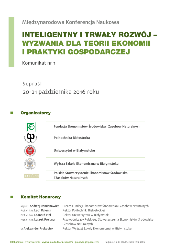 Międzynarodowa Konferencja Naukowa INTELIGENTNY I TRWAŁY ROZWÓJ – WYZWANIA DLA TEORII EKONOMII I PRAKTYKI GOSPODARCZEJ Komunikat nr 1 Supraśl 20-21 października 2016 roku Organizatorzy Fundacja Ekonomistów Środowiska i Zasobów Naturalnych Politechnika Białostocka Uniwersytet w Białymstoku Wyższa Szkoła Ekonomiczna w Białymstoku Polskie Stowarzyszenie Ekonomistów Środowiska i Zasobów Naturalnych Komitet Honorowy Mgr inż. Andrzej Demianowicz Prezes Fundacji Ekonomistów Środowiska i Zasobów Naturalnych Prof. dr hab. Lech Dzienis Rektor Politechniki Białostockiej Prof. dr hab. Leonard Etel Rektor Uniwersytetu w Białymstoku Prof. dr hab. Leszek Preisner Przewodniczący Polskiego Stowarzyszenia Ekonomistów Środowiska i Zasobów Naturalnych Dr Aleksander Prokopiuk Rektor Wyższej Szkoły Ekonomicznej w Białymstoku Inteligentny i trwały rozwój – wyzwania dla teorii ekonomii i praktyki gospodarczej Supraśl, 20-21 października 2016 roku Komitet Naukowy Prof. dr hab. d.h.c. Bogusław Fiedor Uniwersytet Ekonomiczny we Wrocławiu Prof. dr hab. Bazyli Poskrobko Uniwersytet w Białymstoku Prof. dr hab. Ivanna Bakushevich Tarnopolski Instytut Technologii Społecznych i Informacyjnych (Ukraina) Prof. dr hab. Tadeusz Borys Uniwersytet Ekonomiczny we Wrocławiu Prof. dr hab. Adam Budnikowski Szkoła Główna Handlowa Prof. dr hab. Małgorzata Burchard-Dziubińska Uniwersytet Łódzki Prof. Eva Cudlinova University of South Bohemia (Republika Czeska) Prof. dr hab. Stanisław Czaja Uniwersytet Ekonomiczny we Wrocławiu – Przewodniczący Prof. dr hab. inż. Joanna Ejdys Politechnika Białostocka Prof. dr hab. Józefa Famielec Uniwersytet Ekonomiczny w Krakowie Prof. dr hab. Vladimir Fateyev Państwowy Uniwersytet im. Janki Kupały w Grodnie (Białoruś) Prof. dr hab. Roman Fedan Państwowa Wyższa Szkoła Techniczno-Ekonomiczna w Jarosławiu Prof. dr hab. Kazimierz Górka Uniwersytet Ekonomiczny w Krakowie Prof. dr hab. Andrzej Graczyk Uniwersytet Ekonomiczny we Wrocławiu Prof. dr hab. Piotr Jeżowski Szkoła Główna Handlowa w Warszawie Prof. dr hab. Guenadii Khatskevich Białoruska Akademia Nauk w Mińsku (Białoruś) Prof. dr hab. Dariusz Kiełczewski Uniwersytet w Białymstoku Prof. dr hab. Eugeniusz Kośmicki Uniwersytet Przyrodniczy w Poznaniu Prof. dr hab. Barbara Kryk Uniwersytet Szczeciński Prof. dr hab. Kazimierz Krzysztofek Uniwersytet SWPS w Warszawie Prof. dr hab. inż. Jerzy Lewandowski Politechnika Łódzka Prof. dr hab. Elżbieta Lorek Uniwersytet Ekonomiczny w Katowicach Prof. dr hab. Teresa Łaguna Uniwersytet Warmińsko-Mazurski w Olsztynie Prof. dr hab. Bogusz Mikuła Uniwersytet Ekonomiczny w Krakowie Prof. dr hab. Inż. Rafał Miłaszewski Uniwersytet Kardynała Stefana Wyszyńskiego w Warszawie Prof. dr hab. Mieczysław Morawski Uniwersytet Ekonomiczny we Wrocławiu Prof. dr hab. Tadeusz Pindór Akademia Górniczo-Hutnicza w Krakowie Prof. dr hab. Ewa Roszkowska Uniwersytet w Białymstoku Prof. dr hab. Andrzej Sadowski Uniwersytet w Białymstoku Prof. dr hab. Maciej Sadowski Instytut Ochrony Środowiska, Państ. Instytut Badawczy w Warszawie Prof. dr hab. Henryk Sasinowski Politechnika Białostocka Prof. dr hab. Henryk Wnorowski Uniwersytet w Białymstoku Prof. dr hab. Stanisław Wrzosek Katolicki Uniwersytet Lubelski Prof. dr hab. Kazimierz Zimniewicz Społeczna Akademia Nauk w Łodzi Prof. dr hab. Tomasz Żylicz Uniwersytet Warszawski Komitet Organizacyjny dr inż. Elżbieta Broniewicz Politechnika Białostocka – Przewodnicząca dr inż. Joanna Godlewska Politechnika Białostocka dr Tomasz Poskrobko Uniwersytet w Białymstoku dr Bogumiła M. Powichrowska Wyższa Szkoła Ekonomiczna w Białymstoku – Sekretarz dr Edyta Sidorczuk-Pietraszko Wyższa Szkoła Ekonomiczna w Białymstoku mgr Halina Tokajuk Fundacja Ekonomistów Środowiska i Zasobów Naturalnych Inteligentny i trwały rozwój – wyzwania dla teorii ekonomii i praktyki gospodarczej Supraśl, 20-21 października 2016 roku Cel konferencji Konferencja będzie poświęcona naukowej dyskusji nad teoretycznymi i praktycznymi aspektami wzajemnych relacji między koncepcjami rozwoju zrównoważonego i gospodarki opartej na wiedzy. Politycznej deklaracji, że trwały i inteligentny rozwój promujący włączenie społeczne stanowi ścieżkę rozwoju Unii, powinna towarzyszyć naukowa refleksja nad teoretycznymi założeniami proponowanej polityki i rozwiązań, a także nad praktyką ich funkcjonowania. Kształtowanie procesów rozwojowych na każdym poziomie zarządzania wymaga bowiem odpowiednich podstaw teoretycznych i informacyjnych, ale także procesu ciągłej ewaluacji. Niniejsza konferencja jest elementem tego procesu. Kluczowym aspektem jest dyskusja nad specyfiką procesu dochodzenia do zrównoważonej gospodarki opartej na wiedzy w krajach Europy Środkowo-Wschodniej. Ważnym elementem konferencji będzie także podsumowanie dorobku naukowego prof. Bazylego Poskrobki, w związku z jubileuszem Jego 75 urodzin. Planowane sesje problemowe 20 października 2016 r. • Od ekonomiki ochrony środowiska do ekonomii zrównoważonego rozwoju • Nauka o kreowaniu wiedzy na rzecz inteligentnego rozwoju • Czasopismo „Ekonomia i Środowisko” 21 października 2016 r. • Społeczny wymiar współczesnych trendów i koncepcji rozwojowych • Od polityki ekologicznej do polityki inteligentnego i trwałego rozwoju • Zrównoważony rozwój polskiej gospodarki – studia przypadków Formy uczestnictwa i prezentacji prac • referaty w sesjach do 15 min • postery 70 × 100 cm • wystąpienia promocyjne firm, ekspozycja stoisk firmowych, reklamy firm Inteligentny i trwały rozwój – wyzwania dla teorii ekonomii i praktyki gospodarczej Supraśl, 20-21 października 2016 roku Termin i miejsce konferencji Konferencja odbędzie się w dniach 20-21 października 2016 roku w Supraślu (szczegółowe informacje dotyczące miejsca obrad zostaną podane w Komunikacie 2). Miasteczko Supraśl jest mi