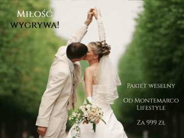 Miłość wygrywa! Dlatego przygotowaliśmy dla Państwa Pakiet Weselny za 999 zł, który pozwoli zaplanować wesele bez stresu o zbędne koszty, w szybkim terminie. Z Montemarco Lifestyle już za 999 zł mogą Państwo zaprosić Bliskich na weselną uroczystość do jednego z dwóch naszych hoteli – w centrum Warszawy, w Parku Skaryszewskim przy Stadionie Narodowym, lub we Włochach, niedaleko Lotniska im. Chopina, skąd będzie łatwo wybrać się w poślubną podróż! W obu hotelach zapewnimy noclegi Państwa Gościom w specjalnej cenie. Zapraszamy do wyboru jednej z opcji Pakietu Weselnego: Błękitnego lub Wrzosowego. Montemarco Lifestyle ul. Dźwigowa 43, Warszawa www.montemarco.pl Dedek Park Aleja Zieleniecka 6/8, Warszawa www.dedek.pl Błękitny Dla 10 osób, w tym Pary Młodej, przygotowaliśmy weselny obiad i prezent! Menu Przystawka: łosoś wędzony na mieszanych sałatach, z prażonym słonecznikiem Zupa: krem ze świeżych pomidorów z groszkiem ptysiowym Danie główne: polędwiczki wieprzowe faszerowane mozzarellą, bazylią i suszonymi pomidorami, kluseczki kładzione, warzywa duszone. Napoje gorące: kawa, herbata Napoje niegazowane: soki, woda W prezencie: tort weselny z naszej Manufaktury Tortów Montemarco Lifestyle ul. Dźwigowa 43, Warszawa www.montemarco.pl Dedek Park Aleja Zieleniecka 6/8, Warszawa www.dedek.pl Wrzosowy Dla 8 osób, w tym Pary Młodej, przygotowaliśmy weselny obiad, prezent i specjalny nocleg dla Nowożeńców! Menu Przystawka: carpaccio z polędwicy wołowej Zupa: krem z białych szparagów Danie główne: roladki drobiowe ze szpinakiem, ziemniaki z wody z koperkiem, warzywa duszone na parze Napoje gorące: kawa, herbata Napoje niegazowane: soki, woda Pokój dla Nowożeńców W prezencie: tort weselny z naszej Manufaktury Tortów Montemarco Lifestyle ul. Dźwigowa 43, Warszawa www.montemarco.pl Dedek Park Aleja Zieleniecka 6/8, Warszawa www.dedek.pl Mamy nadzieję, że nasze propozycje podobają się Państwu. Jeśli tak, zapraszamy do kontaktu z naszą Specjalistką do spraw Organizacji Wesel, Moniką Otłowską: tel.: +48 502 330 084, e – mail: [email protected]. Organizujemy również wesela i uroczystości rodzinne dla grup do 250 osób Oferujemy wybór sal weselnych i pomoc w organizacji każdego szczegółu. Zachęcamy do dołączenia do nas na Facebooku. Montemarco Lifestyle ul. Dźwigowa 43, Warszawa www.montemarco.pl Dedek Park Aleja Zieleniecka 6/8, Warszawa www.dedek.pl