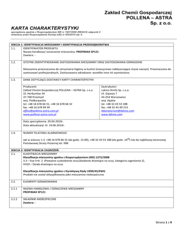 Zakład Chemii Gospodarczej POLLENA – ASTRA Sp. z o.o. KARTA CHARAKTERYSTYKI sporządzona zgodnie z Rozporządzeniem WE nr 1907/2006 (REACH) załącznik II zmieniony przez Rozporządzenie Komisji (UE) nr 453/2010 zał. II. SEKCJA 1: IDENTYFIKACJA MIESZANINY I IDENTYFIKACJA PRZEDSIĘBIORSTWA 1.1. IDENTYFIKATOR PRODUKTU Nazwa handlowa/ oznaczenie mieszaniny: PROFIMAX SP121 Zawiera: 1.2. ISTOTNE ZIDENTYFIKOWANE ZASTOSOWANIA MIESZANINY ORAZ ZASTOSOWANIA ODRADZANE Mieszanina przeznaczona do utrzymania higieny w kuchni (maszynowe nabłyszczające mycie naczyń). Przeznaczona do zastosowań profesjonalnych. Zastosowania odradzane: wszelkie inne niż wymienione. 1.3. DANE DOTYCZĄCE DOSTAWCY KARTY CHARAKTERYSTYKI Producent: Zakład Chemii Gospodarczej POLLENA – ASTRA Sp. z o.o. Ul. Herburtów 34 37-700 Przemyśl woj. Podkarpackie tel. +48 16 678 66 31, +48 16 678 66 32 fax. +48 16 678 99 39 [email protected] www.pollena-astra.com.pl Dystrybutor: Lakma Strefa Sp. z o.o. Ul. Gajowa 7 43-254 Warszowice woj. śląskie tel. +48 32 43 53 188 fax. +48 32 43 49 213 [email protected] www.lakma.com Data sporządzenia: 20.04.2010r. Data aktualizacji: III. 19.06.2014r. 1.4. NUMER TELEFONU ALARMOWEGO 00 Jak w wierszu 1.3. +48 16 678 66 31 (do godz. 15.00), +48 32 43 53 188 (do godz. 16 ) lub do najbliższej terenowej Państwowej Straży Pożarnej tel. 998 SEKCJA 2: IDENTYFIKACJA ZAGROŻEŃ: 2.1. KLASYFIKACJA MIESZANINY Klasyfikacja mieszaniny zgodna z Rozporządzeniem (WE) 1272/2008 3.3 – Eye Irrit. 2 (Poważne uszkodzenie oczu/działanie drażniące na oczy, kategoria zagrożenia 2), H319 – Działa drażniąco na oczy Klasyfikacja mieszaniny zgodna z Dyrektywą Rady 1999/45/EWG Produkt nie został sklasyfikowany jako mieszanina niebezpieczna. 2.2. ELEMENTY OZNAKOWANIA 2.2.1 NAZWA HANDLOWA / OZNACZENIE MIESZANINY PROFIMAX SP121 2.2.2 SKŁADNIKI NIEBEZPIECZNE Zawiera: - Strona 1 z 9 Zakład Chemii Gospodarczej POLLENA – ASTRA Sp. z o.o. KARTA CHARAKTERYSTYKI sporządzona zgodnie z Rozporządzeniem WE nr 1907/2006 (REACH) załącznik II zmieniony przez Rozporządzenie Komisji (UE) nr 453/2010 zał. II. 2.2.3 SYMBOLE, ZWROTY I NAPISY OSTRZEGAWCZE Piktogramy: Hasło ostrzegawcze: Uwaga Zwroty wskazujące rodzaj zagrożenia: H319 – Działa drażniąco na oczy Zwroty wskazujące środki ostrożności: P264 – Dokładnie umyć ręce po użyciu. P280 - Stosować ochronę oczu/ochronę twarzy. P305+P351+P338 – W PRZYPADKU DOSTANIA SIĘ DO OCZU: Ostrożnie płukać wodą przez kilka minut. Wyjąć soczewki kontaktowe, jeżeli są i można je łatwo usunąć. Nadal płukać. P337+P313 - W przypadku utrzymywania się działania drażniącego na oczy: Zasięgnąć porady/zgłosić się pod opiekę lekarza. Napisy dodatkowe: Produkt przeznaczony do zastosowań profesjonalnych. 2.3. INNE ZAGROŻENIA Mieszanina nie spełnia kryteriów klasyfikacji PBT i vPvB wymienionych w załączniku XIII Rozporządzenia REACH. Inne nieodzwierciedlone w klasyfikacji zagrożenia: Nieznane . SEKCJA 3: SKŁAD/INFORMACJA O SKŁADNIKACH 3.2 MIESZANINY NIEBEZPIECZNE SKŁADNIKI MIESZANINY WG ROZPORZĄDZENIA (WE) 1272/2008 Nazwa substancji/ INCI Nr indeksowy Nr WE Nr CAS Nr rejestru % wagowy Klasa Zwroty H name zagrożenia Kwas cytrynowy INCI name: citric acid - 201-069-1 5949-29-1 Eter polioksyalkilenowy alkoholu laurylowego INCI name: PPG-5 Laureth-4 - polimer 68439-51-0 Nazwa substancji/ INCI name 01211945702642-xxxx - 5,0-10,0 3.3-Eye Irrit.2; H319 3,0-7,0 3.3-Eye Irrit.2; 3.2- Skin Irrit.2; H319 H315 Symbole zagrożenia Zwroty R 5,0-10,0 Xi, R36 3,0-7,0 Xi, R36/ R38 NIEBEZPIECZNE SKŁADNIKI MIESZANINY WG DYREKTYWY 67/548 /EWG Nr indeksowy Nr WE Nr CAS Nr rejestru % wagowy Kwas cytrynowy INCI name: citric acid - 201-069-1 5949-29-1 Eter polioksyalkilenowy alkoholu laurylowego, INCI name: PPG-5 Laureth-4 - polimer 68439-51-0 01211945702642-xxxx - Pełny tekst klas zagrożeń, symboli zagrożeń, zwrotów R i zwrotów H jak powyżej podano w sekcji 16. Strona 2 z 9 Zakład Chemii Gospodarczej POLLENA – ASTRA Sp. z o.o. KARTA CHARAKTERYSTYKI sporządzona zgodnie z Rozporządzeniem WE nr 1907/2006 (REACH) załącznik II zmieniony przez Rozporządzenie Komisji (UE) nr 453/2010 zał. II. SEKCJA 4: ŚRODKI PIERWSZEJ POMOCY 4.1. OPIS ŚRODKÓW PIERWSZEJ POMOCY Uwagi ogólne: Natychmiast wyprowadzić poszkodowanego na świeże powietrze. W przypadku wystąpienia jakichkolwiek niepokojących objawów wezwać natychmiast lekarza lub odwieźć poszkodowanego do szpitala, pokazać opakowanie preparatu lub etykietę. Wdychanie: W przypadku zatrzymania oddechu zastosować sztuczne oddychanie. Zapewnić poszkodowanemu ciepło i warunki do odpoczynku. Wezwać natychmiast pomoc medyczną. Skóra: Zdjąć skażoną odzież. Natychmiast umyć skórę dużą ilością letniej wody, najlepiej bieżącej. W przypadku podrażnienia skóry (zaczerwienienie) skonsultować się natychmiast z lekarzem. Oczy: Zdjąć szkła kontaktowe. Natychmiast przemywać oczy dużą ilością letniej wody - co najmniej 15 min. (przy odwiniętych powiekach), unikać silnego strumienia wody ze względu na ryzyko uszkodzenia rogówki, w przypadku zanieczyszczenia jednego oka, chronić w trakcie przemywania drugie oko przed zanieczyszczeniem. Skonsultować się natychmiast z lekarzem okulistą! Uwaga: osoby narażone na skażenie oczu powinny być pouczone o konieczności i sposobie ich natychmiastowego płukania. Połknięcie: Wypłukać usta wodą. Nie powodować wymiotów. Podać do wypicia wodę. Wezwać natychmiast pomoc medyczną UWAGA! Pacjenta nieprzytomnego ułożyć w pozycji bocznej ustalonej, zapewnić zatrutemu spokój, chronić przed utratą ciepła, kontrolować oddech i puls. Nigdy nie wywoływać wymiotów ani nie podawać niczego doustnie osobie nieprzytomnej lub zamroczonej. 4.2. NAJWAŻNIEJSZE OSTRE I OPÓŹNIONE OBJAWY ORAZ SKUTKI NARAŻENIA Patrz sekcja 11 4.3. WSKAZANIA DOTYCZĄCE WSZELKIEJ NATYCHMIASTOWEJ POMOCY LEKARSKIEJ I SZCZEGÓLNEGO POSTĘPO