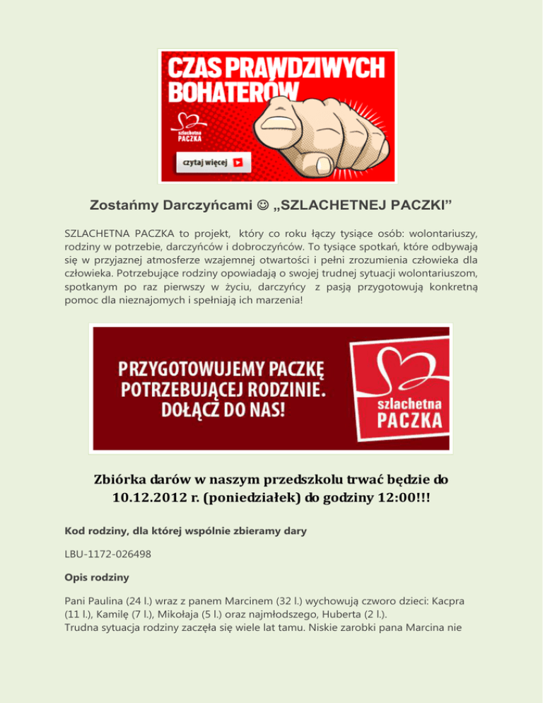 Zostańmy Darczyńcami „SZLACHETNEJ PACZKI” SZLACHETNA PACZKA to projekt, który co roku łączy tysiące osób: wolontariuszy, rodziny w potrzebie, darczyńców i dobroczyńców. To tysiące spotkań, które odbywają się w przyjaznej atmosferze wzajemnej otwartości i pełni zrozumienia człowieka dla człowieka. Potrzebujące rodziny opowiadają o swojej trudnej sytuacji wolontariuszom, spotkanym po raz pierwszy w życiu, darczyńcy z pasją przygotowują konkretną pomoc dla nieznajomych i spełniają ich marzenia! Zbiórka darów w naszym przedszkolu trwać będzie do 10.12.2012 r. (poniedziałek) do godziny 12:00!!! Kod rodziny, dla której wspólnie zbieramy dary LBU-1172-026498 Opis rodziny Pani Paulina (24 l.) wraz z panem Marcinem (32 l.) wychowują czworo dzieci: Kacpra (11 l.), Kamilę (7 l.), Mikołaja (5 l.) oraz najmłodszego, Huberta (2 l.). Trudna sytuacja rodziny zaczęła się wiele lat tamu. Niskie zarobki pana Marcina nie zaspokajają potrzeb sześcioosobowej rodziny. Pani Paulina nie może podjąć pracy ze względu na małe dziecko. Mikołaj cierpi na niedoczynność tarczycy. Lekarstwa i wyjazdy do specjalistów znacznie nadwyrężają i tak słaby dochód. Rodzina utrzymuje się z pensji pana Marcina (1000 zł) i zasiłków, które wynoszą łącznie 554 zł. Z tej kwoty choroba Mikołaja pochłania około 150 zł miesięcznie, a samo utrzymanie czwórki dzieci nie wiąże się z małymi kosztami. Dom składa się tylko z jednego pokoju i kuchni, więc rodzice wraz z czterema dziećmi śpią w jednym pokoju. Nie posiadają oni łazienki, a toaleta znajduje się na dworze. Łączny dochód rodziny w przeliczeniu na osobę wynosi 207 zł. Najważniejszą potrzebą rodziny jest pralka, ponieważ stara się zepsuła, a pani Paulina chciałaby, aby dzieci miały czyste i schludne ubrania. Pranie ręczne jest bardzo trudne przy tylu domownikach i małych dzieciach. Rodzina prosi także o żywność oraz odzież. Uwaga: dla zachowania anonimowości, imiona członków rodziny mogły zostać zmienione Potrzeby rodziny Żywność trwała: Podstawowe produkty żywnościowe: Kawa, Ryż, Makaron, Mąka, Cukier, Dżem, Konserwy mięsne, Konserwy rybne Środki czystości Potrzebne środki czystości: Proszek do prania, Płyny czyszczące, Płyn do mycia naczyń, Szampon, Mydło/żel myjący IV. ODZIEŻ I OBUWIE Odzież Lp Płeć Rodzaj (letnia / zimowa / przejściowa) 1 M przejściowe 2 K przejściowe/zimowe 3 M przejściowe Kategoria (bluzka, spodnie, Rozmiar Typ budowy 140/140 szczupły 130/130 szczupła 110/115 szczupły Uwagi kurtka itp.) Jakakolwiek odzież w tym rozmiarze Jakakolwiek odzież w tym rozmiarze Jakakolwiek odzież w tym rozmiarze nowe, bądź używane zadbane nowe, bądź używane zadbane nowe, bądź używane zadbane Obuwie Rodzaj (letnie / Lp Płeć zimowe / przejściowe) 1 M zimowe/przejściowe 2 K zimowe/przejściowe 3 M zimowe/przejściowe Kategoria (klapki, tenisówki, kozaki Rozmiar Uwagi itp.) Jakakolwiek w tym rozmiarze Jakakolwiek w tym rozmiarze Jakakolwiek w tym rozmiarze 36/37 33/34 27/28 nie muszą być nowe, ale żeby były zadbane i niezniszczone nie muszą być nowe, ale żeby były zadbane i niezniszczone nie muszą być nowe, ale żeby były zadbane i niezniszczone Pomoce szkolne: Zeszyty, Bloki, Kredki, Farbki, Plastelina, Papier kolorowy, Nożyczki, Klej, Piórnik, Przybory do pisania Inne: Słowniki: ortograficzny i do języka angielskiego. Wyposażenie mieszkania: Ręczniki Brakujące sprzęty gospodarstwa domowego: Pralka, ponieważ stara przestała działać i pani Paulina pierze ręcznie, co przy tylu domownikach jest szczególnie trudne. Szczególne upominki: Kamila - lalki, Hubert - zabawki zwierzęta, Kacper - piłka nożna, Mikołaj - samochody zabawkowe, Marcin - kosmetyki męskie, Paulina - kosmetyki damskie. Najważniejsze potrzeby: Pralka, żywność i ubrania.