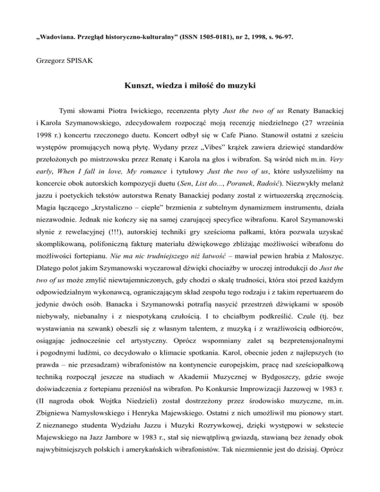 „Wadoviana. Przegląd historyczno-kulturalny” (ISSN 1505-0181), nr 2, 1998, s. 96-97. Grzegorz SPISAK Kunszt, wiedza i miłość do muzyki Tymi słowami Piotra Iwickiego, recenzenta płyty Just the two of us Renaty Banackiej i Karola Szymanowskiego, zdecydowałem rozpocząć moją recenzję niedzielnego (27 września 1998 r.) koncertu rzeczonego duetu. Koncert odbył się w Cafe Piano. Stanowił ostatni z sześciu występów promujących nową płytę. Wydany przez „Vibes” krążek zawiera dziewięć standardów przełożonych po mistrzowsku przez Renatę i Karola na głos i wibrafon. Są wśród nich m.in. Very early, When I fall in love, My romance i tytułowy Just the two of us, które usłyszeliśmy na koncercie obok autorskich kompozycji duetu (Sen, List do..., Poranek, Radość). Niezwykły melanż jazzu i poetyckich tekstów autorstwa Renaty Banackiej podany został z wirtuozerską zręcznością. Magia łączącego „krystaliczno – ciepłe” brzmienia z subtelnym dynamizmem instrumentu, działa niezawodnie. Jednak nie kończy się na samej czarującej specyfice wibrafonu. Karol Szymanowski słynie z rewelacyjnej (!!!), autorskiej techniki gry sześcioma pałkami, która pozwala uzyskać skomplikowaną, polifoniczną fakturę materiału dźwiękowego zbliżając możliwości wibrafonu do możliwości fortepianu. Nie ma nic trudniejszego niż łatwość – mawiał pewien hrabia z Małoszyc. Dlatego polot jakim Szymanowski wyczarował dźwięki chociażby w uroczej introdukcji do Just the two of us może zmylić niewtajemniczonych, gdy chodzi o skalę trudności, która stoi przed każdym odpowiedzialnym wykonawcą, ograniczającym skład zespołu tego rodzaju i z takim repertuarem do jedynie dwóch osób. Banacka i Szymanowski potrafią nasycić przestrzeń dźwiękami w sposób niebywały, niebanalny i z niespotykaną czułością. I to chciałbym podkreślić. Czule (tj. bez wystawiania na szwank) obeszli się z własnym talentem, z muzyką i z wrażliwością odbiorców, osiągając jednocześnie cel artystyczny. Oprócz wspomniany zalet są bezpretensjonalnymi i pogodnymi ludźmi, co decydowało o klimacie spotkania. Karol, obecnie jeden z najlepszych (to prawda – nie przesadzam) wibrafonistów na kontynencie europejskim, pracę nad sześciopałkową techniką rozpoczął jeszcze na studiach w Akademii Muzycznej w Bydgoszczy, gdzie swoje doświadczenia z fortepianu przeniósł na wibrafon. Po Konkursie Improwizacji Jazzowej w 1983 r. (II nagroda obok Wojtka Niedzieli) został dostrzeżony przez środowisko muzyczne, m.in. Zbigniewa Namysłowskiego i Henryka Majewskiego. Ostatni z nich umożliwił mu pionowy start. Z nieznanego studenta Wydziału Jazzu i Muzyki Rozrywkowej, dzięki występowi w sekstecie Majewskiego na Jazz Jambore w 1983 r., stał się niewątpliwą gwiazdą, stawianą bez żenady obok najwybitniejszych polskich i amerykańskich wibrafonistów. Tak niezmiennie jest do dzisiaj. Oprócz pracy z własnymi zespołami (Trio K. Szymanowskiego – ze Zbigniewem Wromblem na kontrabasie i Marcinem Jahrem, z którymi nagrał w 1995 r. płytę Sześćsił) jest rozchwytywanym muzykiem sesyjnym. Uczestniczył w nagrywaniu płyt m.in. Jana Ptaszyna Wróblewskiego, Raz Dwa Trzy, Starego Dobrego Małżeństwa. Znany jest jednak głównie ze współpracy z Osjanem, Arturem Dudkiewiczem, braćmi Niedzielami, Zbigniewem Jakubkiem i Marcinem Pospieszalskim (Still Another Sextet). Prowadził także intensywną działalność koncertową w kraju i zagranicą (Jazz nad Odrą, Jazz Jambore, New Meating Jazz w Baden Baden). To nie wszystko. Od 1988 r. wykłada na Międzynarodowych Warsztatach Perkusyjnych w Bydgoszczy (wylęgarni talentów perkusyjnych). Poza Polską prezentował swoją technikę na Praskich Dniach Perkusyjnych oraz na Europejskim Kongresie Perkusyjnym w Tubingen, a za miesiąc na podobnej imprezie w Paryżu. Prawdopodobnie pod wpływem Renaty(obdarzonej talentem i niezwykłym urokiem) absolwentki Akademii Muzycznej w Łodzi (wychowanej na dawnych mistrzach) w przyszłym roku zamierzają zrealizować płytę z angielską muzyką renesansową w transpozycji na wibrafon i głos. Szymanowski uwielbia eksperymentować. Oprócz jazzu i poezji śpiewanej z elementami muzyki klasycznej, pojawia się muzyka dawna. Wibrafon w jego rękach stał się instrumentem uniwersalnym i samodzielnym. W tym przypadku eksperyment nie oznacza wywarzania, często wcześniej otwartych drzwi, czy przysłowiowego „bicia głową w mur”. By eksperymentować potrzebne są najwidoczniej umiejętności, wiedza i kompetencja muzyczna, która chroni przed jałowym błądzeniem i pleniącym się (szczególnie na prowincji) banałem. Tak więc oprócz przyjemności wyniosłem z niedzielnego koncertu morał. Czego wszystkim, bywającym na spotkaniach muzycznych w naszym i okolicznych miastach, życzę.