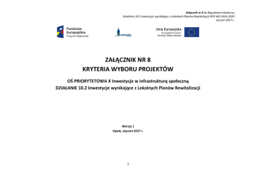 Załącznik nr 8 do Regulaminu Konkursu Działanie 10.2 Inwestycje wynikające z Lokalnych Planów Rewitalizacji RPO WO 2014-2020 styczeń 2017 r. ZAŁĄCZNIK NR 8 KRYTERIA WYBORU PROJEKTÓW OŚ PRIORYTETOWA X Inwestycje w infrastrukturę społeczną DZIAŁANIE 10.2 Inwestycje wynikające z Lokalnych Planów Rewitalizacji Wersja 1 Opole, styczeń 2017 r. 1 Załącznik nr 8 do Regulaminu Konkursu Działanie 10.2 Inwestycje wynikające z Lokalnych Planów Rewitalizacji RPO WO 2014-2020 styczeń 2017 r. KRYTERIA FORMALNE DLA WSZYSTKICH DZIAŁAŃ I PODDZIAŁAŃ RPO WO 2014-2020 2 Załącznik nr 8 do Regulaminu Konkursu Działanie 10.2 Inwestycje wynikające z Lokalnych Planów Rewitalizacji RPO WO 2014-2020 styczeń 2017 r. Kryteria formalne (TAK/NIE) LP Nazwa kryterium Źródło informacji Charakter kryterium W/B Definicja 1 2 3 4 5 Bezwzględny Typy potencjalnych beneficjentów określone w "Szczegółowym opisie osi priorytetowych RPO WO 2014-2020". Zgodnie z podpisanym oświadczeniem we wniosku Wnioskodawca oraz partnerzy (jeśli dotyczy) nie podlegają wykluczeniu z ubiegania się o dofinansowanie na podstawie: art. 207 ust. 4 ustawy z dnia 27 sierpnia 2009 r. o finansach publicznych, art. 12 ustawy z dnia 15 czerwca 2012 r. o skutkach powierzania wykonywania pracy cudzoziemcom przebywającym wbrew przepisom na terytorium Rzeczypospolitej Polskiej, art. 9 ustawy z dnia 28 października 2002 r. o odpowiedzialności podmiotów zbiorowych za czyny zabronione pod groźbą kary. Ponadto na podstawie podpisanego oświadczenia weryfikacji podlega, czy operacje wybrane do wsparcia nie obejmują kategorii wydatków stanowiących część operacji, które są lub powinny być objęte procedurą odzyskiwania w następstwie przeniesienia działalności produkcyjnej poza obszar objęty programem. Bezwzględny Typy dopuszczalnych projektów określone w "Szczegółowym opisie osi priorytetowych RPO WO 2014-2020", ogłoszeniu o naborze wniosków oraz regulaminie konkursu. Ponadto, projekty z zakresu Zrównoważonego transportu na rzecz mobilności mieszkańców, realizowane w trybie pozakonkursowym muszą wynikać z listy projektów 1. Wnioskodawca uprawniony do składania wniosku o dofinansowanie projektu 2. Typ projektu możliwy do realizacji w ramach działania / poddziałania, zakresu konkursu/ wynikający z wykazu projektów zidentyfikowanych (dot. Wniosek wraz z załącznikami Wniosek wraz z załącznikami 3 Załącznik nr 8 do Regulaminu Konkursu Działanie 10.2 Inwestycje wynikające z Lokalnych Planów Rewitalizacji RPO WO 2014-2020 styczeń 2017 r. Kryteria formalne (TAK/NIE) LP Nazwa kryterium 1 2 Źródło informacji Charakter kryterium W/B Definicja 3 4 5 1 3. 1 procedury pozakonkursowej) Projekt spełnia limity i ograniczenia w realizacji projektów (nie dotyczy warunków finansowych) Wniosek wraz z załącznikami 4. Wniosek wypełniony poprawnie, zgodnie z wymogami Instytucji Zarządzającej RPO WO 20142020 Wniosek o dofinansowanie 5. Załączniki do wniosku są poprawne, zgodnie z wymogami Instytucji Zarządzającej RPO WO 2014-2020 Załączniki do wniosku o dofinansowanie 6. Projekt spełnia warunki finansowe (m.in. wartość kwotowa i wysokość procentowa wnioskowanego dofinansowania; całkowita wartość projektu) Wniosek wraz z załącznikami Bezwzględny Bezwzględny Bezwzględny Bezwzględny Wybrać właściwe. 4 zawartej w Action Planie. Zgodnie z warunkami określonymi dla działania/poddziałania w „Szczegółowym opisie osi priorytetowych RPO WO 2014-2020”, w ogłoszeniu o konkursie oraz regulaminie konkursu na poziomie oceny formalnej. Zgodnie z ”Instrukcją wypełniania wniosku o dofinansowanie projektu ze środków Europejskiego Funduszu Rozwoju Regionalnego w ramach RPO WO 2014-2020”, treścią ogłoszenia o naborze wniosków oraz regulaminem konkursu. Zgodnie z „Instrukcją wypełniania załączników do wniosku o dofinansowanie projektu ze środków Europejskiego Funduszu Rozwoju Regionalnego w ramach RPO WO 2014-2020” , treścią ogłoszenia o naborze wniosków oraz regulaminem konkursu. Zgodnie z warunkami dla działania/poddziałania/typu projektu określonego w "Szczegółowym opisie osi priorytetowych RPO WO 20142020" oraz zasadami zamówień publicznych i zasadami udzielania pomocy publicznej (w tym de minimis). Wnioskowana intensywność pomocy publicznej jest zgodna z poziomem dozwolonym dla regionu*. Załącznik nr 8 do Regulaminu Konkursu Działanie 10.2 Inwestycje wynikające z Lokalnych Planów Rewitalizacji RPO WO 2014-2020 styczeń 2017 r. Kryteria formalne (TAK/NIE) LP Nazwa kryterium Źródło informacji Charakter kryterium W/B Definicja 1 2 3 4 5 7. 8. 9. 10. 11. Zabezpieczono źródła finansowania projektu Wnioskodawca wybrał wszystkie wskaźniki horyzontalne. Wnioskodawca określił wartość docelową większą od zera przynajmniej dla jednego wskaźnika w projekcie. Kryterium dot. projektów pozakonkursowych Do dofinansowania nie może zostać wybrany projekt, który został usunięty z wykazu projektów pozakonkursowych (stanowiącego załącznik do SZOOP) Projekt nie został zakończony przed złożeniem formularza Wniosek wraz z załącznikami Bezwzględny Sprawdza się, czy przedstawione dokumenty potwierdzają zabezpieczenie niezbędnych środków - zgodnie z instrukcjami Instytucji Zarządzającej. Analiza budżetu oraz załączników. W przypadku projektów złożonych (kilku partnerów, PPP, podmioty prywatne) możliwa jest ekspertyza. Wniosek o dofinansowanie Bezwzględny Wnioskodawca wybiera wszystkie wskaźniki horyzontalne. Dla wskaźników, których realizację zakłada w ramach projektu określa wartość docelową większą od zera. Dla pozostałych wpisuje zero. Wniosek o dofinansowanie Bezwzględny Wnioskodawca określa wartość docelową większą od zera przynajmniej dla jednego wskaźnika w projekcie. Wniosek o dofinansowanie Bezwzględny Zgodnie z Wytycznymi Ministra Infrastruktury i Rozwoju w zakresie trybów wy