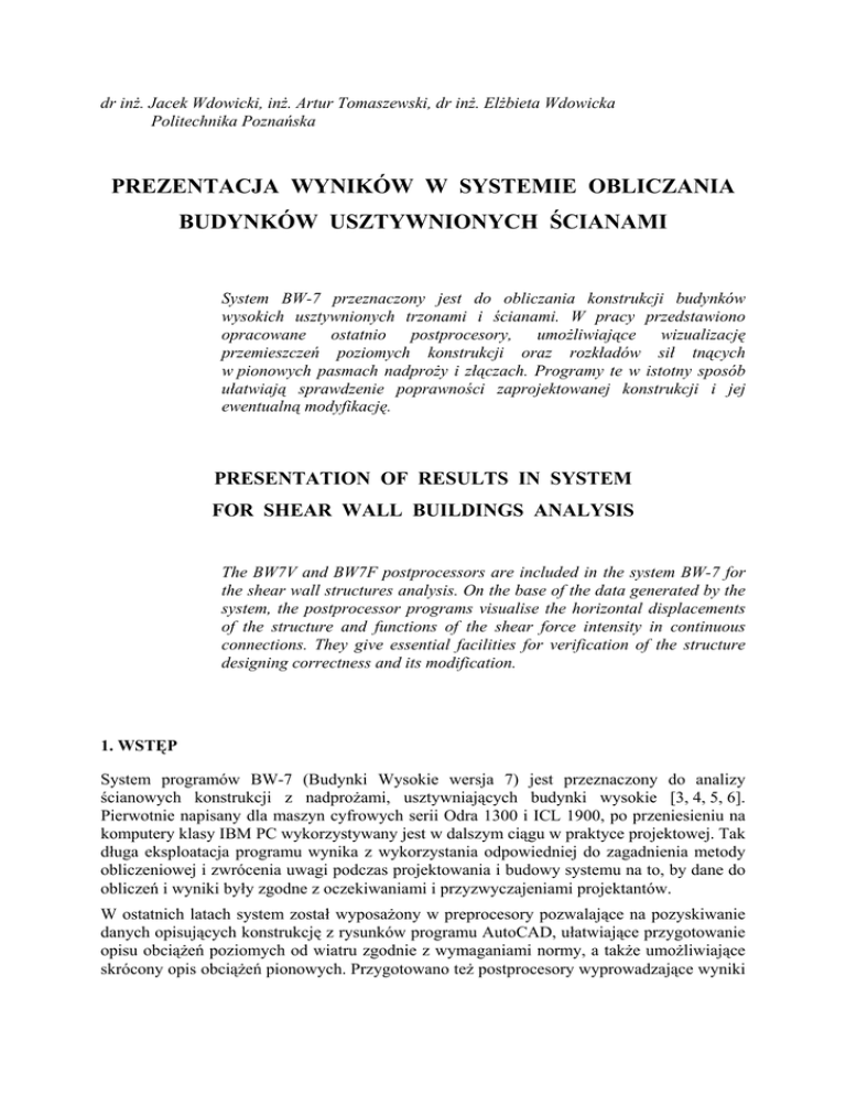 dr inŜ. Jacek Wdowicki, inŜ. Artur Tomaszewski, dr inŜ. ElŜbieta Wdowicka Politechnika Poznańska PREZENTACJA WYNIKÓW W SYSTEMIE OBLICZANIA BUDYNKÓW USZTYWNIONYCH ŚCIANAMI System BW-7 przeznaczony jest do obliczania konstrukcji budynków wysokich usztywnionych trzonami i ścianami. W pracy przedstawiono opracowane ostatnio postprocesory, umoŜliwiające wizualizację przemieszczeń poziomych konstrukcji oraz rozkładów sił tnących w pionowych pasmach nadproŜy i złączach. Programy te w istotny sposób ułatwiają sprawdzenie poprawności zaprojektowanej konstrukcji i jej ewentualną modyfikację. PRESENTATION OF RESULTS IN SYSTEM FOR SHEAR WALL BUILDINGS ANALYSIS The BW7V and BW7F postprocessors are included in the system BW-7 for the shear wall structures analysis. On the base of the data generated by the system, the postprocessor programs visualise the horizontal displacements of the structure and functions of the shear force intensity in continuous connections. They give essential facilities for verification of the structure designing correctness and its modification. 1. WSTĘP System programów BW-7 (Budynki Wysokie wersja 7) jest przeznaczony do analizy ścianowych konstrukcji z nadproŜami, usztywniających budynki wysokie [3, 4, 5, 6]. Pierwotnie napisany dla maszyn cyfrowych serii Odra 1300 i ICL 1900, po przeniesieniu na komputery klasy IBM PC wykorzystywany jest w dalszym ciągu w praktyce projektowej. Tak długa eksploatacja programu wynika z wykorzystania odpowiedniej do zagadnienia metody obliczeniowej i zwrócenia uwagi podczas projektowania i budowy systemu na to, by dane do obliczeń i wyniki były zgodne z oczekiwaniami i przyzwyczajeniami projektantów. W ostatnich latach system został wyposaŜony w preprocesory pozwalające na pozyskiwanie danych opisujących konstrukcję z rysunków programu AutoCAD, ułatwiające przygotowanie opisu obciąŜeń poziomych od wiatru zgodnie z wymaganiami normy, a takŜe umoŜliwiające skrócony opis obciąŜeń pionowych. Przygotowano teŜ postprocesory wyprowadzające wyniki obliczeń w postaci graficznej. KaŜdy z wdroŜonych pre- i postprocesorów przyczyniał się do skrócenia cyklu projektowego. Pierwszym postprocesorem systemu był program BW7S wizualizujący rozkład napręŜeń w ścianach usztywniających budynku [7]. Zachęceni dobrym przyjęciem postprocesora BW7S przez środowisko projektantów przygotowaliśmy dwa kolejne postprocesory. Postprocesor BW7V na podstawie danych generowanych przez system wizualizuje w rzucie konstrukcji usztywniającej przemieszczenia ścian lub przemieszczenia ekstremalne wybranych punktów. Zadaniem postprocesora BW7F jest rysowanie dla danego układu usztywniającego wykresów przemieszczeń poziomych oraz sił tnących w pionowych pasmach nadproŜy i złączy. Dla kaŜdego z postprocesorów przygotowano zarówno dokumentację techniczną jak i podręcznik uŜytkownika. 2. ORGANIZACJA WSPÓŁPRACY PROGRAMÓW SYSTEMU Wszystkie programy systemu BW-7, w tym takŜe postprocesory graficzne, napisane są w języku Pascal [1, 2] . Dane wejściowe postprocesory czerpią wyłącznie z jednego pliku o rozszerzeniu *.d-r (dane i wyniki, ang. Data-Result), generowanego przez programy obliczeniowe systemu. Plik ten zawiera m.in.: liczbę punktów tworzących ściany konstrukcji i ich współrzędne (x, y), liczbę ścian i elementów, indeks przynaleŜności ściany do danego elementu, jednostkę długości oraz dane opisujące napręŜenia, wykorzystywane przez postprocesor BW7S, a takŜe: wartości rzędnych i wartości poszczególnych funkcji dla tych rzędnych, wykorzystywane przez postprocesory BW7V i BW7F. 3. EKRAN POSTPROCESORA BW7V Ekran postprocesora podzielony jest na kilka okien (rys. 1). Pierwsze dwa z nich, znajdujące się w górnej części ekranu, zawierają opis analizowanego obiektu (konstrukcji) oraz numer danych. PoniŜej znajduje się okno zawierające dane o minimalnym i maksymalnym przemieszczeniu w całej konstrukcji usztywniającej, czyli: wartość przemieszczenia oraz punkt, którego to przemieszczenie dotyczy. Są to dwie linie tekstu, kaŜda dla jednego z ekstremalnych przemieszczeń. W prawej części ekranu znajduje się podłuŜne okno zawierające: numer schematu / wariantu, wartość mnoŜnika, opis rodzaju przemieszczeń (mogą to być ciągi: „Vx max”, „Vx min”, „Vy max”, „Vy min”), wyświetlane dla przemieszczeń ekstremalnych, skalę przedstawiającą stosunek jednostek rzeczywistych do ekranowych, wartość rzędnej oraz legendę opisująca znaczenie linii, jakimi rysowane są poszczególne poziomy układu usztywniającego . Główną rolę odgrywa największe okno zatytułowane „Plik”. Okno to, w nagłówku którego wypisana jest nazwa pliku danych wejściowych, pokazuje rzut całej konstrukcji usztywniającej: konstrukcję nieodkształconą (pogrubiona linia przerywana), odkształconą (pogrubiona linia ciągła) i poziomy pośrednie (linia przerywana pojedynczej grubości). W prawym dolnym rogu ekranu znajduje się menu, zapewniające wygodną interakcję z uŜytkownikiem. 4. MENU POSTPROCESORA BW7V Menu postprocesora usytuowane jest w prawym dolnym naroŜniku ekranu i składa się z następujących opcji: „plik”, „schem./war.”, „przemieszczenie”, „rzędna”, „poziomy”, „mnoŜnik”, „osie układu”, „tło”. Aby wybrać którąś z nich naleŜy posłuŜyć się tzw. „klawiszami kursora”: „w górę” [↑] i „w dół” [↓] lub klawiszem „tabulacji” TAB. Opcja aktualnie wybrana podświetlona jest Ŝółtym kolorem. Znaczenie i sposób wykorzystania wszystkich opcji programu opisane są poniŜej: Rys. 1 Ekran postprocesora BW7V • Opcja „plik” Opcja ta umoŜliwia zmianę danych wejściowych w trakcie działania programu. Po naciśnięciu klawisza ENTER (gdy podświetlony jest napis „plik” w menu), na środku ekranu pojawia się okno z nagłówkiem „Podaj numer danych”. UŜytk