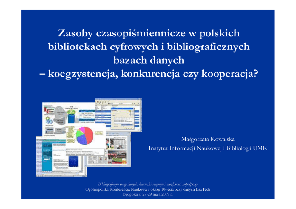 Zasoby czasopiśmiennicze w polskich bibliotekach cyfrowych i bibliograficznych bazach danych – koegzystencja, konkurencja czy kooperacja? Małgorzata Kowalska Instytut Informacji Naukowej i Bibliologii UMK Bibliograficzne bazy danych: kierunki rozwoju i moŜliwości współpracy Ogólnopolska Konferencja Naukowa z okazji 10-lecia bazy danych BazTech Bydgoszcz, 27-29 maja 2009 r. Plan referatu • Baza danych, biblioteka cyfrowa – natura zasobów, • Zawartość polskich bibliotek cyfrowych, • Zawartość polskich baz danych, • Bazy danych w bibliotekach cyfrowych vs. biblioteki cyfrowe w bazach danych? Bibliograficzne bazy danych: kierunki rozwoju i moŜliwości współpracy Ogólnopolska Konferencja Naukowa z okazji 10-lecia bazy danych BazTech Bydgoszcz, 27-29 maja 2009 r. Komunikacja naukowa • komunikacja informacja • B. Sordylowa, Informacja i komunikacja naukowa. Pojęcia i wzajemne relacje, Zagadnienia Naukoznawstwa 1999, nr 1, s. 35-41: – proces obejmujący wytwarzanie, rozpowszechnianie i wykorzystanie informacji od momentu sprecyzowania przez naukowca kierunku swoich badań do czasu ich publicznego rozpowszechnienia, – dyscyplina naukowa badająca prawidłowości rządzące procesami komunikacyjnymi w sferze nauki, – infrastruktura, na którą składa się ogół środków i metod umoŜliwiających bezpośrednie przekazywanie informacji (placówki informacyjne, publikacje naukowe, bazy danych, rozproszone zasoby obliczeniowe, wirtualne laboratoria i repozytoria cyfrowe): • apele o wolną naukę w trybie on-line, • pytania o sens powstawania nowych inicjatyw cyfrowych i dublowania prac. Bibliograficzne bazy danych: kierunki rozwoju i moŜliwości współpracy Ogólnopolska Konferencja Naukowa z okazji 10-lecia bazy danych BazTech Bydgoszcz, 27-29 maja 2009 r. Bazy danych, biblioteki cyfrowe – natura zasobów Własności Baza danych Biblioteka cyfrowa Wybrane definicje • zbiór wzajemnie powiązanych danych opisujących pewien wybrany fragment rzeczywistości, wyposaŜony w oprogramowanie umoŜliwiające ich definiowanie, wykorzystywanie i modyfikowanie, • uporządkowany zbiór informacji (opisowych i content units) z określonej dziedziny lub tematyki, ze wspólnym interfejsem uŜytkownika i oprogramowaniem przeznaczonym do wyszukiwania i przetwarzania danych. • zasoby przeszukiwalne za pomocą techniki komputerowej, • zasoby udostępniane lokalnie i zdalnie, • punkt dostępu do wielu źródeł informacji naukowej wraz z usługami instruktaŜowymi, • kolekcja materiałów zdygitalizowanych lub kodowanych cyfrowo, • archiwum cyfrowe, • repozytorium wiedzy, • baza danych chroniona prawem sui generis. Cechy charakterystyczne • trwałość danych, • rozmiar danych, • złoŜoność danych, • zarządzanie danymi, • archiwizacja danych, • udostępnianie danych. • trwałość danych, • rozmiar danych, • złoŜoność danych, • cyfrowe gromadzenie, opracowanie, udostępnianie, • architektura silnie rozproszona, • otwarty standard komunikacji, • skoordynowane zarządzanie zasobami, • wykorzystanie usług wspólnych - sieciowy profil uŜytkownika. Bibliograficzne bazy danych: kierunki rozwoju i moŜliwości współpracy Ogólnopolska Konferencja Naukowa z okazji 10-lecia bazy danych BazTech Bydgoszcz, 27-29 maja 2009 r. Bazy danych, biblioteki cyfrowe – natura zasobów (2) Własności Wymagania / funkcje Typologia Baza danych Biblioteka cyfrowa • gwarantowanie spójności danych, • zapewnienie bezpieczeństwa i autentyczności danych, • zapewnienie efektywnego przetwarzania danych, • właściwe odzwierciedlanie obiektów i zaleŜności między nimi, • ochrona przed nieautoryzowanym dostępem do danych, • przestrzeganie prawa autorskiego, • zapewnianie jednoczesnego dostępu do danych wielu uŜytkownikom, • zapewnianie dostępu do źródeł informacji kwalifikowanej, • udostępnianie metadanych, • zachowywanie standardów międzynarodowych, • zapewnianie trwałości organizacyjnej i finansowej. jak w przypadku baz danych + • zapewnianie moŜliwości wyszukiwania rozproszonego przeszukiwanie zawartości róŜnych bibliotek cyfrowych przy pomocy jednego narzędzia, • zapewnianie moŜliwości przeszukiwania pełnotekstowego publikacji, • wspieranie procesu e-learningu, • przełamywanie barier dotyczących „cyfrowego wykluczenia”, • promowanie kultury narodowej, • wspieranie rozwoju infrastruktury społeczeństwa informacyjnego. Ze wzg. na: • rodzaj gromadzonej inf. np. bibliograficzne i faktograficzne, • rodzaj denotacji utrwalonych danych np. faktograficzne, źródłowe, odsyłające, • zakres tematyczny np. jedno- i wielodziedzinowe, • podstawę znakowania np. alfanumeryczne, numeryczne, tekstowe, ikonograficzne, • organizację danych np. logiczne, fizyczne, • przyjęty model danych np. hierarchiczne, sieciowe, relacyjne, • zakres realizacji funkcji wyszukiwawczej w CHW np. pełnotekstowe, • przeznaczenie np. informatorowe, adresowe, programowe. Ze wzg. na: • podmiot nadzorujący np. instytucjonalne, konsorcjalne, pojedyncze, współpracujące, scalone, • zastosowane technologie np. I, II i III generacji, • typ gromadzonych materiałów np. dziedzictwa narodowego, interdyscyplinarne, regionalne. Bibliograficzne bazy danych: kierunki rozwoju i moŜliwości współpracy Ogólnopolska Konferencja Naukowa z okazji 10-lecia bazy danych BazTech Bydgoszcz, 27-29 maja 2009 r. Bazy danych, biblioteki cyfrowe – natura zasobów (3) • Elementy róŜnicujące: – gromadzenie i selekcja materiałów, – rozproszenie zasobów, – moŜliwości wyszukiwawcze, – sposób dostępu, – zróŜnicowanie treści, – poziom sformalizowania. Bibliograficzne bazy danych: kierunki rozwoju i moŜliwości współpracy Ogólnopolska Konferencja Naukowa z okazji 10-lecia bazy danych BazTech Bydgoszcz, 27-29 maja 2009 r. Zawartość polskich bibliotek cyfrowych • ponad 252 tys. ob