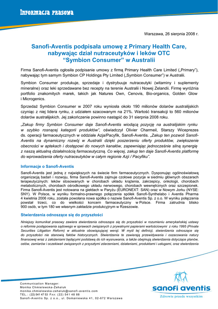 Informacja prasowa Warszawa, 26 sierpnia 2008 r. Sanofi-Aventis podpisała umowę z Primary Health Care, nabywając dział nutraceutyków i leków OTC “Symbion Consumer” w Australii Firma Sanofi-Aventis ogłosiła podpisanie umowy z firmą Primary Health Care Limited („Primary”), nabywając tym samym Symbion CP Holdings Pty Limited („Symbion Consumer”) w Australii. Symbion Consumer produkuje, sprzedaje i dystrybuuje nutraceutyki (witaminy i suplementy mineralne) oraz leki sprzedawane bez recepty na terenie Australii i Nowej Zelandii. Firmę wyróżnia portfolio znakomitych marek, takich jak Natures Own, Cenovis, Bio-organics, Golden Glow i Microgenics. Sprzedaż Symbion Consumer w 2007 roku wyniosła około 190 milionów dolarów australijskich czyniąc z niej lidera rynku, z udziałem szacowanym na 21%. Wartość transakcji to 560 milionów dolarów australijskich. Jej zakończenie powinno nastąpić do 31 sierpnia 2008 roku. „Zakup firmy Symbion Consumer daje Sanofi-Aventis wiodącą pozycję na australijskim rynku w szybko rosnącej kategorii produktów”, oświadczył Olivier Charmeil, Starszy Wiceprezes ds. operacji farmaceutycznych w oddziale Azja/Pacyfik, Sanofi-Aventis. „Zakup ten pozwoli SanofiAventis na dynamiczny rozwój w Australii dzięki poszerzeniu oferty produktów, zwiększenie obecności w aptekach i dostępowi do nowych kanałów, zapewniając jednocześnie silną synergię z naszą aktualną działalnością farmaceutyczną. Co więcej, zakup ten daje Sanofi-Aventis platformę do wprowadzenia oferty nutraceutyków w całym regionie Azji / Pacyfiku”. Informacje o Sanofi-Aventis Sanofi-Aventis jest jedną z największych na świecie firm farmaceutycznych. Dysponując ogólnoświatową organizacją badań i rozwoju, firma Sanofi-Aventis zajmuje czołowe pozycje w siedmiu głównych obszarach terapeutycznych: leków stosowanych w chorobach układu krążenia, zakrzepicy, onkologii, chorobach metabolicznych, chorobach ośrodkowego układu nerwowego, chorobach wewnętrznych oraz szczepionek. Firma Sanofi-Aventis jest notowana na giełdach w Paryżu (EURONEXT: SAN) oraz w Nowym Jorku (NYSE: SNY). W Polsce, w wyniku formalno-prawnego połączenia spółek Sanofi-Synthelabo i Aventis Pharma 4 kwietnia 2006 roku, została powołana nowa spółka o nazwie Sanofi-Aventis Sp. z o.o. W wyniku połączenia powstał trzeci, co do wielkości koncern farmaceutyczny w Polsce. Firma zatrudnia blisko 900 osób, w tym 180 we własnym zakładzie produkcyjnym w Rzeszowie. Stwierdzenia odnoszące się do przyszłości Niniejszy komunikat prasowy zawiera stwierdzenia odnoszące się do przyszłości w rozumieniu amerykańskiej ustawy o reformie postępowania sądowego w sprawach związanych z prywatnymi papierami wartościowymi z roku 1995 (Private Securities Litigation Reform) w aktualnie obowiązującej wersji. W myśl tej definicji, stwierdzenia odnoszące się do przyszłości nie stanowią faktów historycznych. Stwierdzenia te zawierają przewidywania i oszacowania natury finansowej wraz z założeniami będącymi podstawą do ich wysnuwania, a także obejmują stwierdzenia dotyczące planów, celów, zamiarów i oczekiwań związanych z przyszłymi zdarzeniami, działaniami, produktami i usługami, oraz stwierdzenia Communication Manager: Monika Chmielewska-Żehaluk [email protected] T E L . : ( 22) 541 47 53 F A X : ( 2 2 ) 5 4 1 4 8 8 8 Sanofi-Aventis Sp. z o.o., ul. Domaniewska 41, 02-672 Warszawa dotyczące przyszłych wyników. Stwierdzenia odnoszące się do przyszłości zazwyczaj zawierają czasowniki typu „spodziewać się”, „oczekiwać”, „uważać, że...”, „zamierzać”, „szacować”, „planować” i temu podobne. Mimo iż zarząd firmy Sanofi-Aventis jest przekonany o tym, że oczekiwania zwerbalizowane w owych stwierdzeniach odnoszących się do przyszłości są uzasadnione, inwestorzy powinni zdawać sobie sprawę z tego, że informacje i stwierdzenia odnoszące się do przyszłości uzależnione są od rozlicznych form ryzyka i niepewności, z których wiele nie daje się przewidzieć i z których wiele znajduje się poza kontrolą Sanofi-Aventis, oraz że owe formy ryzyka i niepewności mogą sprawić, że faktyczne wyniki i rozwój będą znacznie się różniły od tych, które podano, implikowano czy przewidywano w informacjach lub stwierdzeniach odnoszących się do przyszłości. Te czynniki ryzyka i niepewności obejmują między innymi niepewność nierozerwalnie związaną z badaniami naukowymi; przyszłymi danymi klinicznymi oraz analizami, w tym analizami po wprowadzeniu na rynek; decyzjami urzędów rejestracyjnych takich jak FDA czy EMEA dotyczącymi, tego czy i kiedy zatwierdzić dany lek, produkt lub jego zastosowanie biologiczne, które to decyzje dotyczące dowolnego produktu zgłoszonego do rejestracji wraz z decyzjami dotyczącymi oznakowań i innych aspektów mogą wpłynąć na dostępność lub powodzenie takiego produktu; nieudzieleniem gwarancji, że produkty zgłoszone do rejestracji, o ile zostaną zatwierdzone, odniosą sukces na rynku; przyznaniem innych zezwoleń i sukcesem rynkowym produktów alternatywnych; jak również kwestie omówione lub określone w publicznie dostępnej dokumentacji przedłożonej przez Sanofi-Aventis instytucjom SEC i AMF, w tym między innymi wymienione w rozdziałach „Czynniki ryzyka” i „Ostrzeżenia dotyczące stwierdzeń odnoszących się do przyszłości” w raporcie rocznym firmy Sanofi-Aventis na formularzu 20 F za rok zakończony 31 grudnia 2007 r. Firma Sanofi-Aventis nie przyjmuje żadnych zobowiązań uaktualniania lub korygowania jakichkolwiek stwierdzeń odnoszących się do przyszłości, chyba że jest to wymagane stosownymi przepisami prawnymi. 2 Communication Manager: Monika Chmielewska-Żehaluk [email protected] T E L . : ( 22) 541 47 53 F A X . : ( 2 2 ) 5 4 1 4 8 8 8 Sanofi-Aventis Sp. z o.o., ul. Domaniewska 41, 02-672 Warszawa