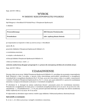 Sygn. akt III U 788/13 WYROK W IMIENIU RZECZYPOSPOLITEJ POLSKIEJ Dnia 24 czerwca 2014r. Sąd Okręgowy w Suwałkach III Wydział Pracy i Ubezpieczeń Społecznych w składzie: Przewodniczący: SSO Danuta Poniatowska Protokolant: sekr. sądowy Beata Dzienis po rozpoznaniu na rozprawie w dniu 24 czerwca 2014r. w Suwałkach sprawy K. A. przeciwko Zakładowi Ubezpieczeń Społecznych Oddział w O. o wcześniejszą emeryturę w związku z odwołaniem K. A. od decyzji Zakładu Ubezpieczeń Społecznych Oddział w O. z dnia 25 września 2013 r. znak (...) zmienia zaskarżoną decyzję i przyznaje K. A. prawo do emerytury od dnia 26 września 2013r. Sygn. akt III U 788/13 UZASADNIENIE Decyzją z dnia 25.09.2013r. Zakład Ubezpieczeń Społecznych Oddział w O., powołując się na przepisy rozporządzenia Rady Ministrów z dnia 7.02.1983r. w sprawie wieku emerytalnego pracowników zatrudnionych w szczególnych warunkach lub w szczególnym charakterze (Dz.U. Nr 8 poz. 43 ze zm.) oraz ustawy z dnia 17.12.1998r. o emeryturach i rentach z Funduszu Ubezpieczeń Społecznych (t.j. Dz. U. z 2013r. poz.1440) odmówił K. A. prawa do wcześniejszej emerytury z uwagi na niewykazanie 15 lat pracy w warunkach szczególnych. W odwołaniu K. A. domagał się zmiany zaskarżonej decyzji i przyznania prawa do wcześniejszej emerytury. Wnioskował o uwzględnienie do stażu pracy w warunkach szczególnych okresu od 01.02.1971r. do 30.06.1071r. dot. zatrudnienia (...) Przedsiębiorstwie (...) w B. przy pracach spawania łukowego i gazowego oraz okresu zasadniczej służby wojskowej od 27.04.1973r. do 01.05.1975r. W odpowiedzi na odwołanie organ rentowy wniósł o jego oddalenie. Podtrzymał podstawy skarżonej decyzji. Sąd ustalił, co następuje: K. A. (ur. (...)) w dniu 13.09.2013r. wystąpił z wnioskiem o emeryturę. Na dzień 01.01.1999r. udowodnił 27 lat 6 miesięcy 27 dni okresów składkowych. Do stażu pracy w warunkach szczególnych organ rentowy uwzględnił 12 lat 7 miesięcy 26 dni, zaliczając następujące okresy zatrudnienia : - od 01.07.1971r. do 26.04.1973r. i od 02.05.1975r. do 30.06.1977r. w (...) Przedsiębiorstwie (...) w B. na stanowisku montera instalacji sanitarnych i grzewczych (świadectwo pracy w warunkach szczególnych k. 8 akt ZUS); - od 01.07.1977r. do 28.02.1986r. w Przedsiębiorstwie (...) w E. na stanowisku montera instalacji sanitarnych i grzewczych (świadectwo pracy w warunkach szczególnych k. 11 akt ZUS). Od 01.09.1969r. odwołujący został zatrudniony w (...) Przedsiębiorstwie (...) jako robotnik młodociany w celu nauki zawodu w zawodzie monter wewnętrznych instalacji budowlanych. Naukę zawodu pobierał w (...) Szkole (...) (...). W pierwszym roku nauki zajęcia teoretyczne odbywały się przez 2 dni, natomiast przez 4 dni pracował, najczęściej przy wykopach. W drugim roku nauki zajęcia teoretyczne odbywały się do grudnia 1970r., natomiast od stycznia 1971r. zajęcia teoretyczne odbywały się tylko w niedziele. W pozostałe dni odwołujący pracował. Od 01.02.1971r. odbywał kurs spawalniczy – łukowy i gazowy. Do odbycia kursu zostali zakwalifikowani tylko najlepsi, w tym odwołujący. W trakcie jego trwania pracował stale i w pełnym wymiarze godzin pracy – 8 godzin – jako spawacz. Od 01.02. do 30.06.1971r. pracował jako spawacz przy spawaniu grzejników (książeczka spawalnicza koperta k. 19, umowa k. 42-44, legitymacja ubezpieczeniowa koperta k. 12 akt ZUS, zeznania odwołującego 03:50-10:40 k. 53 odwr.). Okres od 01.02.1971r. do 30.06.1971r. został uwzględniony w całości do stażu pracy w warunkach szczególnych. Po zakończeniu nauki i uzyskaniu uprawnień spawacza od 01.07.1971r. odorujący rozpoczął pracę w (...) Przedsiębiorstwie (...) w B., jako monter instalacji sanitarnych i grzewczych. Praca w tym zakładzie została częściowo uwzględniona przez organ rentowy do stażu pracy w warunkach szczególnych. Wyłączeniu przez ZUS podlegał okres odbywania zasadniczej służby wojskowej – od 27.04.1973r. do 12.04.1975r. Jak wynika z akt osobowych (koperta k. 25) oraz zeznań świadków Z. J. (04:50-10:14 k. 35 odwr.) i J. K. (10:30-14:00 k.35 odwr.), odwołujący przez cały okres zatrudnienia w (...) pracował jako spawacz, zatem przed jak i po powrocie z wojska wykonywał prace spawacza. Co więcej, z zaświadczenia (...) z dnia 31.08.2012r. (k. 9 akt ZUS) wynika, iż również w trakcie służby wojskowej – od 07.07.1973r. do 12.04.1975r. wykonywał prace na stanowisku spawacza. Służbę wojskową ukończył w dniu 12.04.1975r. i do (...) wrócił w dniu 02.05.1975r. na stanowisko montera instalacji sanitarnych i grzewczych. Okres odbywania zasadniczej służby wojskowej tj. od 27.04.1973r. do 01.05.1975r. został uwzględniony w całości do pracy w warunkach szczególnych. Sąd zważył, co następuje: Prawo do emerytury w obniżonym wieku zgodnie z treścią art. 184 ust.1 i 2 w zw. z art. 32 ust. 1 ustawy z dnia 17.12.1998r. o emeryturach i rentach z Funduszu Ubezpieczeń Społecznych (t.j. z 2009r. Dz.U. Nr 153, poz. 1227 ze zm.) przysługuje ubezpieczonym urodzonym - tak jak wnioskodawca – po 31.12.1948r., jeżeli pracowali w szczególnych warunkach lub w szczególnym charakterze, posiadają staż ubezpieczeniowy w wymiarze 25 lat (w przypadku mężczyzn), ukończyli 60 rok życia, nie przystąpili do otwartego funduszu emerytalnego albo złożyli wniosek o przekazanie środków zgromadzonych na rachunku w otwartym funduszu emerytalnym, za pośrednictwem Zakładu, na dochody budżetu państwa. Ilość lat pracy warunkach szczególnych oraz wymaganych okresów składkowych i nieskładkowych jest badana na dzień wejścia w życie ustawy o emeryturach i rentach z FUS, czyli 01.01.1999r. Zgodnie z dyspozycją art. 32 ust.2 ustawy o emeryturach i rentach z FUS za pracowników zatrudnionych w warunkach szczególnych uważa się osoby, które były zatrudnione przy pracach o znacznej szkodliwości dla zdrowia oraz o znacz