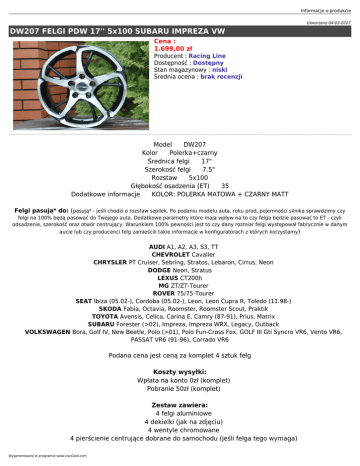 Informacje o produkcie Utworzono 04-03-2017 DW207 FELGI PDW 17'' 5x100 SUBARU IMPREZA VW Cena : 1.699,00 zł Producent : Racing Line Dostępność : Dostępny Stan magazynowy : niski Średnia ocena : brak recenzji Model DW207 Kolor Polerka+czarny Średnica felgi 17" Szerokość felgi 7.5" Rozstaw 5x100 Głębokość osadzenia (ET) 35 Dodatkowe informacje KOLOR: POLERKA MATOWA + CZARNY MATT Felgi pasują* do: (pasują* - jeśli chodzi o rozstaw szpilek. Po podaniu modelu auta, roku prod, pojemności silnika sprawdzimy czy felgi na 100% będą pasować do Twojego auta. Dodatkowe parametry które mają wpływ na to czy felga będzie pasować to ET - czyli odsadzenie, szerokość oraz otwór centrujący. Warunkiem 100% pewności jest to czy dany rozmiar felgi występował fabrycznie w danym aucie lub czy producenci felg zamieścili takie informacje w konfiguratorach z których korzystamy) AUDI A1, A2, A3, S3, TT CHEVROLET Cavalier CHRYSLER PT Cruiser, Sebring, Stratos, Lebaron, Cirrus, Neon DODGE Neon, Stratus LEXUS CT200h MG ZT/ZT-Tourer ROVER 75/75-Tourer SEAT Ibiza (05.02-), Cordoba (05.02-), Leon, Leon Cupra R, Toledo (11.98-) SKODA Fabia, Octavia, Roomster, Roomster Scout, Praktik TOYOTA Avensis, Celica, Carina E, Camry (87-91), Prius, Matrix SUBARU Forester (>02), Impreza, Impreza WRX, Legacy, Outback VOLKSWAGEN Bora, Golf IV, New Beetle, Polo (>01), Polo Fun-Cross Fox, GOLF III Gti Syncro VR6, Vento VR6, PASSAT VR6 (91-96), Corrado VR6 Podana cena jest ceną za komplet 4 sztuk felg Koszty wysyłki: Wpłata na konto 0zł (komplet) Pobranie 50zł (komplet) Zestaw zawiera: 4 felgi aluminiowe 4 dekielki (jak na zdjęciu) 4 wentyle chromowane 4 pierścienie centrujące dobrane do samochodu (jeśli felga tego wymaga) Wygenerowano w programie www.oscGold.com Zgodnie z Kodeksem PWP art.156 ust 3, emblematy widoczne na felgach mają charakter wyłącznie informacyjny i nie należy się tym sugerować, że jest to produkt oryginalny danego producenta samochodu. Alufelgi dobieramy wg parametrów katalogowych producentów. W przypadku niektórych modeli aut lub felg zachodzi konieczność zastosowania dystansów, śrub/nakrętek ampułkowych. Ponieważ, zawsze może zajść taka sytuacja w której katalog/konfigurator wprowadzi w błąd sprzedawcę zaleca się przed montarzem opon przyłożyć felgę na piastę i sprawdzić czy felga nigdzie nie będzie obcierać. Po założeniu opon zwrot felg będzie nie możliwy.