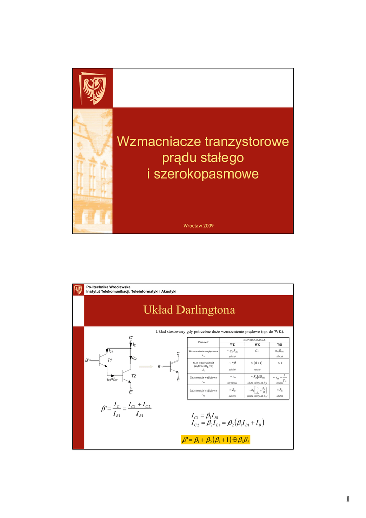 Wzmacniacze tranzystorowe prądu stałego i szerokopasmowe Wrocław 2009 Politechnika Wrocławska Instytut Telekomunikacji, Teleinformatyki i Akustyki Układ Darlingtona Układ stosowany gdy potrzebne duże wzmocnienie prądowe (np. do WK). C’ IC IC1 B’ C’ IC2 T1 B’ IE1=IB2 T2 E’ E’ β '= I C I C1 + I C 2 = I B1 I B1 I C1 = β1 I B1 I C 2 = β 2 I E1 = β 2 (β1 I B1 + I B ) β ' = β1 + β 2 (β1 + 1) ≈ β1β 2 1 Politechnika Wrocławska Instytut Telekomunikacji, Teleinformatyki i Akustyki Układ Darlingtona C’ rwe = rbe1 + β1rbe 2 IC IC1 B’ IC2 T1 ponieważ: I C 2 ≈ β 2 I C1 rwe = 2rbe1 = 2 β ' T2 IE1=IB2 otrzymujemy E’ rwy = rce 2 ponieważ: rce1 = β rce 2 rce1 (1 + g m rbe 2 ) β2 rbe 2 = 1 β1 rbe1 zatem: ϕT IC = rce 2 2rce1 β2 otrzymujemy: rwy = rce 2 2rce2 = 2 rce 2 3 Politechnika Wrocławska Instytut Telekomunikacji, Teleinformatyki i Akustyki Układ Darlingtona C’ IC C’ IC1 B’ Typowe układy Darlingtona mają górną częstotliwość graniczną rzędu 10...50kHz zastosowanie ich zatem do: ............................................... IC2 T1 B’ IE1=IB2 R T2 E’ Układ Darlingtona jest też stosunkowo „wolny” – aby przyspieszyć proces wyłączenia (zwiększyć szybkość usuwania nośników z bazy T2) stosuje się ................. jednak zimniejsza to .......................... E’ 2 Politechnika Wrocławska Instytut Telekomunikacji, Teleinformatyki i Akustyki Układ Darlingtona (Sziklai) Układ Darlingtona z przeciwstawnych tranzystorów. E’ Gdy T1 jest p-n-p to cały układ zachowuje się jak układ p-n-p, T2 wzmacnia prąd (T1 –WE, T2 – WK). B’ T1 β ' ≈ β1 β 2 T2 U B 'E ' ≈ 0,6V rwe = rbe1 = β ' C’ rwy = ϕT IC 1 rce2 2 Politechnika Wrocławska Instytut Telekomunikacji, Teleinformatyki i Akustyki Układ kaskody – wprowadzenie WE - efekt Millera i1 ib WE RB1 ic Y gbe RB2 i2 C If ube u1 RG cbc X B WY uce u2 gce cbe il RL RC gmube EG ~ E i1 E ib WE Y ic RB1 i2 C ube u1 RG X B uce gbe RB2 cbe CX CY gce WY il u2 RC RL gmube EG ~ E cwe = cbe + C X = cbe + cbc (1 − ku ) E fg = 1 2 ⋅ π ⋅ cwe ⋅ rwe RG 3 Politechnika Wrocławska Instytut Telekomunikacji, Teleinformatyki i Akustyki Układ kaskody – wprowadzenie Układ WB i1 RG ie WE ueb u1 i2 C E ucb geb RE cbe αie cbc WY il u2 RC RL EG ~ B rwe ≈ reb = B 1 gm Politechnika Wrocławska Instytut Telekomunikacji, Teleinformatyki i Akustyki Układ kaskody WE–WB schemat ideowy schemat zmiennoprądowy T1 pracuje w konfiguracji .................. T2 pracuje w konfiguracji .................. ze sterowaniem prądowym kuT1 = − g m Robc = − g m 1 = −1 gm wyeliminowany efekt Millera dla WE cwe = cbe + C X = cbe + cbc (1 − ku ) = cbe + cbc (2) 4 Politechnika Wrocławska Instytut Telekomunikacji, Teleinformatyki i Akustyki Układ kaskody WE–WB schemat ideowy schemat zmiennoprądowy Przez oba tranzystory płynie w przybliżeniu ten sam IC zatem: kuT1T2 = − g m RC a f gr ≈ fT ponadto: rwy = RC rwe = rbeT 1 Politechnika Wrocławska Instytut Telekomunikacji, Teleinformatyki i Akustyki Układ WK–WB +UCC RC WY T1 pracuje w konfiguracji .................. T2 pracuje w konfiguracji .................. ze sterowaniem napięciowym WE RE -UCC rwyT1 = 1 g mT 1 rweT2 = 1 g mT 2 oba tranzystory pracują przy tym samym IC zatem mają takie same gm dlatego: rwyT1 = rweT 2 5 Politechnika Wrocławska Instytut Telekomunikacji, Teleinformatyki i Akustyki Układ WK–WB +UCC Zatem na ET2 występuje połowa zmiennego napięcia wejściowego i otrzymujemy: RC WY Gm = WE IC 2 IC 2 1 = = − gm U we − 2U be2 2 a wzmocnienie napięciowe jest równe: 1 ku = Gm RC 2 RE -UCC rwe = 2rbe rwy ≈ RC Politechnika Wrocławska Instytut Telekomunikacji, Teleinformatyki i Akustyki Układ WK–WB Wzmacniacz w konfiguracji WK ma dużo większą częstotliwość graniczną w porównaniu do układu WE. Dlatego układ charakteryzuje się bardzo dobrymi właściwościami częstotliwościowymi (porównywalnie z kaskodą). Wzmocnienie napięciowe zapewnia stopień WB. Lecz jest ono mniejsze niż dla kaskody. Zaletą układu jest kompensacja zmian temperaturowych napięcia UBE (ograniczony wpływ temperatury) tranzystorów co nie występuje w kaskodzie. Takie rozwiązanie układowe jest stosowane w technice scalonej. 6 Politechnika Wrocławska Instytut Telekomunikacji, Teleinformatyki i Akustyki Wzmacniacze prądu stałego W.p.s. są to symetryczne wzmacniacze dolnoprzepustowe o dwóch wejściach i jednym (wzmacniacz operacyjny) lub dwóch (wzmacniacz różnicowy) wyjściach, służące do wzmacniania sygnałów o określonym paśmie częstotliwości włączając w to sygnały wolnozmienne i stałoprądowe. Do sprzęgania kolejnych stopni oraz wejścia i wyjścia wzmacniacza nie stosuje się ......................................................................... Wzmacniacze te zapewniają wzmocnienie sygnałów użytecznych (różnicowych) oraz tłumienie sygnałów niepożądanych (np. wejściowych sumacyjnych). Na wej i wyj napięcie DC = 0. Sygnały niepożądane mogą powstawać we wszystkich stopniach wzmacniacza, jednak największe ma znaczenie ma dryft stopnia wejściowego, który podlega największemu wzmocnieniu. Z tego względu stopnie te realizuje się jako wzm. różnicowe (ang. emitter-coupled pair). Politechnika Wrocławska Instytut Telekomunikacji, Teleinformatyki i Akustyki Wzmacniacze prądu stałego Wzmacniacz operacyjny we1 Wzmacniacz z wyjściem niesymetrycznym wy we2 Uwe1 Uwy Uwe2 Wzmacniacz różnicowy we1 wy1 we2 wy2 Uwy1 Uwe1 Uwe2 Uwy2 Wzmacniacz z wyjściem symetrycznym 7 Politechnika Wrocławska Instytut Telekomunikacji, Teleinformatyki i Akustyki Wzmacniacz różnicowy Można zdefiniować dwa rodzaje sygnałów: - różnicowe U wer = U we1 − U we 2 U wyr = U wy1 − U wy 2 - sumacyjne, zobrazowane na rys. U wes = U wys = U we1 + U we 2 2 U wy1 + U wy 2 2 Politechnika Wrocławska Instytut Telekomunikacji, Teleinformatyki i Akustyki Wzmacniacz różnicowy Wzmacniacz róż