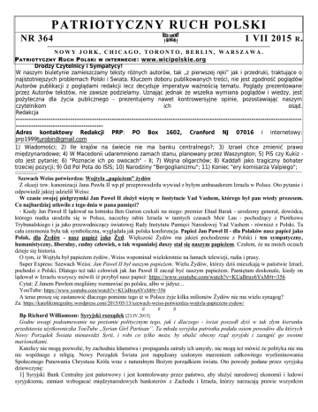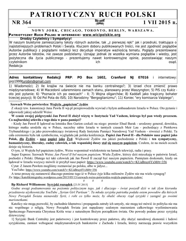 = PATRIOTYCZNY RUCH POLSKI NR 364 1 VII 2015 R . ----------------------------------------------------------------------------------------------------------------------------------------------------------------- NOWY JORK, CHICAGO, TORONTO, BERLIN, WARSZAWA. P ATRIOTYCZNY R UCH P OLSKI W INTERNECIE : www.wicipolskie.org Drodzy Czytelnicy i Sympatycy! W naszym biuletynie zamieszczamy teksty różnych autorów, tak „z pierwszej ręki” jak i przedruki, traktujące o najistotniejszych problemach Polski i Świata. Kluczem doboru publikowanych treści, nie jest zgodność poglądów Autorów publikacji z poglądami redakcji lecz decyduje imperatyw ważnością tematu. Poglądy prezentowane przez Autorów tekstów, nie zawsze podzielamy. Uznając jednak że wszelka wymiana poglądów i wiedzy, jest pożyteczna dla życia publicznego - prezentujemy nawet kontrowersyjne opinie, pozostawiając naszym czytelnikom ich osąd. Redakcja -------------------------------------------------------------------------------------------------------------------------------------------------------------------------Adres kontaktowy Redakcji PRP: PO Box 1602, Cranford NJ 07016 i internetowy: [email protected] 1) Wiadomości; 2) Ile krajów na świecie nie ma banku centralnego?; 3) Izrael chce zmienić prawo międzynarodowe; 4) W Macedonii udaremniono zamach stanu, planowany przez Waszyngton; 5) PiS czy Kukiz oto jest pytanie; 6) "Poznacie ich po owocach" - II; 7) Wojna oligarchów; 8) Kaddafi jako tragiczny bohater trzeciej pozycji; 9) Od Pol Pota do ISIS; 10) Narodziny "Bergoglianizmu"; 11) Koniec "ery komisarza Valpiego"; --------------------------------------------------------------------------------------------------------------------------------------------------------------------------------------------------------------------------------------------------------------------------------------------------------------------------------------------------------------------------------------------------------------- Szewach Weiss potwierdza: Wojtyła „papieżem” żydów Z okazji tzw. kanonizacji Jana Pawła II wp.pl przeprowadziła wywiad z byłym ambasadorem Izraela w Polsce. Oto pytanie i odpowiedź jakiej udzielił Weiss: W czasie swojej pielgrzymki Jan Paweł II złożył wizytę w Instytucie Yad Vashem, którego był pan wtedy prezesem. Co najbardziej utkwiło z tego dnia w pana pamięci? - Kiedy Jan Paweł II lądował na lotnisku Ben Gurion czekali na niego: premier Ehud Barak - urodzony generał, dowódca, którego matka urodziła się w Polsce, naczelny rabin Izraela w tamtych czasach Meir Lau - pochodzący z Piotrkowa Trybunalskiego i ja jako przewodniczący światowej Rady Instytutu Pamięci Narodowej Yad Vashem - również z Polski. Ta cała ceremonia była tak symboliczna, wyglądała jak polska konferencja. Papież Jan Paweł II - dla Polaków nasz papież jako Polak, dla Żydów - nasz papież jako Żyd. Większość Żydów ma jakieś pochodzenie z Polski i ten sympatyczny, humanistyczny, liberalny, cudny człowiek, o tak wspaniałej duszy stał się naszym papieżem. Czułem, że na moich oczach dzieje się historia. O tym, iż Wojtyła był papieżem żydów, Weiss wspominał wielokrotnie na łamach telewizji, radia i prasy. Super Express: Szewach Weiss: Jan Paweł II był naszym papieżem. Wielu Żydów, którzy dziś mieszkają w państwie Izrael, pochodzi z Polski. Dlatego też taki człowiek jak Jan Paweł II zaczął być naszym papieżem. Pamiętam doskonale, kiedy on lądował w Izraelu wszyscy mówili iż przybył nasz papież: https://www.youtube.com/watch?v=KUaBruy6YxM#t=356 Cytat: Z Janem Pawłem mogliśmy rozmawiać po polsku, albo w jidysz... YouTube: https://www.youtube.com/watch?v=KUaBruy6YxM#t=356 A teraz proszę się zastanowić dlaczego pomimo tego iż w Polsce żyje kilka milionów Żydów nie ma wielu synagog? Za: https://katolikintegralny.wordpress.com/2015/05/13/szewach-weiss-potwierdza-wojtyla-papiezem-zydow/ # # # Bp Richard Williamson: Syryjski rozsądek [23.IV.2015] Godne uwagi podsumowanie na poziomie politycznym tego, jak i dlaczego - świat poszedł dziś w tak złym kierunku przedstawia użytkowniczka YouTube „Syrian Girl Partisan”. Ta młoda syryjska patriotka podała osiem powodów dla których Nowy Porządek Świata nienawidzi Syrii, i robi co tylko może, by obalić obecny rząd syryjski i zastąpić go swoimi marionetkami. Katolicy nie mogą pozwolić, by zachodnie kłamstwa i propaganda zatruły ich umysły, nie mogą też mówić że polityka nie ma nic wspólnego z religią. Nowy Porządek Świata jest napędzany szalonym marzeniem całkowitego wyeliminowania Społecznego Panowania Chrystusa Króla wraz z naturalnym Bożym porządkiem świata. Oto powody podane przez syryjską dziewczynę: 1] Syryjski Bank Centralny jest państwowy i jest kontrolowany przez państwo, aby służyć narodowej ekonomii i ludowi syryjskiemu, zamiast wzbogacać międzynarodowych banksterów z Zachodu i Izraela, którzy narzucają prawie wszystkim narodom świata lichwiarskie pożyczki, generujące sztuczne kryzysy zadłużeniowe, przez które te narody są w istocie zniewolone. 2] Syria nie ma długów w Międzynarodowym Funduszu Walutowym. MFW pełni funkcję policji windykacyjnej międzynarodowych banksterów. Każdy suwerenny i mądry naród stoi z dala od szponów MFW, tak jak udało się to Syrii, ale banksterów taka mądrość wcale nie zadowala. 3] Syria, zabroniła genetycznie modyfikowanych nasion, inaczej „Frankenfood”, ponieważ Baszar Assad chce chronić zdrowie swoich obywateli. „Frankenfood” oznacza kontrolę żywności, która oznacza kontrolę populacji. Oczywiście Nowy Porządek Świata faworyzuje GMO [USA, narzuciły je podbitemu Irakowi]. 4] Syryjska ludność jest dobrze poinformowana o Nowym Porządku Świata, którego dominacja nad światowymi marionetkowymi politykami, przez think-tanki i tajne stowarzyszenia, jest otwarcie dyskutowana w s