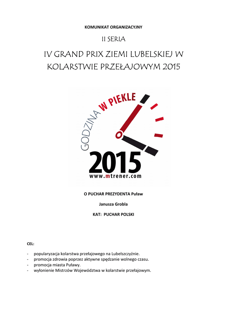KOMUNIKAT ORGANIZACYJNY II SERIA IV GRAND PRIX ZIEMI LUBELSKIEJ W KOLARSTWIE PRZEŁAJOWYM 2015 O PUCHAR PREZYDENTA Puław Janusza Grobla KAT: PUCHAR POLSKI CEL: - popularyzacja kolarstwa przełajowego na Lubelszczyźnie. promocja zdrowia poprzez aktywne spędzanie wolnego czasu. promocja miasta Puławy. wyłonienie Mistrzów Województwa w kolarstwie przełajowym. ORGANIZATOR: - MAYDAY TEAM. - Okręgowy Związek Kolarski w Lublinie. - MOSiR MARINA Puławy. - Fundacja Rozwoju Sportu w Lublinie. TERMIN I MIEJSCE: - wyścig odbędzie się w dniu 11.11.2015 (środa) w PUŁAWACH na trasie wyznaczonej przez organizatora wyścigu. Biuro wyścigu – MOSiR MARINA ul. Portowa 3, Puławy UCZESTNICWO: - prawo startu mają zawodniczki, zawodnicy posiadający ważne licencje na rok 2015r i aktualne badania lekarskie. W kategorii AMATOR i dzieci dopuszcza się start zawodników po podpisaniu oświadczenia przygotowanego przez organizatora. PROGRAM ZAWODÓW: Zapisy i trening na trasie do godz. 10.30! 10.30 – Zabawy Rowerowe dla dzieci Kategoria Żak chłopcy, dziewczęta 11.00– Kategoria Młodzik 11.01 - Kategoria Juniorka Młodsza, Młodziczka - Open 11.40 – Kategoria Junior Młodszy 11.41 Kategoria Masters II ( 40-49 lat) 11.41 Kategoria Masters III ( powyżej 50 lat) 12.30 – Kategoria Masters I, Cyclosport ( 30-39 lat), AMATOR 12.31 – Kategoria Elita Kobiet, Juniorka - Open 13.20 – I Dekoracja kategorii- Dzieci, Żak, Młodzik, Juniorka Młodsza, Młodziczka Junior Młodszy, Masters II, Masters III 13.30 – Kategoria Elita Mężczyzn, Orlik, Junior 14.30 - II Dekoracja kategorii – Masters I, Elita Kobiet Open, Juniorka, Elita Mężczyzn Open, Junior ZASADY FINASOWANIA: - koszty organizacyjne i nagród ponosi organizator koszty przejazdu i pobytu pokrywają jednostki delegujące startowe wg przepisów PZKol zawodnicy Masters 40zł, Amator bez licencj 50zł. 20min minimum 20min minimum 30min minimum 30min minimum 30min minimum 40min minimum 40min minimum 50min minimum Wyścig klasy Pucharu Polski (pula nagród 5500zł): ELITA MĘŻCZYZN: 1m 1200zł + Puchar, 2m 700zł, 3m 400zł, 4m 300zł, 5m 200zł, 6m 200zł, 7m 100zł, 8m 100zł (3200zł). KOBIETY OPEN: 1m250zł + Puchar, 2m 200zł, 3m 100zł, 4m 100zł, 5m 50zł. RAZEM (700zł przy udziale min 10 zawodniczek, w wypadku mniejszej ilości startujących zostaną przyznane nagrody za trzy pierwsze miejsca). JUNIOR: 1m 200zł + Puchar, 2m 100zł, 3m 100zł. RAZEM (400zł) JUNIORKA: 1m 150zł, 2m 100zł, 3m 50zł. (300zł przy udziale min 5 juniorek, w wypadku mniejszej ilości startujących zostanie przyznana jedna nagroda za pierwsze miejsce). JUNIOR MŁODSZY KOBIETY I MĘŻCZYŹNI: 1m Puchar + nagroda rzeczowa, 2-5m nagroda rzeczowa + dyplom. MŁODZIK DZIEWCZĘTA: 1-3m nagrody rzeczowe, CHŁOPCY: 1-5m nagrody rzeczowe + dyplomy. ŻAK DZIEWCZĘTA: I CHŁOPCY: 1-3m nagrody rzeczowe + dyplomy. MASTERS I, II, III: 1m 150zł, 2m 100zł, 3m 50zł. (900zł) AMATOR OPEN: 1-3m nagrody rzeczowe + dyplomy Na koniec cyklu, dla osób które wezmą udział we wszystkich seriach cyklu odbędzie się tombola. Nagrody przygotowała Firma SHIMANO. - W każdej edycji punktuje ośmiu zawodników w kategoriach: ELITA – Junior OPEN, JUNIOR MŁ., MŁODZIK, KOBIETY OPEN, JUNIORK MŁ. – MŁODZICZKA OPEN, MASTERS I CYCLOSPORT OPEN, MASTERS II III OPEN, AMATOR wg klucza: 1m - 15pkt., 2m - 12pkt., 3m - 10pkt., 4m - 8pkt., 5m - 6pkt., 6m - 4pkt., 7m - 3pkt., 8m - 2pkt., 9m - 1pkt., 10m - 1pkt. - Jeżeli wystartuje mniej niż dziesięciu zawodników w kategorii, przyznawana będzie połowa punktów. - Zwycięzcą Grand Prix Ziemi Lubelskiej w kolarstwie przełajowym „GODZINA W PIEKLE” zostaje zawodnik który zgromadzi w trzech edycjach największą ilość punktów . W przypadku takiej samej ilości punktów będzie brane pod uwagę wyższe miejsce w III finałowej edycji Grand Prix zaliczanej do klasyfikacji Pucharu Polski. POSTANOWIENIA KOŃCOWE: - każdy uczestnik wyścigu startuje na własną odpowiedzialność zawodnik/czka musi znać swój pesel co jest niezbędne do otrzymania nagrody w przeciwnym razie nagrody nie otrzyma. - organizator nie bierze odpowiedzialności za rzeczy zagubione i skradzione podczas trwania zawodów wszyscy zawodnicy powinni być ubezpieczeni przez macierzyste kluby organizator nie ponosi odpowiedzialności za wypadki powstałe w czasie zawodów organizator zapewnia opiekę medyczną skład komisji sędziowskiej zaproponuje organizator wspólnie z Komisja Przełajowa przy PZKol w sprawach sportowych nie objętych niniejszym regulaminem i przepisami PZKol decyduje organizator w porozumieniu z sędziom głównym. Regulamin zatwierdzono w dniu 23.09.2015r. LIDERZY KLASYFIKACJI MAJĄ OBOWIĄZEK STARTU W KOSZULKACH LIDERA!!! ZGŁOSZENIA: Zgłoszenia należy przesyłać na adres: [email protected] lub bezpośrednio w biurze w dniu zawodów. KOMUNIKATY ORGANIZACYJNE: Do każdej edycji Grand Prix Ziemi Lubelskiej w Kolarstwie Przełajowym ukaże się oddzielny komunikat organizacyjny. Po każdej edycji ukaże się komunikat z wynikami i klasyfikacją indywidualną dostępny na stronie internetowej: www.maydayteam.pl OSOBY ODPOWIEDZIALNE Z APRZEPROWADZENIE GRAND PRIX ZIEMI LUBELSKIEJ WKOLARSTWIE PRZEŁAJOWYM „GODZINA W PIEKLE”: Marcin Makowski Tel. 513701930