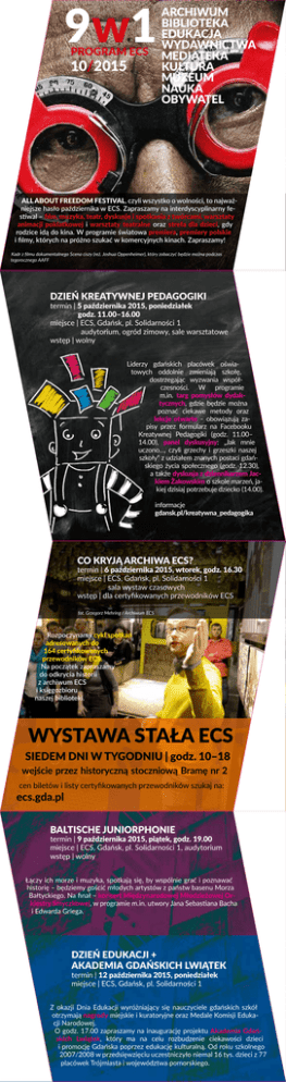 9w1 PROGRAM ECS 10/2015 ARCHIWUM BIBLIOTEKA EDUKACJA WYDAWNICTWA MEDIATEKA KULTURA MUZEUM NAUKA OBYWATEL ALL ABOUT FREEDOM FESTIVAL, czyli wszystko o wolności, to najważniejsze hasło października w ECS. Zapraszamy na interdyscyplinarny festiwal – film, muzyka, teatr, dyskusje i spotkania z twórcami, warsztaty animacji poklatkowej i warsztaty teatralne oraz strefa dla dzieci, gdy rodzice idą do kina. W programie światowa premiera, premiery polskie i filmy, których na próżno szukać w komercyjnych kinach. Zapraszamy! Kadr z filmu dokumentalnego Scena ciszy (reż. Joshua Oppenheimer), który zobaczyć będzie można podczas tegorocznego AAFF DZIEŃ KREATYWNEJ PEDAGOGIKI termin | 5 października 2015, poniedziałek godz. 11.00–16.00 miejsce | ECS, Gdańsk, pl. Solidarności 1 audytorium, ogród zimowy, sale warsztatowe wstęp | wolny Liderzy gdańskich placówek oświatowych oddolnie zmieniają szkołę, dostrzegając wyzwania współczesności. W programie m.in. targ pomysłów dydaktycznych, gdzie będzie można poznać ciekawe metody oraz lekcje otwarte ‒ obowiązują zapisy przez formularz na Facebooku Kreatywnej Pedagogiki (godz. 11.00– 14.00), panel dyskusyjny: „Jak mnie uczono…, czyli grzechy i grzeszki naszej szkoły” z udziałem znanych postaci gdańskiego życia społecznego (godz. 12.30), a także dyskusja z dziennikarzem Jackiem Żakowskim o szkole marzeń, jakiej dzisiaj potrzebuje dziecko (14.00). informacje gdansk.pl/kreatywna_pedagogika CO KRYJĄ ARCHIWA ECS? termin | 6 października 2015, wtorek, godz. 16.30 miejsce | ECS, Gdańsk, pl. Solidarności 1 sala wystaw czasowych wstęp | dla certyfikowanych przewodników ECS fot. Grzegorz Mehring / Archiwum ECS Rozpoczynamy cykl spotkań adresowanych do 164 certyfikowanych przewodników ECS. Na początek zapraszamy do odkrycia historii z archiwum ECS i księgozbioru naszej biblioteki. WYSTAWA STAŁA ECS SIEDEM DNI W TYGODNIU | godz. 10–18 wejście przez historyczną stoczniową Bramę nr 2 cen biletów i listy certyfikowanych przewodników szukaj na: ecs.gda.pl BALTISCHE JUNIORPHONIE termin | 9 października 2015, piątek, godz. 19.00 miejsce | ECS, Gdańsk, pl. Solidarności 1, audytorium wstęp | wolny Łączy ich morze i muzyka, spotkają się, by wspólnie grać i poznawać historię – będziemy gościć młodych artystów z państw basenu Morza Bałtyckiego. Na finał – koncert Międzynarodowej Młodzieżowej Orkiestry Smyczkowej, w programie m.in. utwory Jana Sebastiana Bacha i Edwarda Griega. DZIEŃ EDUKACJI + AKADEMIA GDAŃSKICH LWIĄTEK termin | 12 października 2015, poniedziałek miejsce | ECS, Gdańsk, pl. Solidarności 1 Z okazji Dnia Edukacji wyróżniający się nauczyciele gdańskich szkół otrzymają nagrody miejskie i kuratoryjne oraz Medale Komisji Edukacji Narodowej. O godz. 17.00 zapraszamy na inaugurację projektu Akademia Gdańskich Lwiątek, który ma na celu rozbudzenie ciekawości dzieci i promocję Gdańska poprzez edukację kulturalną. Od roku szkolnego 2007/2008 w przedsięwzięciu uczestniczyło niemal 16 tys. dzieci z 77 placówek Trójmiasta i województwa pomorskiego. termin | 16–24 października 2015 miejsce | ECS, Gdańsk, pl. Solidarności 1 wejście | bilety od 5 października w kasach ECS | kino i teatr: 10 zł, koncert: 20 zł, warsztaty: wstęp wolny (konieczna rejestracja) i PROMOCJA | przy jednoczesnym zakupie ponad 4 biletów do kina – 8 zł/szt. 17 filmów, w tym premiera światowa i premiery polskie, 7 debat po filmach i spotkań z twórcami, wykład mistrzowski, koncert i spektakl teatralny oraz nowość: warsztaty – animacji poklatkowej dla dzieci oraz teatralne dla młodzieży i dorosłych. Hasło ALL ABOUT FREEDOM FESTIVAL, czyli wszystko o wolności, znaczy więcej w tym roku niż w każdym poprzednim, bo Europie w obliczu masowej fali uchodźców przyszło się zmierzyć z wieloma trudnymi, nowymi pytaniami. To już 9 edycja AAFF, jednej z najbardziej znanych imprez realizowanych przez ECS. szczegóły | aaff.pl AAFF KIDS czyli RODZICE DO KINA a DZIECI DO ZABAWY dzieci | 5–9 lat → grupa 15-osobowa zbiórka | ogród zimowy ECS, przy szybie wind panoramicznych wstęp | bezpłatny, po okazaniu przez opiekuna biletu na seans rejestracja | e-mail: [email protected] AAFF KIDS to oferta dla rodzin, które chcą spędzić popołudnie w ECS – opiekunowie oglądają film w ramach festiwalu AAFF, a dzieci bezpiecznie spędzają czas pod okiem edukatorek. Obiecujemy, że dzieciaki nie będą się nudzić :) UWAGA! Decyduje kolejność zgłoszeń. W treści e-maila wskaż datę, godzinę i liczbę dzieci. DZIEŃ PAPIESKI W ECS termin | 16 października 2015, piątek, godz. 18.00 miejsce | ECS, Gdańsk, pl. Solidarności 1 zbiórka | hol główny, szukajcie dużego długopisu Lecha Wałęsy i przystojnego młodzieńca w kapeluszu na głowie wstęp | grupowy bilet ulgowy: 11 zł rezerwacja online | ecs.gda.pl Postać Jana Pawła II wielokrotnie pojawia się w opowieści wystawy stałej, bowiem ten pontyfikat przypadł na czas rosnącej w siłę polskiej opozycji i coraz bardziej stanowczego upominania się narodu o wolność. W 37 rocznicę wyboru kard. Karola Wojtyły na papieża zapraszamy na kuratorskie zwiedzanie wystawy. Przewodnikiem będzie Adam Cherek, historyk i archiwista z ECS, który brał udział w tworzeniu ekspozycji. Czy wiesz, że jest na wystawie ECS takie miejsce, gdzie cofamy czas do pamiętnej papieskiej mszy na Zaspie? Fot. Sławomir Fiebig / Zbiory ECS VI TYDZIEŃ OTWARTEJ NAUKI W POLSCE termin | 19–25 października 2015 miejsce | ECS, Gdańsk, pl. Solidarności 1 wstęp | wolny Open Access Week obchodzony jest na całym świecie przez uczelnie, instytuty badawcze, biblioteki i organizacje pozarządowe, które działają na rzecz otwartości w nauce oraz wolnego dostępu do zasobów naukowych. informacje | ecs.gda.pl BĘDZIEMY NA TARGACH KSIĄŻKI W KRAKOWIE termin | 22–25 października 2015, czwartek – niedziela miejsce | 
