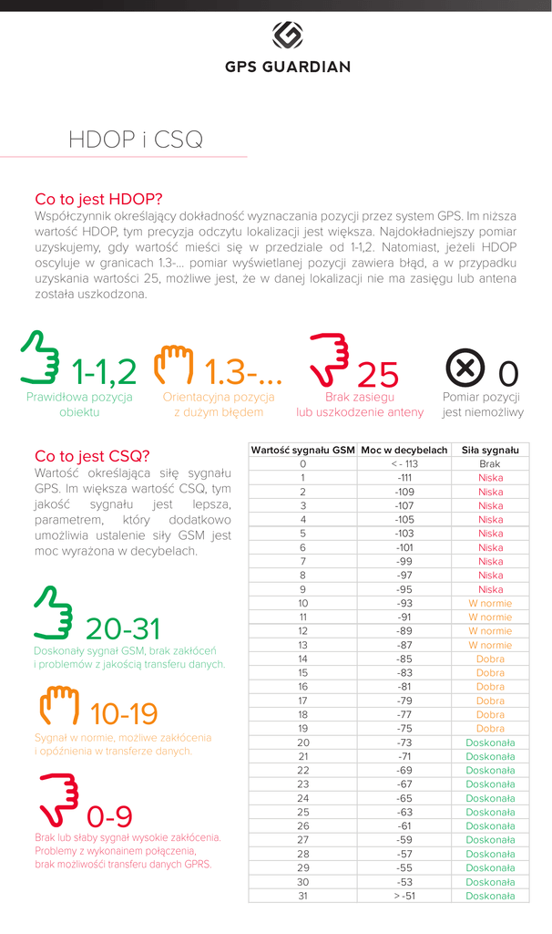 HDOP i CSQ Co to jest HDOP? Współczynnik określający dokładność wyznaczania pozycji przez system GPS. Im niższa wartość HDOP, tym precyzja odczytu lokalizacji jest większa. Najdokładniejszy pomiar uzyskujemy, gdy wartość mieści się w przedziale od 1-1,2. Natomiast, jeżeli HDOP oscyluje w granicach 1.3-... pomiar wyświetlanej pozycji zawiera błąd, a w przypadku uzyskania wartości 25, możliwe jest, że w danej lokalizacji nie ma zasięgu lub antena została uszkodzona. 1-1,2 Prawidłowa pozycja obiektu 1.3-... Orientacyjna pozycja z dużym błędem Co to jest CSQ? Wartość określająca siłę sygnału GPS. Im większa wartość CSQ, tym jakość sygnału jest lepsza, parametrem, który dodatkowo umożliwia ustalenie siły GSM jest moc wyrażona w decybelach. 20-31 Doskonały sygnał GSM, brak zakłóceń i problemów z jakością transferu danych. 10-19 Sygnał w normie, możliwe zakłócenia i opóźnienia w transferze danych. 0-9 Brak lub słaby sygnał wysokie zakłócenia. Problemy z wykonainem połączenia, brak możliwośći transferu danych GPRS. 25 Brak zasiegu lub uszkodzenie anteny 0 Pomiar pozycji jest niemożliwy Wartość sygnału GSM Moc w decybelach 0 < - 113 1 -111 2 -109 3 -107 4 -105 5 -103 6 -101 7 -99 8 -97 9 -95 10 -93 11 -91 12 -89 13 -87 14 -85 15 -83 16 -81 17 -79 18 -77 19 -75 20 -73 21 -71 22 -69 23 -67 24 -65 25 -63 26 -61 27 -59 28 -57 29 -55 30 -53 31 > -51 Siła sygnału Brak Niska Niska Niska Niska Niska Niska Niska Niska Niska W normie W normie W normie W normie Dobra Dobra Dobra Dobra Dobra Dobra Doskonała Doskonała Doskonała Doskonała Doskonała Doskonała Doskonała Doskonała Doskonała Doskonała Doskonała Doskonała