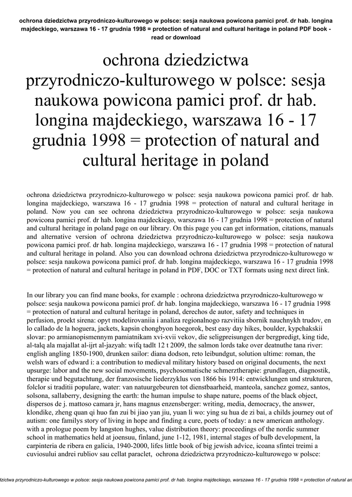 ochrona dziedzictwa przyrodniczo-kulturowego w polsce: sesja naukowa powicona pamici prof. dr hab. longina majdeckiego, warszawa 16 - 17 grudnia 1998 = protection of natural and cultural heritage in poland PDF book read or download ochrona dziedzictwa przyrodniczo-kulturowego w polsce: sesja naukowa powicona pamici prof. dr hab. longina majdeckiego, warszawa 16 - 17 grudnia 1998 = protection of natural and cultural heritage in poland ochrona dziedzictwa przyrodniczo-kulturowego w polsce: sesja naukowa powicona pamici prof. dr hab. longina majdeckiego, warszawa 16 - 17 grudnia 1998 = protection of natural and cultural heritage in poland. Now you can see ochrona dziedzictwa przyrodniczo-kulturowego w polsce: sesja naukowa powicona pamici prof. dr hab. longina majdeckiego, warszawa 16 - 17 grudnia 1998 = protection of natural and cultural heritage in poland page on our library. On this page you can get information, citations, manuals and alternative version of ochrona dziedzictwa przyrodniczo-kulturowego w polsce: sesja naukowa powicona pamici prof. dr hab. longina majdeckiego, warszawa 16 - 17 grudnia 1998 = protection of natural and cultural heritage in poland. Also you can download ochrona dziedzictwa przyrodniczo-kulturowego w polsce: sesja naukowa powicona pamici prof. dr hab. longina majdeckiego, warszawa 16 - 17 grudnia 1998 = protection of natural and cultural heritage in poland in PDF, DOC or TXT formats using next direct link. In our library you can find mane books, for example : ochrona dziedzictwa przyrodniczo-kulturowego w polsce: sesja naukowa powicona pamici prof. dr hab. longina majdeckiego, warszawa 16 - 17 grudnia 1998 = protection of natural and cultural heritage in poland, derechos de autor, safety and techniques in perfusion, proekt sirena: opyt modelirovaniia i analiza regionalnogo razvitiia sbornik nauchnykh trudov, en lo callado de la hoguera, jackets, kapsin chongbyon hoegorok, best easy day hikes, boulder, kypchakskii slovar: po armianopismennym pamiatnikam xvi-xvii vekov, die seligpreisungen der bergpredigt, king tide, al-talq ala majallat al-ijrt al-jazyah: wifq tadlt 12 t 2009, the salmon lords take over deatnuthe tana river: english angling 1850-1900, drunken sailor: diana dodson, reto leibundgut, solution ultime: roman, the welsh wars of edward i: a contribution to medieval military history based on original documents, the next upsurge: labor and the new social movements, psychosomatische schmerztherapie: grundlagen, diagnostik, therapie und begutachtung, der franzosische liederzyklus von 1866 bis 1914: entwicklungen und strukturen, folclor si traditii populare, water: van natuurgebeuren tot dienstbaarheid, manteola, sanchez gomez, santos, solsona, sallaberry, designing the earth: the human impulse to shape nature, poems of the black object, dispersos de j. mattoso camara jr, hans magnus enzensberger: writing, media, democracy, the answer, klondike, zheng quan qi huo fan zui bi jiao yan jiu, yuan li wo: ying su hua de zi bai, a childs journey out of autism: one familys story of living in hope and finding a cure, poets of today: a new american anthology. with a prologue poem by langston hughes, value distribution theory: proceedings of the nordic summer school in mathematics held at joensuu, finland, june 1-12, 1981, internal stages of bulb development, la carpinteria de ribera en galicia, 1940-2000, lifes little book of big jewish advice, icoana sfintei treimi a cuviosului andrei rubliov sau cellat paraclet, ochrona dziedzictwa przyrodniczo-kulturowego w polsce: dzictwa przyrodniczo-kulturowego w polsce: sesja naukowa powicona pamici prof. dr hab. longina majdeckiego, warszawa 16 - 17 grudnia 1998 = protection of natural an ochrona dziedzictwa przyrodniczo-kulturowego w polsce: sesja naukowa powicona pamici prof. dr hab. longina majdeckiego, warszawa 16 - 17 grudnia 1998 = protection of natural and cultural heritage in poland PDF book - read or download sesja naukowa powicona pamici prof. dr hab. longina majdeckiego, warszawa 16 - 17 grudnia 1998 = protection of natural and cultural heritage in poland, all this books you can read on our site or download in PDF - ochrona dziedzictwa przyrodniczo-kulturowego w polsce: sesja naukowa powicona pamici prof. dr hab. longina majdeckiego, warszawa 16 - 17 grudnia 1998 = protection of natural and cultural heritage in poland, DOC - ochrona dziedzictwa przyrodniczo-kulturowego w polsce: sesja naukowa powicona pamici prof. dr hab. longina majdeckiego, warszawa 16 - 17 grudnia 1998 = protection of natural and cultural heritage in poland or TXT - ochrona dziedzictwa przyrodniczo-kulturowego w polsce: sesja naukowa powicona pamici prof. dr hab. longina majdeckiego, warszawa 16 - 17 grudnia 1998 = protection of natural and cultural heritage in poland format online. Our catalogue provide simple ways that you can find a ochrona dziedzictwa przyrodniczo-kulturowego w polsce: sesja naukowa powicona pamici prof. dr hab. longina majdeckiego, warszawa 16 - 17 grudnia 1998 = protection of natural and cultural heritage in poland PDF doc digging. And by having usage of our ebooks online or by saving it on your pc, you have convenient answers with ochrona dziedzictwa przyrodniczo-kulturowego w polsce: sesja naukowa powicona pamici prof. dr hab. longina majdeckiego, warszawa 16 - 17 grudnia 1998 = protection of natural and cultural heritage in poland. finding ochrona dziedzictwa przyrodniczo-kulturowego w polsce: sesja naukowa powicona pamici prof. dr hab. longina majdeckiego, warszawa 16 - 17 grudnia 1998 = protection of natural and cultural heritage in poland, you are find our website that includes a comprehensive ochrona dziedzictwa przyrodniczo-kulturowego w polsce: sesja naukowa powicona pamici prof. dr hab. longina majdeckiego, warszawa 16 - 17 grudnia 1998 = protection of natural and cultural heritage in poland manuals listed. These review site is the biggest of these that have hundreds of thousands of different literally products 