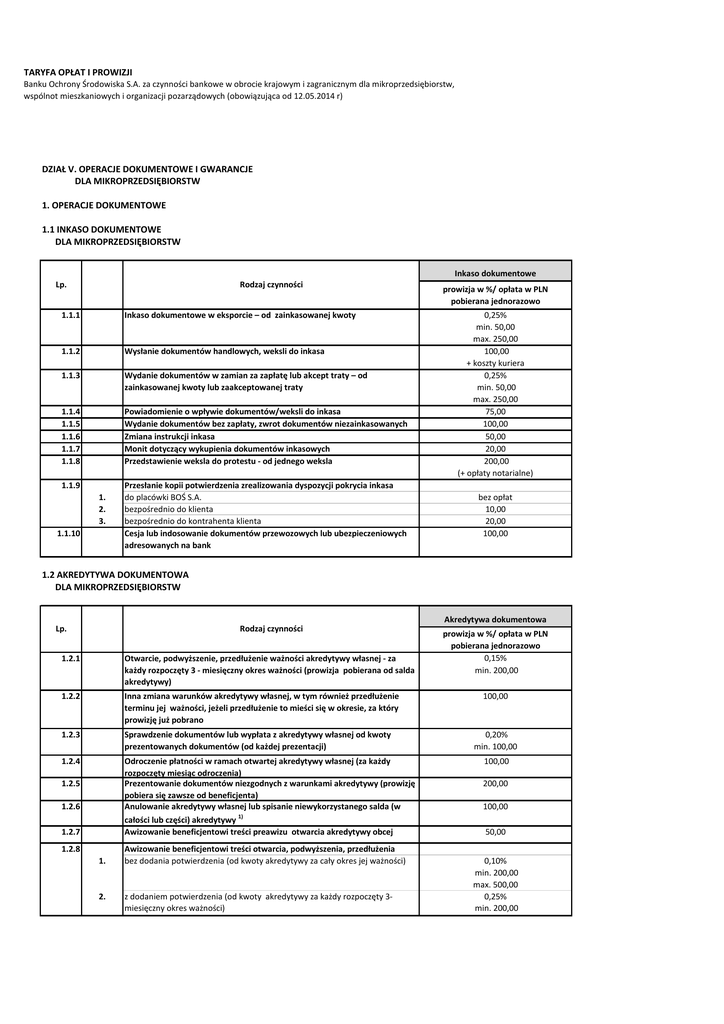 TARYFA OPŁAT I PROWIZJI Banku Ochrony Środowiska S.A. za czynności bankowe w obrocie krajowym i zagranicznym dla mikroprzedsiębiorstw, wspólnot mieszkaniowych i organizacji pozarządowych (obowiązująca od 12.05.2014 r) DZIAŁ V. OPERACJE DOKUMENTOWE I GWARANCJE DLA MIKROPRZEDSIĘBIORSTW 1. OPERACJE DOKUMENTOWE 1.1 INKASO DOKUMENTOWE DLA MIKROPRZEDSIĘBIORSTW Inkaso dokumentowe Lp. Rodzaj czynności 1.1.1 Inkaso dokumentowe w eksporcie – od zainkasowanej kwoty 1.1.2 Wysłanie dokumentów handlowych, weksli do inkasa 1.1.3 Wydanie dokumentów w zamian za zapłatę lub akcept traty – od zainkasowanej kwoty lub zaakceptowanej traty 1.1.4 1.1.5 1.1.6 1.1.7 1.1.8 Powiadomienie o wpływie dokumentów/weksli do inkasa Wydanie dokumentów bez zapłaty, zwrot dokumentów niezainkasowanych Zmiana instrukcji inkasa Monit dotyczący wykupienia dokumentów inkasowych Przedstawienie weksla do protestu - od jednego weksla 1.1.9 Przesłanie kopii potwierdzenia zrealizowania dyspozycji pokrycia inkasa do placówki BOŚ S.A. bezpośrednio do klienta bezpośrednio do kontrahenta klienta Cesja lub indosowanie dokumentów przewozowych lub ubezpieczeniowych adresowanych na bank 1. 2. 3. 1.1.10 prowizja w %/ opłata w PLN pobierana jednorazowo 0,25% min. 50,00 max. 250,00 100,00 + koszty kuriera 0,25% min. 50,00 max. 250,00 75,00 100,00 50,00 20,00 200,00 (+ opłaty notarialne) bez opłat 10,00 20,00 100,00 1.2 AKREDYTYWA DOKUMENTOWA DLA MIKROPRZEDSIĘBIORSTW Akredytywa dokumentowa Lp. Rodzaj czynności 1.2.1 Otwarcie, podwyższenie, przedłużenie ważności akredytywy własnej - za każdy rozpoczęty 3 - miesięczny okres ważności (prowizja pobierana od salda akredytywy) 1.2.2 Inna zmiana warunków akredytywy własnej, w tym również przedłużenie terminu jej ważności, jeżeli przedłużenie to mieści się w okresie, za który prowizję już pobrano 1.2.3 Sprawdzenie dokumentów lub wypłata z akredytywy własnej od kwoty prezentowanych dokumentów (od każdej prezentacji) 1.2.4 Odroczenie płatności w ramach otwartej akredytywy własnej (za każdy rozpoczęty miesiąc odroczenia) Prezentowanie dokumentów niezgodnych z warunkami akredytywy (prowizję pobiera się zawsze od beneficjenta) Anulowanie akredytywy własnej lub spisanie niewykorzystanego salda (w całości lub części) akredytywy 1) Awizowanie beneficjentowi treści preawizu otwarcia akredytywy obcej 1.2.5 1.2.6 1.2.7 1.2.8 1. 2. Awizowanie beneficjentowi treści otwarcia, podwyższenia, przedłużenia bez dodania potwierdzenia (od kwoty akredytywy za cały okres jej ważności) z dodaniem potwierdzenia (od kwoty akredytywy za każdy rozpoczęty 3miesięczny okres ważności) prowizja w %/ opłata w PLN pobierana jednorazowo 0,15% min. 200,00 100,00 0,20% min. 100,00 100,00 200,00 100,00 50,00 0,10% min. 200,00 max. 500,00 0,25% min. 200,00 1.2.9 Inna zmiana warunków akredytywy obcej, w tym również przedłużenie terminu jej ważności, jeżeli przedłużenie to mieści się w okresie, za który prowizję już pobrano 1.2.10 Sprawdzenie dokumentów lub wypłata z akredytywy obcej od kwoty prezentowanych dokumentów (od każdej prezentacji) 1.2.11 Odroczenie płatności w ramach akredytywy obcej (opłata jednorazowa) 1.2.12 Przeniesienie akredytywy obcej na rzecz beneficjenta/ów wtórnego/ych w kraju i za granicą (prowizję tę pobiera się od beneficjenta pierwotnego, jeśli akredytywa nie stanowi inaczej) Wypłata części kwoty akredytywy obcej na rzecz agenta w kraju / za granicą 1.2.13 0,20% min. 100,00 100,00 0,15% min. 200,00 0,25% min. 50,00 max. 250,00 0,25% min. 50,00 max. 250,00 1.2.14 Przekazanie wypłaty z akredytywy obcej, na życzenie beneficjenta akredytywy, do innego banku 1.2.15 Anulowanie lub spisanie całkowicie niewykorzystanej akredytywy obcej 100,00 1.2.16 Cesja lub indosowanie dokumentów przewozowych i ubezpieczeniowych adresowanych na bank 100,00 1.2.17 Przesłanie kopii potwierdzenia zrealizowania dyspozycji zlecenia klienta w do placówki BOŚ S.A. bezpośrednio do klienta bezpośrednio do kontrahenta klienta 1. 2. 3. 1) 100,00 bez opłat 10,00 20,00 w przypadku, gdy równowartość złotowa niewykorzystanego salda akredytywy jest niższa lub równa 200,00 PLN, prowizji nie pobiera się 2. GWARANCJE DLA MIKROPRZEDSIĘBIORSTW Lp. Rodzaj czynności 2.1 Rozpatrzenie zlecenia udzielenia gwarancji/poręczenia (od kwoty wnioskowanej gwarancji/poręczenia) 1) 2.2 Prowizja za wystawienie gwarancji/poręczenia (od kwoty przyznanej gwarancji/poręczenia) Wystawienie promesy udzielenia gwarancji 2.3 2.4 Prowizja za korzystanie z gwarancji/poręczenia (od kwoty gwarancji/poręczenia za każdy rozpoczęty okres 3-miesięczny przez cały okres ważności wystawionej gwarancji/poręczenia) 2.5 1. Czynności zawiązane z przygotowaniem aneksów do umów dotyczących: przedłużenia okresu gwarancji/poręczenia (od kwoty gwarancji/poręczenia) 2. podwyższenia kwoty gwarancji (od kwoty podwyższenia) 3. inna zmiana warunków gwarancji własnej Awizowanie beneficjentowi treści preawizu gwarancji obcej Awizowanie beneficjentowi treści gwarancji obcej 2.6 2.7 2.8 Awizowanie beneficjentowi zmiany gwarancji obcej (np. podwyższenie gwarancji, przedłużenie terminu ważności) 2.9 Potwierdzenie gwarancji obcej (od kwoty gwarancji za każdy rozpoczęty 3 miesięczny okres ważności) 2.10 Sprawdzenie roszczenia z warunkami gwarancji obcej i wysyłka roszczenia (od kwoty roszczenia) 2.11 Anulowanie gwarancji 2.12 Przesłanie kopii potwierdzenia zrealizowania zlecenia klienta w ramach do placówki BOŚ S.A. bezpośrednio do klienta bezpośrednio do kontrahenta klienta 1. 2. 3. 1) Gwarancja bankowa prowizja w % / opłata w PLN pobierana jednorazowo 0,10% min. 100,00 max. 500,00 min. 1,00% min. 200,00 0,20% min. 100,00 0,50% - 2,00% min. 150,00 min. 1,00% min. 100,00 min. 1,00% min. 100,00 100,00 50,00 0,10% min. 100,00 max. 500,00 100,00 uzgodniona indywidualnie 0,20% min. 100,00 100,00 bez opłat 10,00 20,00 w przypadk