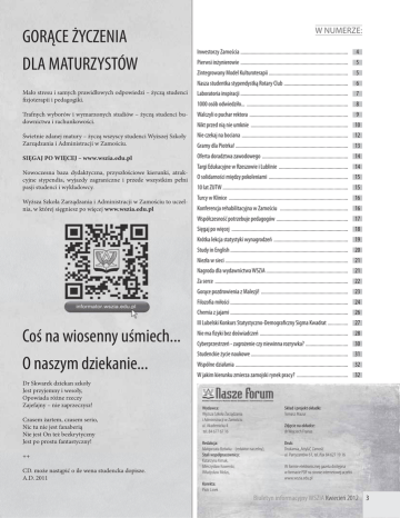 GORĄCE ŻYCZENIA DLA MATURZYSTÓW W NUMERZE: Inwestorzy Zamościa .................................................................................... 4 Pierwsi inżynierowie .................................................................................... 5 Zintegrowany Model Kulturoterapii .............................................................. 5 Nasza studentka stypendystką Rotary Club .................................................. 6 Mało stresu i samych prawidłowych odpowiedzi – życzą studenci fizjoterapii i pedagogiki. Laboratoria inspiracji .................................................................................... 7 1000 osób odwiedziło... ............................................................................... 8 Trafnych wyborów i wymarzonych studiów – życzą studenci budownictwa i rachunkowości. Walczyli o puchar rektora ............................................................................. 9 Świetnie zdanej matury – życzą wszyscy studenci Wyższej Szkoły Zarządzania i Administracji w Zamościu. Nie czekaj na bociana ................................................................................... 12 SIĘGAJ PO WIĘCEJ – www.wszia.edu.pl Oferta doradztwa zawodowego ................................................................... 14 Nowoczesna baza dydaktyczna, przyszłościowe kierunki, atrakcyjne stypendia, wyjazdy zagraniczne i przede wszystkim pełni pasji studenci i wykładowcy. Wyższa Szkoła Zarządzania i Administracji w Zamościu to uczelnia, w której sięgniesz po więcej www.wszia.edu.pl Nikt przed nią nie umknie ............................................................................ 10 Gramy dla Piotrka! ........................................................................................ 13 Targi Edukacyjne w Rzeszowie i Lublinie ...................................................... 14 O solidarności między pokoleniami .............................................................. 15 10 lat ZUTW .................................................................................................. 15 Turcy w Klinice ............................................................................................. 16 Konferencja rehabilitacyjna w Zamościu ..................................................... 16 Współczesność potrzebuje pedagogów ........................................................ 17 Sięgaj po więcej ........................................................................................... 18 Krótka lekcja statystyki wynagrodzeń .......................................................... 19 Study in English ............................................................................................ 20 Niezła w sieci ................................................................................................ 21 Nagroda dla wydawnictwa WSZiA ................................................................ 21 Za serce ........................................................................................................ 22 Gorące pozdrowienia z Malezji! .................................................................... 23 Filozofia miłości ............................................................................................ 24 Chemia z jajami ............................................................................................ 26 III Lubelski Konkurs Statystyczno-Demograficzny Sigma Kwadrat ................ 27 Coś na wiosenny uśmiech... O naszym dziekanie... Dr Skwarek dziekan szkoły Jest przyjemny i wesoły, Opowiada różne rzeczy Zajefajny – nie zaprzeczysz! Czasem żartem, czasem serio, Nic tu nie jest fanaberią Nie jest On też bezkrytyczny Jest po prostu fantastyczny! ++ CD. może nastąpić o ile wena studencka dopisze. A.D. 2011 Nie ma fizyki bez doświadczeń ..................................................................... 28 Cyberprzestrzeń - zagrożenie czy niewinna rozrywka? ................................. 30 Studenckie życie naukowe ............................................................................ 31 Wspólne działania ........................................................................................ 32 W jakim kierunku zmierza zamojski rynek pracy? ........................................ 32 Wydawca: Wyższa Szkoła Zarządzania i Administracji w Zamościu ul. Akademicka 4 tel. 84 677 67 16 Skład i projekt okładki: Tomasz Mazur Redakcja: Małgorzata Bzówka - (redaktor naczelny), Stali współpracownicy: Katarzyna Kimak, Mieczysław Kowerski, Władysław Molas, Druk: Drukarnia „Attyla”, Zamość ul. Partyzantów 61, tel./fax 84 627 19 16 Zdjęcie na okładce: dr Wojciech Franus W formie elektronicznej gazeta dostępna w formacie PDF na stronie internetowej uczelni www.wszia.edu.pl Korekta: Piotr Linek Biuletyn informacyjny WSZiA Kwiecień 2012 3 II ZAMOJSKIE FORUM GOSPODARCZE INWESTORZY ZAMOŚCIA Podczas II Zamojskiego Forum Gospodarczego, którego współorganizatorem 18 kwietnia br. była również nasza uczelnia nagrodzono Inwestorów roku 2011 w Zamościu. W 2011 wydano ponad 100 mln zł w mieście na inwestycje. Kapituła Zamojskiej Nagrody Gospodarczej INWESTOR ROKU wybrała czterech inwestorów, których inwestycje wpłynęły znacząco na zamojską gospodarkę. Brana była pod uwagę nie tylko kwotowa wielkość inwestycji, ale i wielkość średniorocznego wzrostu zatrudnienia. Laureatami Zamojskiej Nagrody Gospodarczej INWESTOR ROKU 2011 zostali - Euro-Car Sp. z o.o. (za budowę salonu Dacia i zakup terenów i nieruchomości inwestycyjnych na terenie miasta), Fortis Inwestycje Sp. z o.o. Sp. K. (za budowę Browaru Zamość), Park Sp. z o.o. (za rozbudowę Hotelu Artis&Spa), PKP Linia Hutnicza Szerokotorowa Sp. z o.o. (za remont budynków siedziby spółki przy ul. Szczebrzeskiej oraz rozbudowę torów w Bortatyczach). Uroczyste wręczenie poprzedziły prezentacje miast Schwäbisch Hal