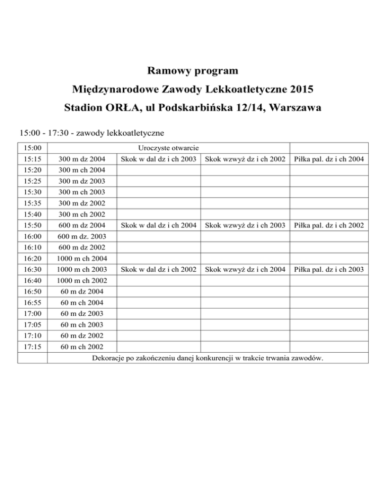 Ramowy program Międzynarodowe Zawody Lekkoatletyczne 2015 Stadion ORŁA, ul Podskarbińska 12/14, Warszawa 15:00 - 17:30 - zawody lekkoatletyczne 15:00 Uroczyste otwarcie 15:15 300 m dz 2004 15:20 300 m ch 2004 15:25 300 m dz 2003 15:30 300 m ch 2003 15:35 300 m dz 2002 15:40 300 m ch 2002 15:50 600 m dz 2004 16:00 600 m dz. 2003 16:10 600 m dz 2002 16:20 1000 m ch 2004 16:30 1000 m ch 2003 16:40 1000 m ch 2002 16:50 60 m dz 2004 16:55 60 m ch 2004 17:00 60 m dz 2003 17:05 60 m ch 2003 17:10 60 m dz 2002 17:15 60 m ch 2002 Skok w dal dz i ch 2003 Skok wzwyż dz i ch 2002 Piłka pal. dz i ch 2004 Skok w dal dz i ch 2004 Skok wzwyż dz i ch 2003 Piłka pal. dz i ch 2002 Skok w dal dz i ch 2002 Skok wzwyż dz i ch 2004 Piłka pal. dz i ch 2003 Dekoracje po zakończeniu danej konkurencji w trakcie trwania zawodów.
