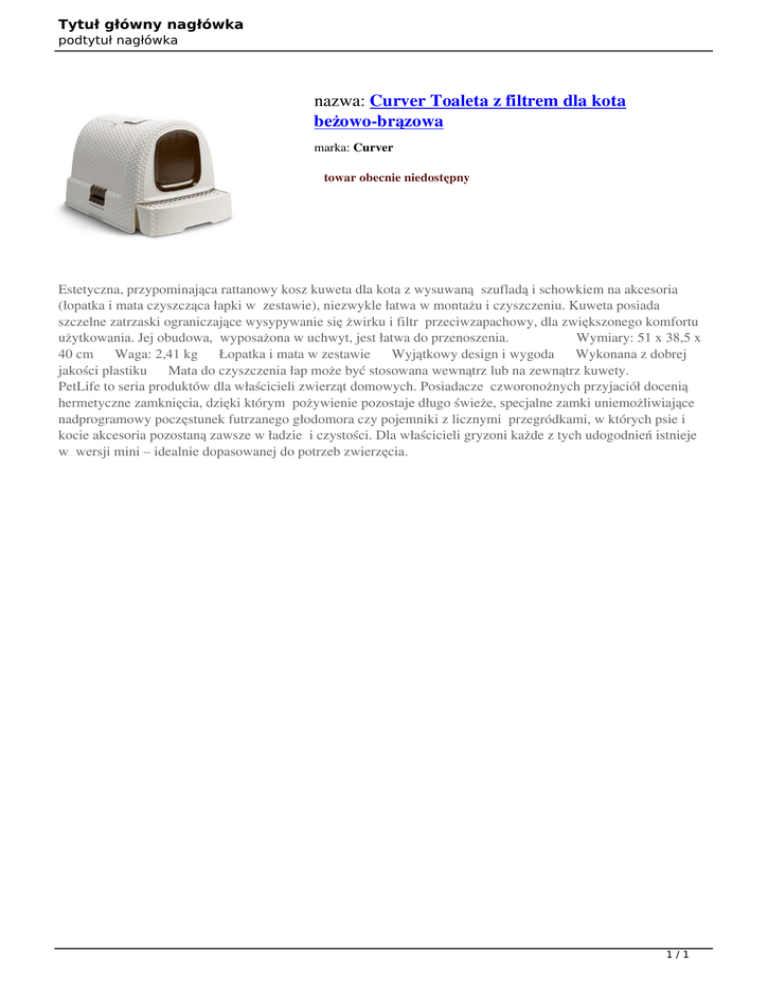 Tytuł główny nagłówka podtytuł nagłówka nazwa: Curver Toaleta z filtrem dla kota beżowo-brązowa marka: Curver towar obecnie niedostępny Estetyczna, przypominająca rattanowy kosz kuweta dla kota z wysuwaną szufladą i schowkiem na akcesoria (łopatka i mata czyszcząca łapki w zestawie), niezwykle łatwa w montażu i czyszczeniu. Kuweta posiada szczelne zatrzaski ograniczające wysypywanie się żwirku i filtr przeciwzapachowy, dla zwiększonego komfortu użytkowania. Jej obudowa, wyposażona w uchwyt, jest łatwa do przenoszenia. Wymiary: 51 x 38,5 x 40 cm Waga: 2,41 kg Łopatka i mata w zestawie Wyjątkowy design i wygoda Wykonana z dobrej jakości plastiku Mata do czyszczenia łap może być stosowana wewnątrz lub na zewnątrz kuwety. PetLife to seria produktów dla właścicieli zwierząt domowych. Posiadacze czworonożnych przyjaciół docenią hermetyczne zamknięcia, dzięki którym pożywienie pozostaje długo świeże, specjalne zamki uniemożliwiające nadprogramowy poczęstunek futrzanego głodomora czy pojemniki z licznymi przegródkami, w których psie i kocie akcesoria pozostaną zawsze w ładzie i czystości. Dla właścicieli gryzoni każde z tych udogodnień istnieje w wersji mini – idealnie dopasowanej do potrzeb zwierzęcia. 1/1