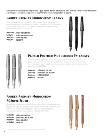 Dzięki zastosowaniu szczotkowanego metalu i głębi odcieni monochromatycznych pióra z kolekcji Parker Premier Monochrom prezentują się nowocześnie i elegancko. To wyrafinowane i innowacyjne przybory do pisania. Parker Premier Monochrom Czarny Korpus pióra pokryto czarną ceramiką, której matowy odcień dostępny jest wyłącznie w kolekcji Parker Premier Monochrom. Stalówkę z 18-karatowego złota zdobi czarne pokrycie z rutenu. Asortyment dostępny w specjalnym, czarnym opakowaniu na prezent marki PARKER. S0930500 S0924770 S0930520 S0924790 PIÓRO WIECZNE FINE PIÓRO WIECZNE MEDIUM PIÓRO KULKOWE DŁUGOPIS Parker Premier Monochrom Tytanowy Charakterystyczny dla kolekcji Parker Premier Monochrom matowy odcień. Pióro pokryte tytanem nanoszonym techniką PVD*. Duża złota stalówka z 18-karatowego złota wykończona rodem. Asortyment dostępny w specjalnym, czarnym opakowaniu na prezent marki PARKER. S0960760 S0960770 S0960800 S0960820 PIÓRO WIECZNE FINE PIÓRO WIECZNE MEDIUM PIÓRO KULKOWE DŁUGOPIS Parker Premier Monochrom Różowe Złoto Pióro pokryte różowym złotem nanoszonym techniką PVD*. Ten matowy odcień dostępny jest wyłącznie w kolekcji Parker Premier Monochrom. Masywna, złota stalówka z 18-karatowego złota pokryta rodem. Asortyment dostępny w specjalnym, czarnym opakowaniu na prezent marki PARKER. S0960780 S0960790 S0960810 S0960830 PIÓRO WIECZNE FINE PIÓRO WIECZNE MEDIUM PIÓRO KULKOWE DŁUGOPIS * Wykończenia zostały wykonane techniką PVD (fizyczne osadzanie z fazy gazowej) 14
