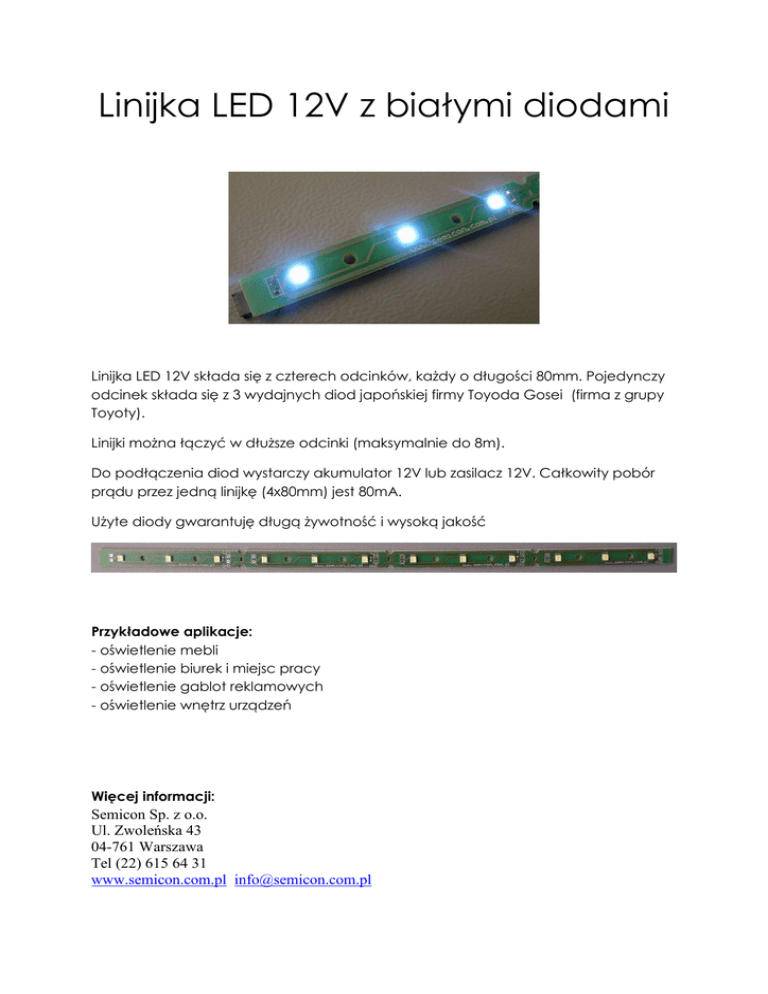Linijka LED 12V z białymi diodami Linijka LED 12V składa się z czterech odcinków, kaŜdy o długości 80mm. Pojedynczy odcinek składa się z 3 wydajnych diod japońskiej firmy Toyoda Gosei (firma z grupy Toyoty). Linijki moŜna łączyć w dłuŜsze odcinki (maksymalnie do 8m). Do podłączenia diod wystarczy akumulator 12V lub zasilacz 12V. Całkowity pobór prądu przez jedną linijkę (4x80mm) jest 80mA. UŜyte diody gwarantuję długą Ŝywotność i wysoką jakość Przykładowe aplikacje: - oświetlenie mebli - oświetlenie biurek i miejsc pracy - oświetlenie gablot reklamowych - oświetlenie wnętrz urządzeń Więcej informacji: Semicon Sp. z o.o. Ul. Zwoleńska 43 04-761 Warszawa Tel (22) 615 64 31 www.semicon.com.pl [email protected]