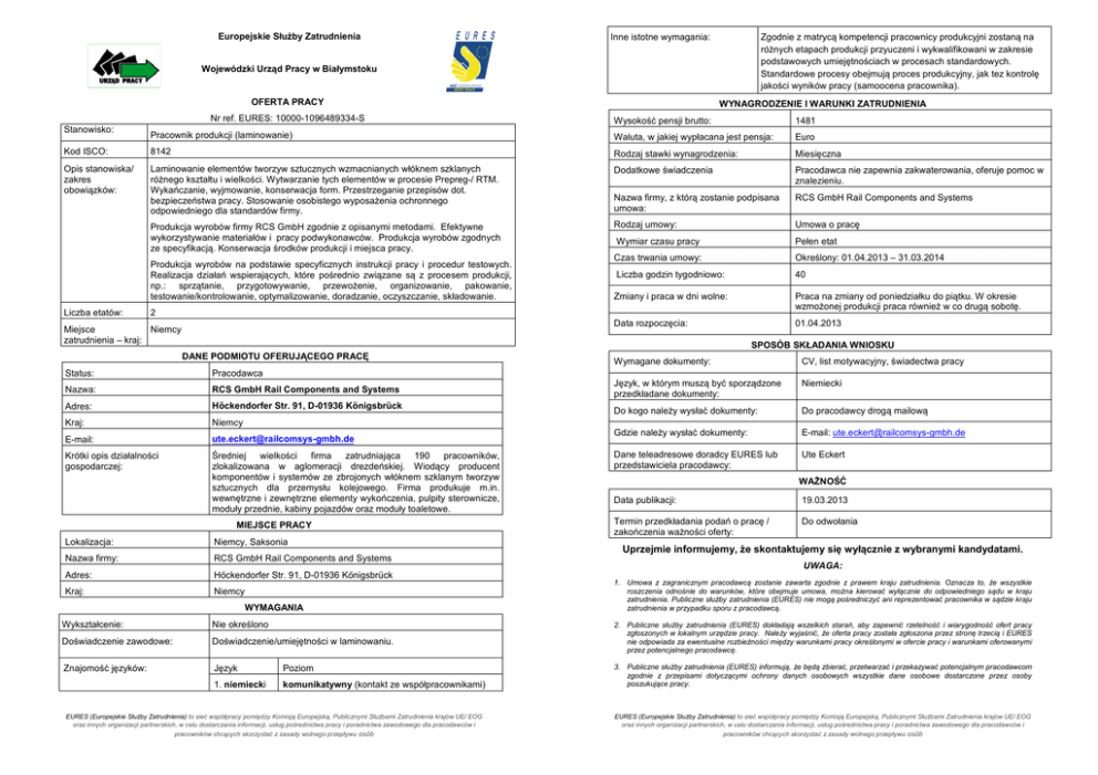 Europejskie Służby Zatrudnienia Inne istotne wymagania: Zgodnie z matrycą kompetencji pracownicy produkcyjni zostaną na różnych etapach produkcji przyuczeni i wykwalifikowani w zakresie podstawowych umiejętnościach w procesach standardowych. Standardowe procesy obejmują proces produkcyjny, jak tez kontrolę jakości wyników pracy (samoocena pracownika). Wojewódzki Urząd Pracy w Białymstoku OFERTA PRACY Nr ref. EURES: 10000-1096489334-S WYNAGRODZENIE I WARUNKI ZATRUDNIENIA Wysokość pensji brutto: 1481 Pracownik produkcji (laminowanie) Waluta, w jakiej wypłacana jest pensja: Euro Kod ISCO: 8142 Rodzaj stawki wynagrodzenia: Miesięczna Opis stanowiska/ zakres obowiązków: Laminowanie elementów tworzyw sztucznych wzmacnianych włóknem szklanych różnego kształtu i wielkości. Wytwarzanie tych elementów w procesie Prepreg-/ RTM. Wykańczanie, wyjmowanie, konserwacja form. Przestrzeganie przepisów dot. bezpieczeństwa pracy. Stosowanie osobistego wyposażenia ochronnego odpowiedniego dla standardów firmy. Dodatkowe świadczenia Pracodawca nie zapewnia zakwaterowania, oferuje pomoc w znalezieniu. Nazwa firmy, z którą zostanie podpisana umowa: RCS GmbH Rail Components and Systems Stanowisko: Produkcja wyrobów firmy RCS GmbH zgodnie z opisanymi metodami. Efektywne wykorzystywanie materiałów i pracy podwykonawców. Produkcja wyrobów zgodnych ze specyfikacją. Konserwacja środków produkcji i miejsca pracy. Produkcja wyrobów na podstawie specyficznych instrukcji pracy i procedur testowych. Realizacja działań wspierających, które pośrednio związane są z procesem produkcji, np.: sprzątanie, przygotowywanie, przewożenie, organizowanie, pakowanie, testowanie/kontrolowanie, optymalizowanie, doradzanie, oczyszczanie, składowanie. Liczba etatów: Rodzaj umowy: Umowa o pracę Wymiar czasu pracy Pełen etat Czas trwania umowy: Określony: 01.04.2013 – 31.03.2014 Liczba godzin tygodniowo: 40 Zmiany i praca w dni wolne: Praca na zmiany od poniedziałku do piątku. W okresie wzmożonej produkcji praca również w co drugą sobotę. Data rozpoczęcia: 01.04.2013 2 Miejsce Niemcy zatrudnienia – kraj: SPOSÓB SKŁADANIA WNIOSKU DANE PODMIOTU OFERUJĄCEGO PRACĘ Status: Pracodawca Nazwa: RCS GmbH Rail Components and Systems Adres: Höckendorfer Str. 91, D-01936 Königsbrück Kraj: Niemcy E-mail: [email protected] Krótki opis działalności gospodarczej: Średniej wielkości firma zatrudniająca 190 pracowników, zlokalizowana w aglomeracji drezdeńskiej. Wiodący producent komponentów i systemów ze zbrojonych włóknem szklanym tworzyw sztucznych dla przemysłu kolejowego. Firma produkuje m.in. wewnętrzne i zewnętrzne elementy wykończenia, pulpity sterownicze, moduły przednie, kabiny pojazdów oraz moduły toaletowe. MIEJSCE PRACY Lokalizacja: Niemcy, Saksonia Nazwa firmy: RCS GmbH Rail Components and Systems Adres: Höckendorfer Str. 91, D-01936 Königsbrück Kraj: Niemcy WYMAGANIA Wykształcenie: Nie określono Doświadczenie zawodowe: Doświadczenie/umiejętności w laminowaniu. Znajomość języków: Język Poziom 1. niemiecki komunikatywny (kontakt ze współpracownikami) EURES (Europejskie Służby Zatrudnienia) to sieć współpracy pomiędzy Komisją Europejską, Publicznymi Służbami Zatrudnienia krajów UE/ EOG oraz innych organizacji partnerskich, w celu dostarczania informacji, usług pośrednictwa pracy i poradnictwa zawodowego dla pracodawców i pracowników chcących skorzystać z zasady wolnego przepływu osób Wymagane dokumenty: CV, list motywacyjny, świadectwa pracy Język, w którym muszą być sporządzone przedkładane dokumenty: Niemiecki Do kogo należy wysłać dokumenty: Do pracodawcy drogą mailową Gdzie należy wysłać dokumenty: E-mail: [email protected] Dane teleadresowe doradcy EURES lub przedstawiciela pracodawcy: Ute Eckert WAŻNOŚĆ Data publikacji: 19.03.2013 Termin przedkładania podań o pracę / zakończenia ważności oferty: Do odwołania Uprzejmie informujemy, że skontaktujemy się wyłącznie z wybranymi kandydatami. UWAGA: 1. Umowa z zagranicznym pracodawcą zostanie zawarta zgodnie z prawem kraju zatrudnienia. Oznacza to, że wszystkie roszczenia odnośnie do warunków, które obejmuje umowa, można kierować wyłącznie do odpowiedniego sądu w kraju zatrudnienia. Publiczne służby zatrudnienia (EURES) nie mogą pośredniczyć ani reprezentować pracownika w sądzie kraju zatrudnienia w przypadku sporu z pracodawcą. 2. Publiczne służby zatrudnienia (EURES) dokładają wszelkich starań, aby zapewnić rzetelność i wiarygodność ofert pracy zgłoszonych w lokalnym urzędzie pracy. Należy wyjaśnić, że oferta pracy została zgłoszona przez stronę trzecią i EURES nie odpowiada za ewentualne rozbieżności między warunkami pracy określonymi w ofercie pracy i warunkami oferowanymi przez potencjalnego pracodawcę. 3. Publiczne służby zatrudnienia (EURES) informują, że będą zbierać, przetwarzać i przekazywać potencjalnym pracodawcom zgodnie z przepisami dotyczącymi ochrony danych osobowych wszystkie dane osobowe dostarczone przez osoby poszukujące pracy. EURES (Europejskie Służby Zatrudnienia) to sieć współpracy pomiędzy Komisją Europejską, Publicznymi Służbami Zatrudnienia krajów UE/ EOG oraz innych organizacji partnerskich, w celu dostarczania informacji, usług pośrednictwa pracy i poradnictwa zawodowego dla pracodawców i pracowników chcących skorzystać z zasady wolnego przepływu osób