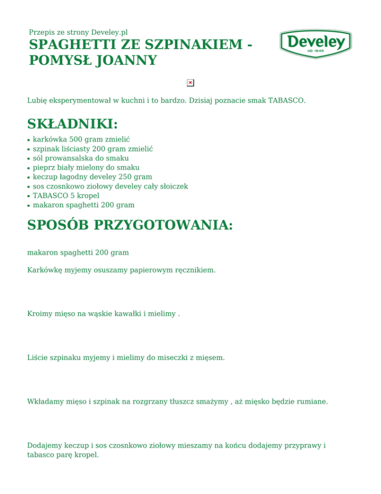 Przepis ze strony Develey.pl SPAGHETTI ZE SZPINAKIEM POMYSŁ JOANNY Lubię eksperymentował w kuchni i to bardzo. Dzisiaj poznacie smak TABASCO. SKŁADNIKI: ● ● ● ● ● ● ● ● karkówka 500 gram zmielić szpinak liściasty 200 gram zmielić sól prowansalska do smaku pieprz biały mielony do smaku keczup łagodny develey 250 gram sos czosnkowo ziołowy develey cały słoiczek TABASCO 5 kropel makaron spaghetti 200 gram SPOSÓB PRZYGOTOWANIA: makaron spaghetti 200 gram Karkówkę myjemy osuszamy papierowym ręcznikiem. Kroimy mięso na wąskie kawałki i mielimy . Liście szpinaku myjemy i mielimy do miseczki z mięsem. Wkładamy mięso i szpinak na rozgrzany tłuszcz smażymy , aż mięsko będzie rumiane. Dodajemy keczup i sos czosnkowo ziołowy mieszamy na końcu dodajemy przyprawy i tabasco parę kropel. Gotujemy makaron i podajemy z przygotowanym sosem z mięskiem i szpinakiem.