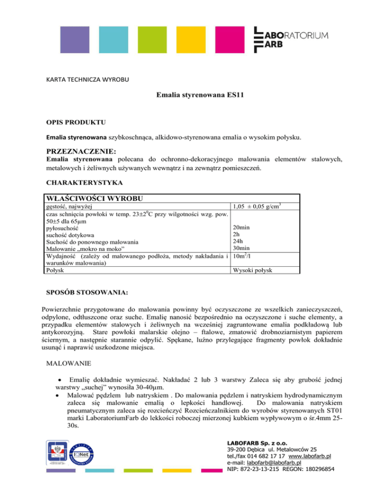 KARTA TECHNICZA WYROBU Emalia styrenowana ES11 OPIS PRODUKTU Emalia styrenowana szybkoschnąca, alkidowo-styrenowana emalia o wysokim połysku. PRZEZNACZENIE: Emalia styrenowana polecana do ochronno-dekoracyjnego malowania elementów stalowych, metalowych i żeliwnych używanych wewnątrz i na zewnątrz pomieszczeń. CHARAKTERYSTYKA WŁAŚCIWOŚCI WYROBU gęstość, najwyżej czas schnięcia powłoki w temp. 2320C przy wilgotności wzg. pow. 505 dla 65µm pyłosuchość suchość dotykowa Suchość do ponownego malowania Malowanie „mokro na moko” Wydajność (zależy od malowanego podłoża, metody nakładania i warunków malowania) Połysk 1,05 ± 0,05 g/cm3 20min 2h 24h 30min 10m2/l Wysoki połysk SPOSÓB STOSOWANIA: Powierzchnie przygotowane do malowania powinny być oczyszczone ze wszelkich zanieczyszczeń, odpylone, odtłuszcone oraz suche. Emalię nanosić bezpośrednio na oczyszczone i suche elementy, a przypadku elementów stalowych i żeliwnych na wcześniej zagruntowane emalia podkładową lub antykorozyjną. Stare powłoki malarskie olejno – ftalowe, zmatowić drobnoziarnistym papierem ściernym, a następnie starannie odpylić. Spękane, luźno przylegające fragmenty powłok dokładnie usunąć i naprawić uszkodzone miejsca. MALOWANIE Emalię dokładnie wymieszać. Nakładać 2 lub 3 warstwy Zaleca się aby grubość jednej warstwy „suchej” wynosiła 30-40µm. Malować pędzlem lub natryskiem . Do malowania pędzlem i natryskiem hydrodynamicznym zaleca się malowanie emalią o lepkości handlowej. Do malowania natryskiem pneumatycznym zaleca się rozcieńczyć Rozcieńczalnikiem do wyrobów styrenowanych ST01 marki LaboratoriumFarb do lekkości roboczej mierzonej kubkiem wypływowym o śr.4mm 2530s. LABOFARB Sp. z o.o. 39-200 Dębica ul. Metalowców 25 tel./fax 014 682 17 17 www.labofarb.pl e-mail: [email protected] NIP: 872-23-13-215 REGON: 180296854 Malowanie prowadzić w temp. podłoża i otoczenia od +10ºC do 25ºC i wilgotności poniżej 80% Nakładać 2 lub 3 warstwy. Zaleca się aby grubość jednej warstwy „suchej” wynosiła 30-40µm. Po zakończeniu prac malarskich narzędzia umyć Rozcieńczalnikiem do wyrobów styrenowanych ST01 marki LaboratoriumFarb Proponowane parametry Natrysk pneumatyczny hydrodynamiczny Średnica dyszy 1,5-2,5mm 0,011"-0,015" Ciśnienie 2,5-3,5bar 120-160 bar WSKAZÓWKI BHP I PPOŻ Informacje zawarte są na etykiecie i w karcie charakterystyki. TRANSPORT I PRZECHOWYWANIE Przechowywać w szczelnie zamkniętym opakowaniu w temperaturze od +5oC do +25oC. Składować w pomieszczeniach suchych z odpowiednia wntylacją. Produkt jest sklasyfikowany jako niebezpieczny w rozumieniu przepisów transportowych (ADR/RID) klasa 3 UN 1263 Jeśli opakowanie jest poniżej 450l, na podstawie warunków 2.2.3.1.5, produkt nie podlega przepisom ADR OPAKOWANIA: Opakowanie metalowe 25L Termin przydatności: 12 miesiące od daty produkcji w fabrycznie szczelnym opakowaniu, przy zachowaniu wymaganych warunków transportu i składowania. Data produkcji i nr partii na opakowaniu. Dostępne kolory : na zamówienie w kolorach RAL i NCS Produkt przeznaczony jest wyłącznie do stosowania w instalacjach, w których stosuje się przepisy w sprawie standardów emisyjnych. Wyrób tylko do użytku przemysłowego. LABOFARB Sp. z o.o. 39-200 Dębica ul. Metalowców 25 tel./fax 014 682 17 17 www.labofarb.pl e-mail: [email protected] NIP: 872-23-13-215 REGON: 180296854
