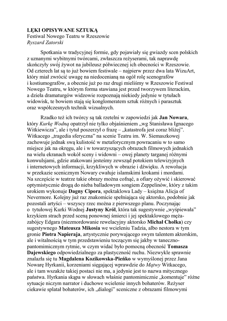 LĘKI OPISYWANE SZTUKĄ Festiwal Nowego Teatru w Rzeszowie Ryszard Zatorski Spotkania w tradycyjnej formie, gdy pojawiały się gwiazdy scen polskich z uznanymi wybitnymi twórcami, zwłaszcza reżyserami, tak naprawdę skończyły swój żywot na jubileusz półwiecznej ich obecności w Rzeszowie. Od czterech lat są to już bowiem festiwale – najpierw przez dwa lata WizuArt, który miał zwrócić uwagę na niedocenianą na ogół rolę scenografów i kostiumografów, a obecnie już po raz drugi mieliśmy w Rzeszowie Festiwal Nowego Teatru, w którym forma stawiana jest przed tworzywem literackim, a dzieła dramaturgów widzowie rozpoznają niekiedy jedynie w tytułach widowisk, te bowiem stają się konglomeratem sztuk różnych i parasztuk oraz współczesnych technik wizualnych. Rzadko też ich twórcy są tak rzetelni w zapowiedzi jak Jan Nowara, który Kurkę Wodną opatrzył nie tylko objaśnieniem „wg Stanisława Ignacego Witkiewicza”, ale i tytuł poszerzył o frazę – „katastrofa jest coraz bliżej”. Witkacego „tragedia sferyczna” na scenie Teatru im. W. Siemaszkowej zachowuje jednak swą kulistość w metaforycznym powracaniu w to samo miejsce jak na okręgu, ale i w towarzyszących obrazach filmowych jednakich na wielu ekranach wokół sceny i widowni – owej planety targanej różnymi konwulsjami, gdzie atakowani jesteśmy zewsząd potokiem telewizyjnych i internetowych informacji, krzykliwych w obrazie i dźwięku. A rewolucja w przekazie scenicznym Nowary cwałuje islamskimi krokami i mordami. Na szczęście w teatrze takie obrazy można cofnąć, a ofiary ożywić i skierować optymistycznie drogą do nieba balladowym songiem Zeppelinów, który z takim urokiem wykonuje Dagny Cipora, spektaklowa Lady – księżna Alicja of Nevermore. Kolejny już raz znakomicie spełniająca się aktorsko, podobnie jak pozostali artyści – wszyscy rzec można z pierwszego planu. Poczynając o tytułowej Kurki Wodnej Justyny Król, która tak sugestywnie „wyśpiewała” krzykiem strach przed sceną ponownej śmierci i jej spektaklowego mężazabójcy Edgara (niezmordowanie rewelacyjny aktorsko Michał Chołka) czy sugestywnego Mateusza Mikosia we wcieleniu Tadzia, albo nestora w tym gronie Piotra Napieraja, artystycznie porywającego swym talentem aktorskim, ale i witalnością w tym przedstawieniu toczącym się jakby w tanecznopantomimicznym rytmie, w czym widać było pomocną obecność Tomasza Dajewskiego odpowiedzialnego za plastyczność ruchu. Niezwykle sprawnie znalazła się tu Magdalena Kozikowska-Pieńko w wymyślonej przez Jana Nowarę Hyrkanii, korzeniami sięgającej wprawdzie do Mątwy Witkacego, ale i tam wszakże takiej postaci nie ma, a jedynie jest to nazwa mitycznego państwa. Hyrkania skąpa w słowach właśnie pantomimicznie „komentuje” różne sytuacje niczym narrator i duchowe wcielenie innych bohaterów. Reżyser ciekawie splatał bohaterów, ich „dialogi” sceniczne z obrazami filmowymi i plastycznymi scenami – sugestywnie, jak choćby w owym może nieco przydługim transie bodaj narkotycznym, gdy przenosił nas wyobraźnią w ten niebotyczny kosmos i inne przestrzenie. Pojawiają się w tym spektaklu także klimaty orwellowskie, absurdy zawsze dobrze wpasowane w nasze życie niezależnie od epoki. I Witkacowe przemeblowywanie rzeczywistości, gdy Kurka jest zabijana i umiera, by pojawić się znów żywa w innej sekwencji i znowu zginąć. Podobnie jak i owi bankowcy (Józef Hamkało, Robert Żurek, Robert Chodur), którym islamiści podrzynają gardła, a potem film biegnie odwrotnie i powracają żywi do kadru oraz na scenę także. Objawia się w tym spektaklu i metafizyczność, i rzeczywistość, w której każda z postaci wiedzie swój żywot jakby niespójny z otoczeniem, z konsumpcyjną zachłannością, z władczymi pokusami i zanurzeniem w niepewną groźną przyszłość. Teatr czystej formy, wyobraźni, skojarzeń i wzruszeń estetycznych. Kurka Wodna gospodarzy, co w pewnym sensie zrozumiałe, była jedynym premierowym przedstawieniem na festiwalu, które otwierało te spotkania w Teatrze im. Wandy Siemaszkowej w jubileuszowym roku 70lecia tej sceny dramatycznej. Za inne należy się pokłon organizatorom, że przybliżyli je rzeszowianom, oszczędzając nam widzom kosztów i fatygi jeżdżenia po Polsce. Albo dowieźli do Tarnowa, by tam pokazać w Teatrze Solskiego Grażynę Mickiewicza przygotowaną przez Radosława Rychcika w konwencji meczu koszykarskiego. Cóż, można i tak, choć poemat epicki wieszcza obronił się sam w aktorskiej recytacyjnej interpretacji aktorów i znakomitej oprawie muzycznej chóru. I chociaż, jak wspomniałem na wstępie, owa nowoczesność – szczególnie w formach multimedialnego obrazowania scenicznego – być może nie wszystkim teatromanom pasuje, to przecież obcowanie choćby z twórcami widowiska nie-boska komedia. Wszystko powiem Bogu! Pawła Demirskiego, a inspirowanego dramatem Zygmunta Krasińskiego, było dla wielu ucztą artystyczną. Mimo ze po przerwie widownia nieco się przerzedziła. Nic dziwnego, że fetowano wykonawców długą owacją na stojąco. Lęki wielkiego romantyka, jego wizje przerosła współczesna rzeczywistość, gdy nie tylko metaforycznie próbujemy się często chronić i uciekać. Jak do owej ciemnej klatki w nieznanym bloku, gdy nie wiadomo, czy zapalając światło nie naciśniemy dzwonka do cudzych drzwi, zza których może wyłonić się jeszcze bardziej wylękniona postać. I dobrze, że młodziutkie jury chociaż indywidualne wyróżnienia przyznało wykonawcom z tego widowiska, zwłaszcza rewelacyjnej aktorsko Dorocie Pomykale. Przesłania Demirskiego w tym spektaklu w wyborczą niedzielę 25 października zyskiwały też jeszcze nowy, inny wymiar. Sądziłem, że ta propozycja krakowskiego Starego Teatru na festiwalu była najcenniejsza, ale z wielu względów z satysfakcją przyjąłem też werdykt jury o Grand Prix dla spektaklu Afr