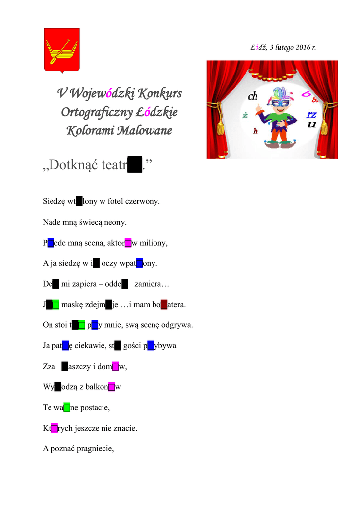 Łódź, 3 lutego 2016 r. V Wojewódzki Konkurs Ortograficzny Łódzkie Kolorami Malowane „Dotknąć teatr.” Siedzę wtlony w fotel czerwony. Nade mną świecą neony. Pede mną scena, aktorw miliony, A ja siedzę w i oczy wpatony. De mi zapiera – odde zamiera… J maskę zdejmje …i mam boatera. On stoi t py mnie, swą scenę odgrywa. Ja patę ciekawie, st gości pybywa Zza aszczy i domw, Wyodzą z balkonw Te wane postacie, Ktrych jeszcze nie znacie. A poznać pragniecie, Bo jesteście t przecie. Z pł sn i wyrywa kyk peraźliwy, donośny Tam Ta mra mra leci py sficie, to efekt podniosły. jak jaskłka, co ją wiatr goni nim się ped tym co straszne roni. Bliej nas ryce wojje na scenie, A t za nim kkiełki dają własne pedstawienie Zalene od ldzkiej ręki co nimi porsza. Tańczą w takt mzyki, a skacze mi dsza. Lalki dla widzw grają, tańcem, śpiewem, słwkiem i milczeniem, to aktoy oywiają je swoim tnieniem. Widzimy rne rodzaje lalek, co grają w teate Wstępje we mnie radość, kiedy na nie patę. K wędzie się nosi. Zosia mnie sztra i o pomoc prosi: - Powiedz mi Jacsi, mj drogi Czy ty pamiętasz nazwę tej lalki, co ma krtkie nogi ? Pamiętam jak naczycielka o lalka mwiła, Lecz jej nazwa z mzgu mi się lotniła. Dmny jestem z siebie, e jeśli odzi o pamięć to znam dobre triki - To jawajka Zosi! Czy widzisz py jej dłoniach dwa drciki ? Na stry, dr mj Kysiek, taki lalek ma wiele Z z niego, e dał się nimi bawić – tak robią pyjaciele. - Spj na ty wiewirki, ktre są pociągane, od gry, za sznrki ! Tak Zosia nagle wasnęła mi do a. Nie wie, e w teate zamiast mwić, to się sła. Więc ją cio pominać zaczynam, A jej ze wstyd zedła mina. Nagle na scenę wbiega kkiełek gromada. Jedna do drgiej peraźliwie głośno gada. Rejwa kkły – starszki narobiły, A pyszły ich crki i poądek z mamśkami zrobiły. W naszym pyszkolnym teate wielbiam wystko aby na co tylko patę: podrją, konie galopją Wrbelki latają, a pczoły nektar zbierają, Krlowa, swem męowi, krlowi składa yczenia, arce śta się na ińskiej śtawce W teate wystko jest moliwe. Kade dziecko moe t być szczęśliwe. Penosimy się w bajkowy świat, – to wila zapomnienia. Taki ktry moe się zdayć za sto lat. Wystko ttaj jest dozwolone. Wyobraźnia kadego człowieka moe iść w inną stronę. Ó– różowe od dziś będzie, granatowe rz – wszędzie, ż- zielone niezawodnie, h – brązowe, bardzo modnie, sz - wyjątki - czerwone, u i ch – czarnym posmolone Tekst dyktanda opracowany przez nauczycielki ze Szkoły Podstawowej nr 33 w Łodzi panią Joannę Miller i panią Anetę Misiak-Taras na V Wojewódzki Konkurs Ortograficzny „Łódzkie Kolorami Malowane” Łódź 2016