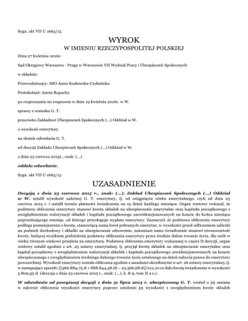 Sygn. akt VII U 1663/15 WYROK W IMIENIU RZECZYPOSPOLITEJ POLSKIEJ Dnia 27 kwietnia 2016r. Sąd Okręgowy Warszawa - Praga w Warszawie VII Wydział Pracy i Ubezpieczeń Społecznych w składzie: Przewodniczący: SSO Anna Kozłowska-Czabańska Protokolant: Aneta Rapacka po rozpoznaniu na rozprawie w dniu 19 kwietnia 2016r. w W. sprawy z wniosku G. T. przeciwko Zakładowi Ubezpieczeń Społecznych (...) Oddział w W. o wysokość emerytury na skutek odwołania G. T. od decyzji Zakładu Ubezpieczeń Społecznych (...) Oddział w W. z dnia 23 czerwca 2015r., znak: (...) oddala odwołanie. Sygn. akt VII U 1663/15 UZASADNIENIE Decyzją z dnia 23 czerwca 2015 r., znak: (...), Zakład Ubezpieczeń Społecznych (...) Oddział w W. ustalił wysokość należnej G. T. emerytury, tj. od osiągnięcia wieku emerytalnego, czyli od dnia 23 czerwca 2015 r. i ustalił termin płatności świadczenia na 15 dzień każdego miesiąca. Organ rentowy wskazał, że podstawę obliczenia emerytury stanowi kwota składek na ubezpieczenie emerytalne oraz kapitału początkowego z uwzględnieniem waloryzacji składek i kapitału początkowego zaewidencjonowanych na koncie do końca miesiąca poprzedzającego miesiąc, od którego przysługuje wypłata emerytury. Zaznaczył, że podstawa obliczenia emerytury podlega pomniejszeniu o kwotę, stanowiącą sumę kwot pobranych emerytur, w wysokości przed odliczeniem zaliczki na podatek dochodowy i składki na ubezpieczenie zdrowotne, natomiast samo świadczenie stanowi równowartość kwoty, będącej wynikiem podzielenia podstawy obliczenia emerytury przez średnie dalsze trwanie życia, dla osób w wieku równym wiekowi przejścia na emeryturę. Podstawę obliczenia emerytury wykazanej w części II decyzji, organ rentowy ustalił zgodnie z art. 25 ustawy emerytalnej, tj. przyjął kwotę składek na ubezpieczenie emerytalne oraz kapitał początkowy z uwzględnieniem waloryzacji składek i kapitału początkowego zewidencjonowanych na koncie ubezpieczonego z uwzględnieniem średniego dalszego trwania życia ustalonego na dzień nabycia prawa do emerytury powszechnej. Wysokość emerytury została obliczona zgodnie z zasadami określonymi w art. 26 ustawy emerytalnej, tj. w następujący sposób: [(366.884,75 zł + 888.844,58 zł) – 23.566,68 zł]/212,10 co dało kwotę świadczenia w wysokości 5.809,35 zł (decyzja z dnia 23 czerwca 2015 r., znak: (...), k. 8-9, tom II a.s.). W odwołaniu od powyższej decyzji z dnia 31 lipca 2015 r. ubezpieczony G. T. wniósł o jej zmianę w zakresie obliczenia wysokości emerytury poprzez ustalenie jej wysokości z uwzględnieniem kwoty składek zaewidencjonowanych na koncie i waloryzacji w wysokości 397.399,99 zł oraz kwoty zwaloryzowanego kapitału początkowego w wysokości 975.586,62 zł, tj. na poziomie ustalonym w decyzji z dnia 30 października 2014 r., przyznającej na jego rzecz prawo do emerytury częściowej. Odwołujący podniósł nadto, że gdyby do wyliczenia kapitału początkowego organ rentowy przyjął średnie dalsze trwanie życia w wymiarze 213,3 miesiąca, bądź 212,10 miesiąca, a nie 209 miesięcy, to wówczas kapitał początkowy ustalony na dzień 01 stycznia 1999 r. wyniósłby 312.493,03 zł, a nie 306.193,36 zł. W związku z powyższym odwołujący wniósł o ponowne przeliczenie zwaloryzowanego kapitału początkowego i zwaloryzowanych składek, wskazując, że emerytura, przyznana na jego rzecz na mocy zaskarżonej decyzji jest niższa o około 550,00 zł miesięcznie od świadczenia ustalonego w decyzji z dnia 30 października 2014 r., co - w jego ocenie - jest sprzeczne z zasadami współżycia społecznego (odwołanie z dnia 31 lipca 2015 r. k. 2-3 a.s.). W odpowiedzi na odwołanie z dnia 13 listopada 2015 r. Zakład Ubezpieczeń Społecznych (...) Oddział w W. wniósł o jego oddalenie, podtrzymując w całości treść zaskarżonej decyzji i argumenty w niej przedstawione. Dodatkowo organ rentowy wskazał, iż w związku z tym, że wnioskodawca pobierał emeryturę częściową, podstawę obliczenia emerytury, o której mowa w art. 24 pomniejsza się o kwotę, stanowiącą sumę kwot pobranych emerytur w wysokości przed odliczeniem zaliczki na podatek dochodowy od osób fizycznych i składki na ubezpieczenie zdrowotne. Wobec powyższego, do obliczenia emerytury powszechnej według nowych zasad organ rentowy przyjął następujące wartości, kwotę składek zaewidencjonowanych na koncie z uwzględnieniem waloryzacji w wysokości 366.884,75 zł, kwotę zwaloryzowanego kapitału początkowego w wysokości 888.844,58 zł, sumę kwot pobranych emerytur w wysokości 23.566,68 zł oraz średnie dalsze trwanie życia w wymiarze 212,13 miesięcy. Podkreślił, że zgodnie z art. 25a ustawy emerytalnej w przypadku, gdy prawo do emerytury nabyte jest w drugim kwartale, ale w czerwcu, to wówczas kwota składek poddana ostatniej rocznej waloryzacji, nie podlega żadnej waloryzacji kwartalnej. Natomiast ostatniej kwartalnej waloryzacji składek dokonuje się za czwarty kwartał poprzedniego roku. Nadmienił także, że zgodnie z treścią art. 26 ustawy emerytalnej, emerytura stanowi równowartość kwoty, będącej wynikiem podzielenia podstawy obliczenia ustalonej w sposób określony w art. 25 przez średnie dalsze trwanie życia dla osób w wieku równym wiekowi przejścia na emeryturę danego ubezpieczonego. Wiek ubezpieczonego w dniu przejścia na emeryturę wyraża się w ukończonych latach i miesiącach. Z kolei tablice trwania życia corocznie ogłasza Prezes GUS w formie komunikatu w terminie do dnia 31 marca. Z uwagi zatem na fakt, że ubezpieczony w dniu nabycia prawa do emerytury powszechnej miał ukończone 65 lat i 8 miesięcy, określone w stosunku do niego w ww. tabeli średnie dalsze trwanie życia wynosiło 212,10 miesięcy. Mając na uwadze powyższe rozważania, organ rentowy stwierdził, że zaskarżona decyzja z dnia 23 czerwca 2015 r., ustalająca wysokość emerytury ube