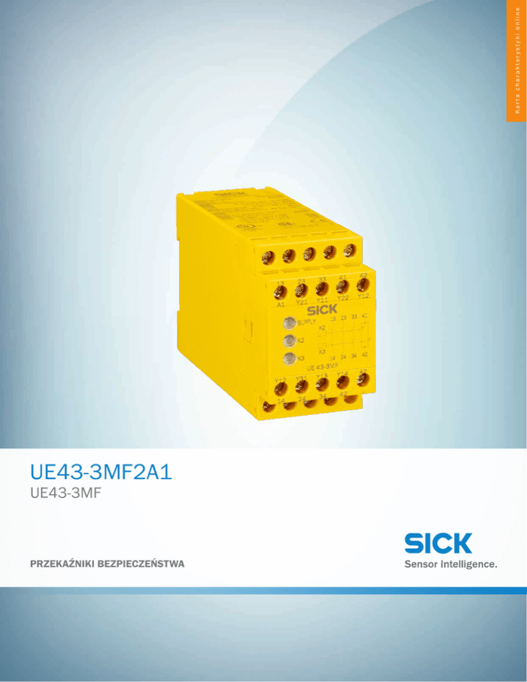 Karta charakterystyki online UE43-3MF2A1 UE43-3MF PRZEKAŹNIKI BEZPIECZEŃSTWA UE43-3MF2A1 | UE43-3MF PRZEKAŹNIKI BEZPIECZEŃSTWA A B C D E F H I J K L M N O P Q R S T Informacje do zamówienia Typ Nr artykułu UE43-3MF2A1 więcej wersji urządzeń i akcesoriów 6024899 www.sick.com/UE43-3MF Rysunek może się różnić Szczegółowe dane techniczne Charakterystyka bezpieczeństwa technicznego Poziom nienaruszalności bezpieczeństwa SIL3 (IEC 61508) SILCL3 (EN 62061) Kategoria Kategoria 4 (EN ISO 13849) Poziom zapewnienia bezpieczeństwa PL e (EN ISO 13849) Wartość B10d 1 x 106 przełączeń (AC-15, 230 V, I = 0,5 A) 3,5 x 105 przełączeń (DC-13, 24 V, I = 2 A) 1,2 x 106 przełączeń (DC-13, 24 V, I = 0,5 A) PFHD (średnie prawdopodobieństwo niebezpiecznej awarii na godzinę) 3,0 x 10-8 (EN ISO 13849) TM (okres użytkowania) 20 lat(a) (EN ISO 13849) Kategoria zatrzymania 0 (EN 60204-1) Interfejsy Typ przyłącza Stałe zaciski śrubowe Przekrój poprzeczny przewodu Jednoprzewodowy (2x, taki sam przekrój) 0,14 mm² ... 0,75 mm² Z cienkim przewodem z izolacją żył (2x, taki sam 0,2 mm² ... 0,5 mm² przekrój) Z cienkim przewodem z końcówką żyły (1x) 0,25 mm² ... 2,5 mm² Dane elektryczne Parametry eksploatacyjne Zasilanie elektryczne A1, A2 Ścieżka wyjściowa prądu > 25 V AC / 60 V DC PELV Ścieżka wyjściowa prądu ≤ 25 V AC / 60 V DC PELV lub SELV Napięcie zasilające Uv A1, A2 115 V AC (97,8 V AC ... 126,5 V AC) 2 SENS:CONTROL – ROZWIĄZANIA STEROWANIA BEZPIECZEŃSTWEM | SICK Karta charakterystyki online | 2016-07-21 15:24:09 Informacje mogą ulec zmianie bez powiadomienia UE43-3MF2A1 | UE43-3MF PRZEKAŹNIKI BEZPIECZEŃSTWA Pobór mocy (≤ 3,2 VA (AC)) Kategoria przepięciowa II Znamionowe napięcie izolacji Ui 300 V AC Napięcie znamionowe udarowe wytrzymywa- 4 kV ne Uimp Napięcie probiercze 2 kV (50 Hz) (EN 60439-1) Napięcie sterujące: Y11, Y21 Napięcie sterujące 24 V DC Prąd zwarcia ≤ 1 A, między Y11 i A2 Zabezpieczenie przeciwzwarciowe Transformator odporny na zwarcie Separacja galwaniczna ✔ (między A1, A2 i Y11, Y21, PE) Obwody wejściowe: Y12, Y31, Y22 Prąd wejściowy ≤ 15 mA Czas resetu Ręczny 150 ms Automatyczny 800 ms Monitorowanie czasu synchronizacji ≤ 500 ms≤ 500 ms Rezystancja przewodu ≤ 70 Ω Wyjściowe ścieżki prądowe: 13/14, 23/24, 33/34, 41/42 Czas opóźnienia bezpiecznego unieruchomienia 50 ms (≤ 50 ms) 1) Liczba ścieżek prądu zwalniającego (styk zwierny) 3, istotne dla bezpieczeństwa Liczba komunikacyjnych ścieżek prądowych 1, nieistotny dla bezpieczeństwa (rozwierny) Rodzaj styku O działaniu wymuszonym Materiał styków Stop srebra, napylany złotem Napięcie przełączające Ścieżka prądowa zezwolenia 10 V AC ... 230 V AC / 10 V DC ... 300 V DC Komunikacyjna ścieżka prądowa 10 V AC, 10 V DC ... 230 V AC, 300 V DC Prąd przełączania Ścieżka prądowa zezwolenia 10 mA ... 6 A Komunikacyjna ścieżka prądowa 10 mA ... 6 A Prąd sumaryczny ≤ 18 A Kategoria użytkowa AC-15/DC-13 (EN 60947-5-1) Znamionowy prąd roboczy / napięcie robocze 6 A (230 V AC) 3600 przełączeń/h 4 A (24 V DC) 360 przełączeń/h 3 A (24 V DC) 3600 przełączeń/h Częstotliwość przełączania ≤ 3600/godz. Żywotność mechaniczna (styki przekaźnika) 1 x 107 przełączeń Żywotność elektryczna (styki przekaźnika) 1) 2 x 106 przełączeń K1/K2. 2016-07-21 15:24:09 | Karta charakterystyki online Informacje mogą ulec zmianie bez powiadomienia SENS:CONTROL – ROZWIĄZANIA STEROWANIA BEZPIECZEŃSTWEM | SICK 3 UE43-3MF2A1 | UE43-3MF PRZEKAŹNIKI BEZPIECZEŃSTWA A B C D E F Dane mechaniczne Wymiary (szer. x wys. x głęb.) 45 mm x 120,5 mm x 75 mm Masa 0,36 kg Dane dotyczące otoczenia Stopień ochrony Zaciski IP 20 (EN 60529) Obudowa IP 40 (EN 60529) Emisja zakłóceń EN 61000-6-4 Odporność na zakłócenia EN 61000-6-2 Odporność na drgania 10 Hz ... 55 Hz (EN 60068-2-6) Amplituda 0,35 mm Odporność na wstrząsy 30 g, 11 ms (EN 60068-2-27) Schemat elektryczny H I J K L M N O P Q R S T A1A2 Y13 Y14 Y12Y12Y31 + + + + 13 23 33 41 + K2 + K3 -- K1 K2 K3 -Y11Y21 4 Y22 14 24 34 4242 SENS:CONTROL – ROZWIĄZANIA STEROWANIA BEZPIECZEŃSTWEM | SICK Karta charakterystyki online | 2016-07-21 15:24:09 Informacje mogą ulec zmianie bez powiadomienia Karta charakterystyki online SICK W SKRÓCIE Firma SICK należy do czołowych producentów inteligentnych czujników i rozwiązań wykorzystujących czujniki do zastosowań przemysłowych. Wyjątkowa gama produktów i usług stwarza idealną podstawę dla bezpiecznego i wydajnego sterowania procesami, ochrony ludzi przed wypadkami i unikania zanieczyszczenia środowiska. Mamy szerokie doświadczenie w różnych branżach i znamy występujące w nich procesy oraz wymagania. Nasze inteligentne czujniki zapewniają klientom dokładnie to, czego im potrzeba. W centrach aplikacji w Europie, Azji i Ameryce Północnej rozwiązania systemowe są testowane i optymalizowane pod kątem potrzeb konkretnych klientów. Wszystko to sprawia, że jesteśmy niezawodnym dostawcą i partnerem w zakresie rozwoju. Naszą ofertę dopełniają kompleksowe usługi: rozwiązania SICK LifeTime Services wspierają klientów w trakcie całego cyklu użytkowania maszyny i dbają o bezpieczeństwo i produktywność. Właśnie tak rozumiemy hasło „Sensor Intelligence”. BLISKO KLIENTA NA CAŁYM ŚWIECIE: Osoby kontaktowe i pozostałe lokalizacje - www.sick.com SICK AG |Waldkirch|Niemcy |www.sick.com