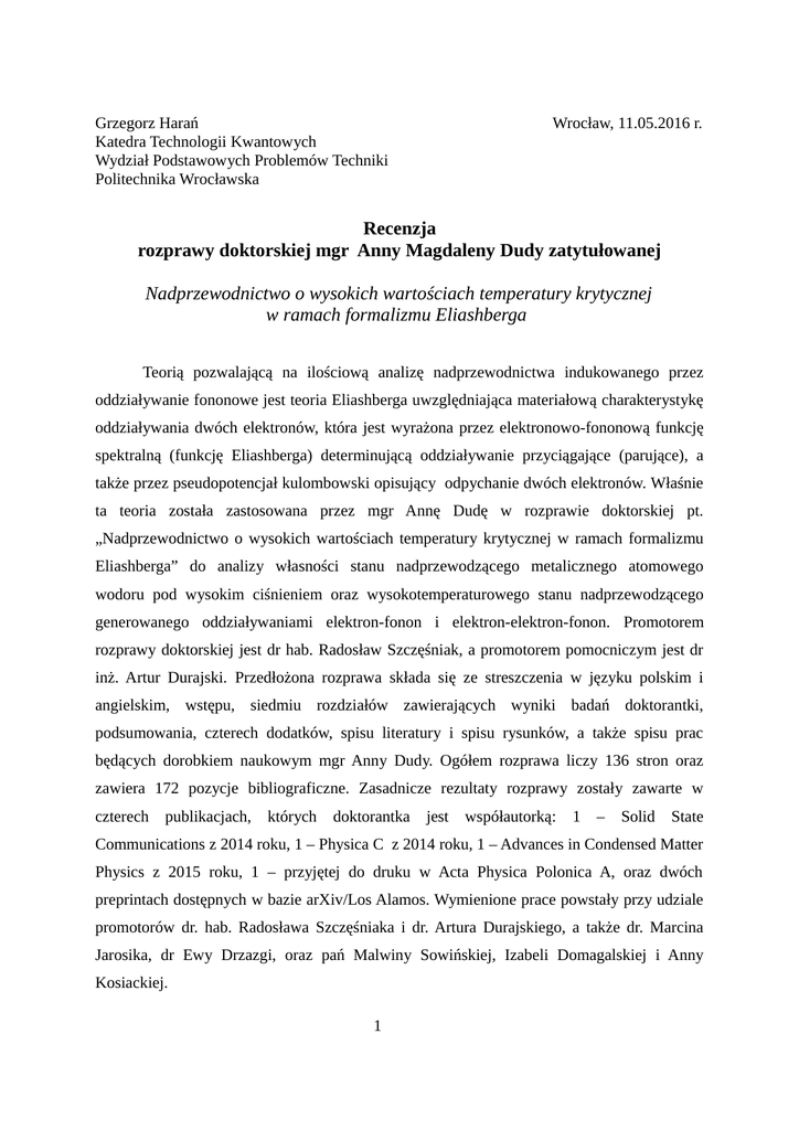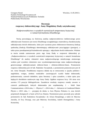 Grzegorz Harań Katedra Technologii Kwantowych Wydział Podstawowych Problemów Techniki Politechnika Wrocławska Wrocław, 11.05.2016 r. Recenzja rozprawy doktorskiej mgr Anny Magdaleny Dudy zatytułowanej Nadprzewodnictwo o wysokich wartościach temperatury krytycznej w ramach formalizmu Eliashberga Teorią pozwalającą na ilościową analizę nadprzewodnictwa indukowanego przez oddziaływanie fononowe jest teoria Eliashberga uwzględniająca materiałową charakterystykę oddziaływania dwóch elektronów, która jest wyrażona przez elektronowo-fononową funkcję spektralną (funkcję Eliashberga) determinującą oddziaływanie przyciągające (parujące), a także przez pseudopotencjał kulombowski opisujący odpychanie dwóch elektronów. Właśnie ta teoria została zastosowana przez mgr Annę Dudę w rozprawie doktorskiej pt. „Nadprzewodnictwo o wysokich wartościach temperatury krytycznej w ramach formalizmu Eliashberga” do analizy własności stanu nadprzewodzącego metalicznego atomowego wodoru pod wysokim ciśnieniem oraz wysokotemperaturowego stanu nadprzewodzącego generowanego oddziaływaniami elektron-fonon i elektron-elektron-fonon. Promotorem rozprawy doktorskiej jest dr hab. Radosław Szczęśniak, a promotorem pomocniczym jest dr inż. Artur Durajski. Przedłożona rozprawa składa się ze streszczenia w języku polskim i angielskim, wstępu, siedmiu rozdziałów zawierających wyniki badań doktorantki, podsumowania, czterech dodatków, spisu literatury i spisu rysunków, a także spisu prac będących dorobkiem naukowym mgr Anny Dudy. Ogółem rozprawa liczy 136 stron oraz zawiera 172 pozycje bibliograficzne. Zasadnicze rezultaty rozprawy zostały zawarte w czterech publikacjach, których doktorantka jest współautorką: 1 – Solid State Communications z 2014 roku, 1 – Physica C z 2014 roku, 1 – Advances in Condensed Matter Physics z 2015 roku, 1 – przyjętej do druku w Acta Physica Polonica A, oraz dwóch preprintach dostępnych w bazie arXiv/Los Alamos. Wymienione prace powstały przy udziale promotorów dr. hab. Radosława Szczęśniaka i dr. Artura Durajskiego, a także dr. Marcina Jarosika, dr Ewy Drzazgi, oraz pań Malwiny Sowińskiej, Izabeli Domagalskiej i Anny Kosiackiej. 1 Wstęp i dwa pierwsze rozdziały - „Wysokotemperaturowy stan nadprzewodzący” oraz „Motywacja do prowadzenia badań” - w których zawarty jest opis stanu badań dotyczących nadprzewodnictwa w temperaturach rzędu 10-102 K ze szczególnym uwzględnieniem nadprzewodnictwa w metalicznym wodorze pod wysokim ciśnieniem rzędu 10 2 - stanowią wprowadzenie do rozprawy 103 GPa i uzasadniają wybór tematyki badań, która dotyczy teoretycznego opisu o charakterze ilościowym nadprzewodnictwa wysokotemperaturowego indukowanego oddziaływaniami fononowymi. Możliwość zakwalifikowania wodoru pod wysokim ciśnieniem do grupy nadprzewodników wysokotemperaturowych jest uzasadniona przez przedstawienie w Tab.1.1 przewidywanych wartości podstawowych parametrów termodynamicznych. Część wyników z Tab.1.1 to oryginalne wyniki Doktorantki przyjęte do druku w Acta Physica Polonica A. W Tab.1.1 brak jednak odniesienia do tej pracy, której pierwszym autorem jest mgr Duda, a także nie została ona uwzględniona w spisie literatury. Wszystkie rozdziały rozprawy łączy zagadnienie wysokiej temperatury przejścia fazowego do stanu nadprzewodzącego i przyjęta metoda opisu – formalizm silnego sprzężenia Eliashberga. Doktorantka wyznacza mierzalne wielkości, które charakteryzują stan nadprzewodzący – temperaturę krytyczną, przerwę energetyczną w jednocząstkowym widmie wzbudzeń, zależność parametru porządku od energii kwazicząstek tworzących parę Coopera, krytyczne termodynamiczne pole magnetyczne, ciepło właściwe, a także charakterystyczne parametry pozwalające sprawdzić ewentualne odstępstwa od przewidywań teorii BCS i uzasadnić konieczność opisu opartego na rozwiązywaniu równań Eliashberga. Znacząca część rozprawy dotyczy nadprzewodnictwa pod wysokim ciśnieniem, którego znaczenie jest szczególnie istotne w kontekście nadprzewodnictwa metalicznego wodoru. Zagadnienia te zostały przedstawione w rozdziałach 3 - 5 w ramach izotropowego jednopasmowego formalizmu Eliashberga. W obliczeniach wykorzystano funkcje Eliashberga otrzymane w pracach Phys. Rev. B 88, 064517 (2013) (rozdz. 3), Physics Lett. A 375, 1264 (2011) (rozdz. 4), Phys. Rev. B 84, 144515 (2011) (rozdz. 5), których daty publikacji świadczą o aktualności podjętych badań. W rozdziale trzecim przedstawiono ilościową analizę własności termodynamicznych singletowego stanu nadprzewodzącego typu s w fosforze pod wysokim ciśnieniem rzędu 10-10 2 GPa, a także przedstawiono stosowany w rozprawie formalizm. Wyniki zostały zawarte w preprincie arXiv:1601.05819, pozycja bibliograficzna [92], którego pierwszym autorem jest mgr Anna Duda. Stosując formalizm Eliashberga stwierdzono, że efekty silnego sprzężenia elektronfonon, a także efekty retardacyjne są niewielkie co powoduje, że relacje między takimi 2 wielkościami jak: temperatura krytyczna, parametr porządku w zerze temperatury, termodynamiczne pole krytyczne, skok ciepła właściwego przy przejściu fazowym są z dobrym przybliżeniem odtwarzane przez relacje charakterystyczne dla przybliżenia BCS. Doktorantka rozpoczyna analizę problemu od krótkiego wprowadzenia do teorii BCS i jej uogólnienia uwzględniającego silne sprzężenie elektron-fonon, czyli teorii Eliashberga. Następnie, w krótkim przeglądzie literatury opisującej stan badań doświadczalnych i teoretycznych dotyczących nadprzewodnictwa w fosforze pod wysokim ciśnieniem, wskazuje na aktualność i istotność swoich badań. Motywacją jest duża ilość niepokrywających się danych doświadczalnych i stosowana zbyt uproszczona analiza teoretyczna, które razem nie prowadzą do jednoznacznych konkluzji. Wyniki teoretyczne zostały