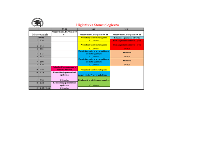 Higienistka Stomatologiczna Miejsce zajęć: 29.01 Pracownia ul. Partyzantów 61 1 09:00 2 10:30 3 10:35 4 12:05 5 12:15 6 13:45 7 14:00 8 15:30 9 15:40 10 17:10 11 17:20 12 18:50 13 18:55-19:40 Działalność gospodarcza w ochronie zdrowia Komunikacja personalna i społeczna E.Hanulak Komunikacja personalna i społeczna E.Hanulak 30.01 31.01 Pracownia ul. Partyzantów 61 Pracownia ul. Partyzantów 61 Propedeutyka stomatologiczna K. Uchman Edukacja i promocja zdrowia Stany zagrożenia zdrowia i życia Propedeutyka stomatologiczna Stany zagrożenia zdrowia i życia K. Uchman Zasady i techniki pracy w gabinecie stomatologicznym K. Uchman Zasady i techniki pracy w gabinecie stomatologicznym K. Uchman I.Wnuk Propedeutyka stomatologiczna Zasady i tech. Pracy w gab. Stom. Działałność profilaktyczno-lecznicza K. Uchman Anatomia I.Wnuk Anatomia I.Wnuk