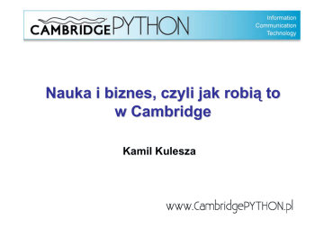 Nauka i biznes, czyli jak robią to w Cambridge Kamil Kulesza Patronat Partnerzy projektu CP Plan na dziś • O Cambridge • CP i założenia cyklu wykładów • Sprawy organizacyjne Plan na dziś • O Cambridge • CP i założenia cyklu wykładów • Sprawy organizacyjne Plan na dziś • O Cambridge • CP i założenia cyklu wykładów • Sprawy organizacyjne Geneza nazwy i cele CP CAMBRIDGE Silicon Fen Sieci społeczne, kapitał społeczny „How can I help you?” Geneza nazwy i cele CP Incubation (po polsku „inkubacja”) PYTHON ? PROBLEMY Pythoning (po polsku …?) Geneza nazwy i cele CP PYTHONING prof. Shailendra Vyakarnam (Shail), Centre for Entrepreneurial Learning, Judge Business School, University of Cambridge model opieki pyton nad jajkami i młodymi otoczyć nowe przedsięwzięcie odpowiednią siecią społeczną („How can I help you?”) Geneza nazwy i cele CP Konkurs „Wiesz, Wymyśl, Wygraj” Założenia cyklu wykładów wykorzystanie formuły z Centre for Entrepreneurial Learning, Judge Business School, University of Cambridge wykłady własne + zaproszeni goście: wykład + Q&A Hand-outs (assignments) Menu w najbliższym czasie październik 2007: 10.10 Barbara Nowakowska (PSIK) "Finansowanie przedsięwzięć high-tech za pomocą venture capital" 17.10 Kamil Kulesza (CP) TBA 24.10 Toby Moore (Imprimatur Capital Ltd) „Who wants to be an entrepreneur? The key principles of forming a start-up” 31.10 TBA Menu … a następnie: Prof. Włodzimierz Gogołek (UW) „Fenomen Web 2.0" Andrew Wash (Cambridge Enterprise) „The way they do it in Cambridge” Przedstawiciel McKinsey&Company Przedstawiciel Enterprise Investors Absolwent PW, który założył start-up i „wyszedł przez giełdę” … i inni. Plan na dziś • O Cambridge • CP i założenia cyklu wykładów • Sprawy organizacyjne Sprawy organizacyjne wsparcie zespołu CP, głównie studenci (the Cambridge way) sale otwieramy o 1400, wykład 1415 wpis na listę = „good British academic practice” zaliczenia i prace domowe kontakt: [email protected] „How can we help you?” zapraszamy na nasz serwer: