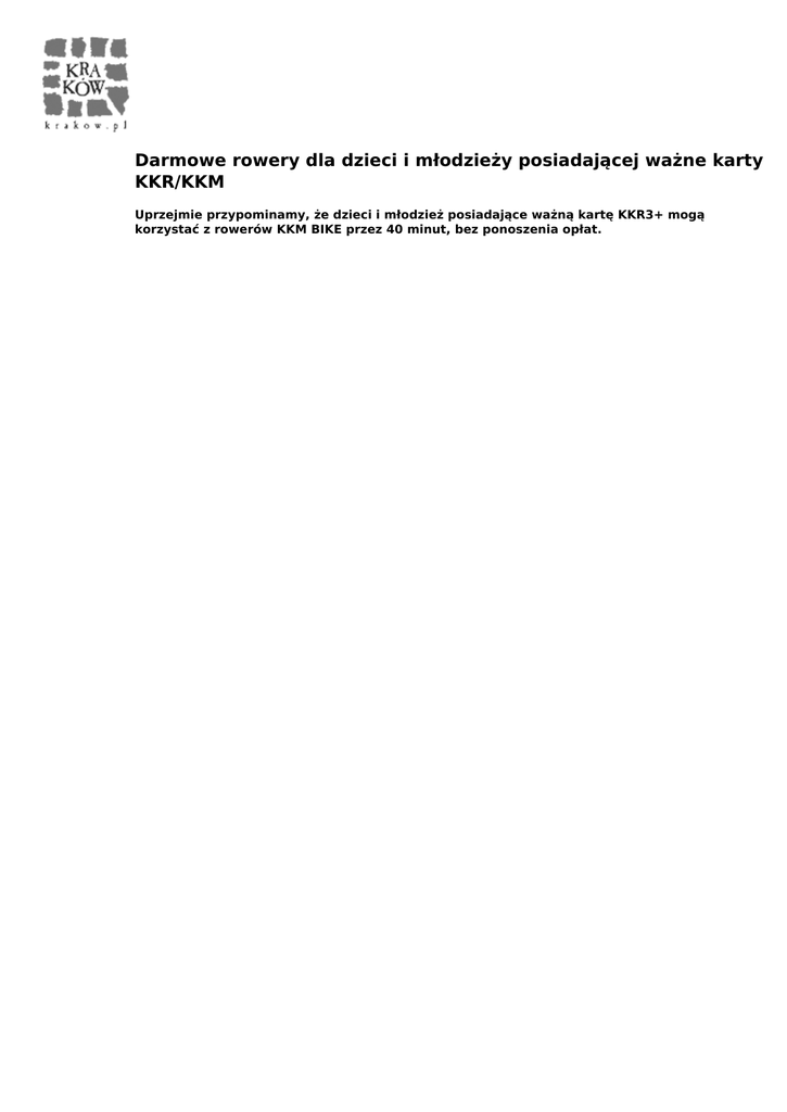 Darmowe rowery dla dzieci i młodzieży posiadającej ważne karty KKR/KKM Uprzejmie przypominamy, że dzieci i młodzież posiadające ważną kartę KKR3+ mogą korzystać z rowerów KKM BIKE przez 40 minut, bez ponoszenia opłat. Powered by TCPDF (www.tcpdf.org)