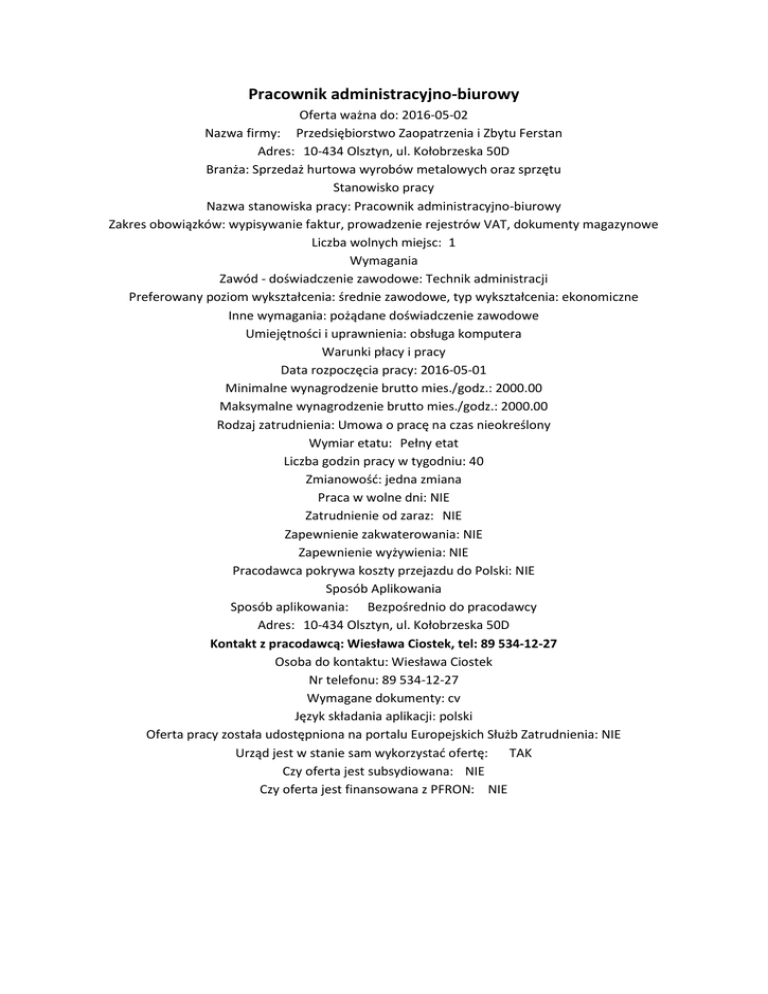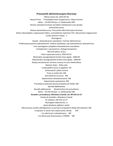 Pracownik administracyjno-biurowy Oferta ważna do: 2016-05-02 Nazwa firmy: Przedsiębiorstwo Zaopatrzenia i Zbytu Ferstan Adres: 10-434 Olsztyn, ul. Kołobrzeska 50D Branża: Sprzedaż hurtowa wyrobów metalowych oraz sprzętu Stanowisko pracy Nazwa stanowiska pracy: Pracownik administracyjno-biurowy Zakres obowiązków: wypisywanie faktur, prowadzenie rejestrów VAT, dokumenty magazynowe Liczba wolnych miejsc: 1 Wymagania Zawód - doświadczenie zawodowe: Technik administracji Preferowany poziom wykształcenia: średnie zawodowe, typ wykształcenia: ekonomiczne Inne wymagania: pożądane doświadczenie zawodowe Umiejętności i uprawnienia: obsługa komputera Warunki płacy i pracy Data rozpoczęcia pracy: 2016-05-01 Minimalne wynagrodzenie brutto mies./godz.: 2000.00 Maksymalne wynagrodzenie brutto mies./godz.: 2000.00 Rodzaj zatrudnienia: Umowa o pracę na czas nieokreślony Wymiar etatu: Pełny etat Liczba godzin pracy w tygodniu: 40 Zmianowość: jedna zmiana Praca w wolne dni: NIE Zatrudnienie od zaraz: NIE Zapewnienie zakwaterowania: NIE Zapewnienie wyżywienia: NIE Pracodawca pokrywa koszty przejazdu do Polski: NIE Sposób Aplikowania Sposób aplikowania: Bezpośrednio do pracodawcy Adres: 10-434 Olsztyn, ul. Kołobrzeska 50D Kontakt z pracodawcą: Wiesława Ciostek, tel: 89 534-12-27 Osoba do kontaktu: Wiesława Ciostek Nr telefonu: 89 534-12-27 Wymagane dokumenty: cv Język składania aplikacji: polski Oferta pracy została udostępniona na portalu Europejskich Służb Zatrudnienia: NIE Urząd jest w stanie sam wykorzystać ofertę: TAK Czy oferta jest subsydiowana: NIE Czy oferta jest finansowana z PFRON: NIE