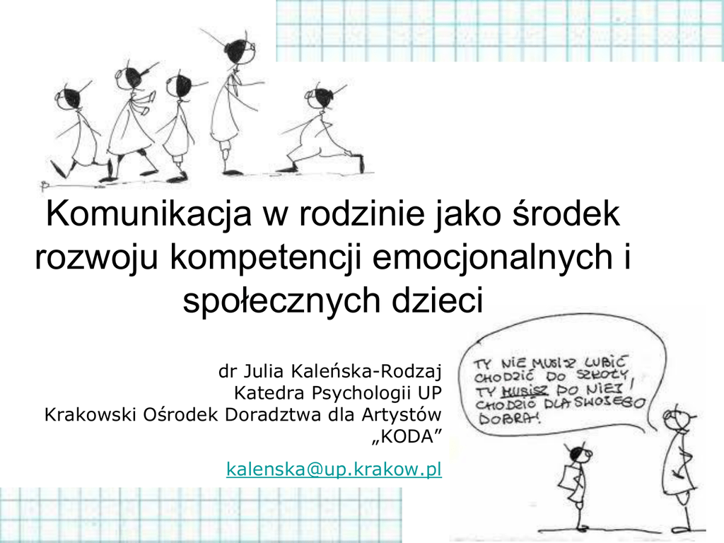 Komunikacja w rodzinie jako środek rozwoju kompetencji emocjonalnych i społecznych dzieci dr Julia Kaleńska-Rodzaj Katedra Psychologii UP Krakowski Ośrodek Doradztwa dla Artystów „KODA” [email protected] Rola rodziny • • • • internalizacja wartości i norm potrzeba wsparcia rodziców inni dorośli jako wzorce zachowań rozwój kompetencji społecznych: asertywność, odpowiedzialność, troska Styl wychowania w rodzinie a kompetencje społeczne 10-latków (Baumrind, 1991) Style wychowania Poziom kontroli Autorytatywny Autorytarny Pobłażliwy Niedbały Poziom opieki Dojrzałość wymagań Dojrzałość komunikacji PODMIOTOWE TRAKTOWANIE – poszanowanie autonomii, godności i niezależności drugiego człowieka • prawo do podejmowania decyzji dot. samego dziecka i uczestniczenie w decyzjach rodzinnych • uwzględnienie aktualnych potrzeb, kondycji i samopoczucia dziecka • przyzwolenie na inicjatywę • przyzwolenie na eksperymentowanie, popełnianie błędów • komunikacja: otwarta, jasna, uważne słuchanie, konstruktywna krytyka • udzielanie prawdziwych odpowiedzi, nieoszukiwanie, niemanipulowanie • poszanowanie własności i prywatności dziecka Podstawowe zasady komunikacji w rodzinie: • każdy członek rodziny powinien być zdolny do wyrażania spójnie, dokładnie i jasno tego, co widzi, słyszy, czuje, myśli o sobie i innych w ich obecności; • do każdej jednostki należy odnosić się jak do niepowtarzalnej jednostki, decyzje rodzinne powinny być podejmowane na podstawie negocjacji i eksploracji, a różnice zdań muszą być otwarcie uznane i używane w celu rozwoju Ćwiczenia usprawniające komunikację „Komplement” Pochwały i krytyka Polecenie: narysuj postać ludzką Uwagi nauczyciela, rodzica … Konstruktywna krytyka „Podoba mi się Twój pomysł, bo … (3 zalety), jednak zastanawiam się co by zrobić, by … (wady)” Udzielanie wsparcia Sytuacja: Dziecko przychodzi do domu rozgoryczone, smutne, ponieważ koledzy nie chcieli włączyć go do wspólnej zabawy… Co mówię do dziecka, jak się zachowuję? … Rodzaje udzielanego wsparcia • emocjonalne – polega na przekazywaniu komunikatów i emocji podtrzymujących, uspokajających i odzwierciedlających troskę, zrozumienie i pozytywne ustosunkowanie do osoby wspieranej – kocham Cię! • instrumentalne (rzeczowe / materialne) – polega na udzielaniu konkretnego instruktarzu o sposobach dalszego postępowania osoby wspieranej oraz na udzielaniu rzeczowej, materialnej pomocy – pomogę Ci! • informacyjne (poznawcze) – polega na udzielaniu informacji, rad, wskazówek, które sprzyjają lepszemu zrozumieniu sytuacji, problemu i położenia życiowego – wytłumaczę Ci! • wartościujące – polega na dawaniu jednostce komunikatów o posiadanych przez nią zdolnościach, możliwościach, umiejętnościach oraz podkreślanie znaczenia tych zasobów dla prawidłowego funkcjonowania osoby lub grupy – dasz rady! wiele potrafisz! jestem z Ciebie dumny! (na podstawie Tardy, 1985; Sęk, 1991) Adele Faber i Elaine Mazlish „JAK MÓWIĆ, żeby dzieci nas słuchały JAK SŁUCHAĆ, żeby dzieci do nas mówiły” wyd. Media Rodzina Jak pomóc dzieciom, aby radziły sobie z własnymi uczuciami (Faber i Mazlish, 2012) • Opisz stan, którzy zaobserwowałeś u dziecka „Widzę, że dziś jesteś nieco zmęczony/smutny…” • Słuchaj dziecka spokojnie i z uwagą • Zaakceptuj jego uczucia słowami: „Och” „mmm” „rozumiem” • Określ te uczucia „To musiało być męczące/przykre” „Widzę, że bardzo tym się martwisz” „Rozumiem twoje niezadowolenie …” • Za pomocą fantazji zaspokój niewykonalną prośbę dziecka „Gdybym tylko miała magiczną moc…” „Chciałabym karmić Cię wyłącznie cukierkami. To by było życie! Ale co by się stało z ząbkami i brzuszkiem?” Aby zachęcić dziecko do samodzielności (Faber i Mazlish, 2012) • Pozwól dziecku dokonać wyboru „Czy dzisiaj zaczniemy od liczenia czy od pisania?” • Okaż szacunek do dziecięcych zmagań „Pisanie literek nie jest łatwe. Czasem trzeba spróbować kilka razy” • Nie zadawaj zbyt wielu pytań „Miło Cię widzieć. Witaj w domu!” • Nie śpiesz się z dawaniem odpowiedzi „To ciekawe pytanie. Co o tym sądzisz?” • Zachęć dziecko do korzystania z cudzych rozwiązań „A jakby za to zadanie zabrała się mama/koleżanka?” • Nie odbieraj nadziei „A więc myślisz o sprawdzeniu swoich umiejętności sportowych? To dopiero będzie doświadczenie!” Aby dzieci nas słuchały i aby do nas mówiły, warto pamiętać o kilku zasadach: – mów, jakie odczucia wywołują w tobie zachowania drugiej osoby. Zaczynaj wypowiedź od informacji o swoich uczuciach, np. Złoszczę się..., denerwuje mnie…, – mów o konkretnych zachowaniach drugiej osoby, a nie o tym, jaka ona jest, np. złoszczę się, kiedy nie wyrzucasz papierków do kosza na śmieci zamiast jesteś bałaganiarzem, – nie oceniaj i nie dawaj rad, – unikaj uogólnień typu: „zawsze”, „każdy”, „wszyscy”, – mów tylko o sprawach, na które rozmówca ma wpływ, – mów stanowczo, ale łagodnie, w trybie oznajmującym, a nie rozkazującym, – nigdy nie trać cierpliwości. dziękuję za uwagę! dr Julia Kaleńska-Rodzaj Katedra Psychologii UP [email protected]