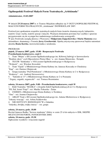 www.inowroclaw.pl Wygenerowano: 2017-03-04/12:13:24 Ogólnopolski Festiwal Małych Form Teatralnych ,,Arlekinada" Administrator, 15.03.2007 W dniach 23-24 marca 2007 r. w Teatrze Miejskim odbędzie się V OGÓLNOPOLSKI FESTIWAL MAŁYCH FORM TEATRALNYCH ,,Arlekinada" INOWROCŁAW 2007. Festiwal jest spotkaniem zespołów teatralnych małych form (teatrów dramatycznych, kabaretów, teatrów wizji i ruchu, teatrów poezji i innych). Ważnym elementem powinno być szybkie i sprawne przygotowanie się do występu bez nadmiernego rozbudowania scenografii.. W jury Festiwalu zasiądą aktorzy z Warszawy: Małgorzata Zajączkowska i Maria Mamona oraz dziennikarz, dramaturg z Torunia Jerzy Grochowiak. Opiekę artystyczną sprawować będzie natomiast aktorka Beata Kawka, inowrocławianka z urodzenia. PROGRAM: piątek, 23 marca 2007, godz. 15.00 - Rozpoczęcie Festiwalu Przesłuchania konkursowe, część I 1. Teatr "Mojra" z III Liceum Ogólnokształcącego im. Kólowej Jadwigi w Inowrocławiu "Realisty show" czyli Męczeństwo Piotra Ohey ' a - reż. Joanna Morawska - Świątek 2. TEATR "Siódemka" z VII Liceum Ogólnokształcącego w Bydgoszczy "Wolność" - reż. Wiesław Kowalski 3. Teatr "Gąski" z Młodzieżowego Domu Kultury im. Janusza Korczaka w Chodzieży "Kap" - reż. Dariusz Olejniczak 4. Grupa teatralna "Pod Pretekstem" z Młodzieżowego Domu Kultury nr 2 w Bydgoszczy "Krakersy" - reż. Andrzej Siewaszewicz 5. "Salonik nr 13" z Młodzieżowego Domu Kultury nr 2 w Poznaniu " Zegary, zegarki, zegareczki" - reż. Tomasz Rozmianiec sobota, 24 marca 2007, godz. 9.00 - Przesłuchania konkursowe, część II 1. Klub Teatralny "MASKA" z Zespołu Szkół Ogólnokształcących nr 4 w Bydgoszczy "Pif, Paf, Jesteś Trup!"- reż. Marika Tokarska - Żarna 2. CEDEEN z Młodzieżowego Domu Kultury w Świdnicy "Ona" - reż. Joanna Chojnowska 3. ARLET Teatr z III Liceum Ogólnokształcącego im. Adama Mickiewicza w Bydgoszczy "Jokasty wracają" - reż. Arleta Szatkowska 4. NIE DOTYCZY JEDNOŚADÓW z Gdańska "Jedynka, dwójka, trójka śnieży" - reż. grupa sobota, 24 marca, godz. 18.00 Recital Janusza Radka "Serwus madonna" (bilety w cenie 25 zł do nabycia w IDK, SKEPIE MUZYCZNYM FORTE, FOTOCENTER 2000) sobota, 24 marca, godz. 19.30 Ogłoszenie wyników i wręczenie nagród Wykonanie: CONCEPT Intermedia www.concept.net.pl Strona 1/1