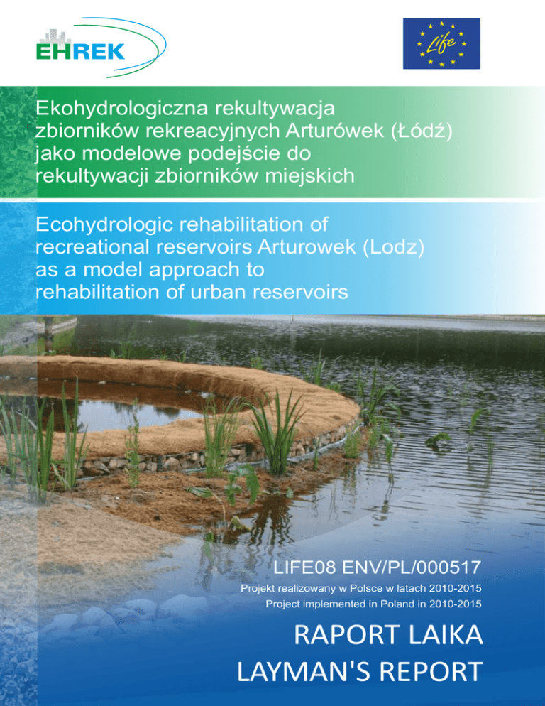 Ekohydrologiczna rekultywacja zbiorników rekreacyjnych Arturówek (Łódź) jako modelowe podejście do rekultywacji zbiorników miejskich Ecohydrologic rehabilitation of recreational reservoirs Arturowek (Lodz) as a model approach to rehabilitation of urban reservoirs LIFE08 ENV/PL/000517 Projekt realizowany w Polsce w latach 2010-2015 Project implemented in Poland in 2010-2015 RAPORT LAIKA LAYMAN'S REPORT 2 www.arturowek.pl 3 www.arturowek.pl 4 W myśl tej koncepcji, infrastruktura hydrotechniczna pozwala na sterowanie parametrami hydrologicznymi rzeki czy zbiornika, kontrolując jakość ich wody i stan ekologiczny. Z kolei odpowiednie kształtowanie elementów biologicznych pozwala modyfikować niektóre procesy zależne od hydrologii cieku. Takie podejście nie jest powszechnie stosowane w obszarach zurbanizowanych, gdzie tradycyjnie korzysta się jedynie z rozwiązań inżynierskich, w których możliwości sterowania cyklami naturalnymi są silnie ograniczone z uwagi na ogromny wpływ człowieka na środowisko. - - + - . (etap 5) w oparciu o zaproponowane w projekcie rozwiązania. (1) analiza zagrożeń i szans 2010 (2) koncepcja i projekt rekultywacji (3) realizacja inwestycji Etapy projektu (4) optymalizacja rozwiązań systemowych (5) system szkoleń 2015 www.arturowek.pl 5 According to this concept, hydrotechnical infrastructure enables to control hydrological parameters of a river or a reservoir to improve quality of its water and ecological status. In turn, proper shaping of the biological elements allows to modify some of the processes dependent on the watercourse hydrology. Such an approach is not typically applied in urban areas, where traditionally only engineering solutions are used, while their usefulness in controlling natural cycles in cities are often severely limited due to huge anthropopressure on the environment. quality of the Bzura River and eliminate cyanobacteria which form a bloom in the reservoirs was made under + - - (1) analysis of threats & opportunities 2010 (2) rehabilitation concept & design (3) implemented investments Project stages (4) optimisation of systemic solutions (5) training 2015 www.arturowek.pl 6 AŚ B1-B17 AG zbiorniki rekreacyjne „Arturówek” ulica Strykowska AD ulica Boruty ra - ulica Działka Bzu - ulica Wycieczkowa ulica Skrzydlata Kompleks rekreacyjny „Arturówek” położony jest w północnej części Łodzi, w dzielnicy Bałuty, w granicach największego w Europie wewnątrz granic miasta kompleksu leśnego - Lasu Łagiewnickiego o pow. 1200 ha. W 1996 r. z części lasu utworzono rezerwat przyrody Las Łagiewnicki o powierzchni 69,85 ha. Głównym przedmiotem ochrony jest kompleks naturalnych zbiorowisk roślinnych w postaci grądu i dąbrowy. Las Łagiewnicki położony jest zaledwie kwadrans drogi od centrum miasta. „Arturówek” usytuowany jest w dorzeczu rzeki Bzury, która bierze swój początek u podnóża Wzgórz Łagiewnickich. Bzura płynie ku zachodowi, tworząc najpierw na długości kilku kilometrów kaskadę 17 niewielkich zbiorników, a następnie trzy kilkuhektarowe zbiorniki rekreacyjne w Arturówku. Wokół zbiorników znajdują się liczne ścieżki spacerowe i rowerowe oraz wiele innych atrakcji: plaża, place zabaw dla dzieci, miejsca na piknik oraz baza noclegowa i gastronomiczna. rzeka Bzura zbiorniki małej retencji kierunek przepływu rzeki kierunek spływu wód deszczowych LEGENDA: Bzura - rzeka Bzura, AD - zbiornik Arturówek dolny, AŚ - zbiornik Arturówek środkowy, AG - zbiornik Arturówek górny, B1-B17 - sekwencja 17 zbiorników małej retencji w źródłowym odcinku rzeki www.arturowek.pl 7 Inflow of stormwater from city impermeable surfaces AŚ AG recreational reservoirs ’Arturowek’ river Bzura Strykowska street AD Boruty street ra Działka street Bzu Wycieczkowa street Skrzydlata street - B1-B17 small retention reservoirs direction of stormwater runoff direction of the river flow LEGEND: Bzura - river Bzura, AD - Arturowek lower reservoir, AŚ -Arturowek middle reservoir, AG - Arturowek upper reservoir, B1-B17 - a sequence of 17 small water retention reservoirs in the source section of the river www.arturowek.pl 8 - - - - www.arturowek.pl 9 - www.arturowek.pl 10 - > www.arturowek.pl 11 Pollution inflowing into rivers and reservoirs negatively impacts their functioning. Phosphorus and nitrogen compounds (so called: nutrients or nutrient substances) introduced into the surface water increase its fertility, i.e. causes eutrophication. These elements enter aquatic environment mainly as a result of human activity as they are contained in universally used cleaning agents or fertilisers, and even is present in dusts which is washed out form in the city. These compounds may also accumulate in bottom sediments in the reservoirs, from where they can be released back to the water in summer, thus increase its pollution. > www.arturowek.pl 12 www.arturowek.pl 13 called internal load, like i.e. The efficiency of the treatment strongly depends not only on the type of the vegetation planted, but also on the land topography and management, as well as the degree of pollution. Unfortunately this solution requires large areas, which are not always available in urban zones. www.arturowek.pl 14 Sekwencyjny System Sedymentacyjno-Biofitracyjny (SSSB) - etapowy system do oczyszczania wody z wykorzystaniem procesu opadania na dno zbiornika zanieczyszczeń stałych (sedymentacja) oraz usuwania z wody związków fosforu i azotu poprzez ich reakcje z wapieniem i dolomitem zawartych w filtrze geochemicznym oraz wbudowywanie w strukturę roślin (biofiltracja) REGULACJA I KONTROLA PROCESÓW BIOLOGICZNYCH WODA OPADOWA ULICA zawiesina, substancje ropopochodne, metale ciężkie, dioksyny, związki biogeniczne (związki azotu - N i fosforu - P) P. N. O2 MAKROFITY O2 O2 FILTR STREFA GEOCHEMICZNY SEDYMENTACJI Eliminacja Doczyszczenie związków wód biogenicznych z zawiesiny 3w części (głównie PO4 ) osadnikowej w 