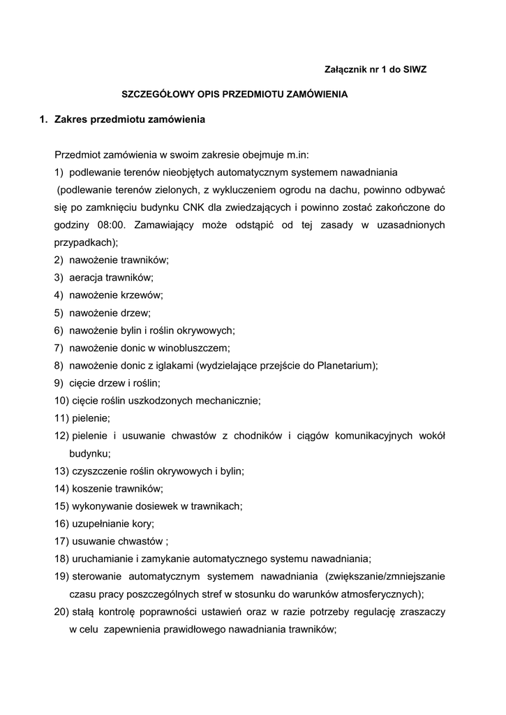 Załącznik nr 1 do SIWZ SZCZEGÓŁOWY OPIS PRZEDMIOTU ZAMÓWIENIA 1. Zakres przedmiotu zamówienia Przedmiot zamówienia w swoim zakresie obejmuje m.in: 1) podlewanie terenów nieobjętych automatycznym systemem nawadniania (podlewanie terenów zielonych, z wykluczeniem ogrodu na dachu, powinno odbywać się po zamknięciu budynku CNK dla zwiedzających i powinno zostać zakończone do godziny 08:00. Zamawiający może odstąpić od tej zasady w uzasadnionych przypadkach); 2) nawożenie trawników; 3) aeracja trawników; 4) nawożenie krzewów; 5) nawożenie drzew; 6) nawożenie bylin i roślin okrywowych; 7) nawożenie donic w winobluszczem; 8) nawożenie donic z iglakami (wydzielające przejście do Planetarium); 9) cięcie drzew i roślin; 10) cięcie roślin uszkodzonych mechanicznie; 11) pielenie; 12) pielenie i usuwanie chwastów z chodników i ciągów komunikacyjnych wokół budynku; 13) czyszczenie roślin okrywowych i bylin; 14) koszenie trawników; 15) wykonywanie dosiewek w trawnikach; 16) uzupełnianie kory; 17) usuwanie chwastów ; 18) uruchamianie i zamykanie automatycznego systemu nawadniania; 19) sterowanie automatycznym systemem nawadniania (zwiększanie/zmniejszanie czasu pracy poszczególnych stref w stosunku do warunków atmosferycznych); 20) stałą kontrolę poprawności ustawień oraz w razie potrzeby regulację zraszaczy w celu zapewnienia prawidłowego nawadniania trawników; 21) zabezpieczanie (zakrywanie) przewodów instalacji linii kroplujących oraz przewodów systemu nawadniającego; 22) pielęgnacja roślin doniczkowych w pomieszczeniach biurowych; 23) przesadzanie roślin w donice Zamawiającego; 24) pielęgnacja oczka wodnego w kraterze; 25) przechowywanie zimowe roślin z oczka wodnego w kraterze; 26) pielęgnacja roślin w kraterach; 27) grabienie liści; 28) dosadzanie roślin; 29) zabezpieczanie zimowe roślin; 30) prowadzenie zabiegów fitosanitarnych; 31) wywóz odpadów organicznych powstałych w trakcie wykonywania prac; 32) wykonanie raz w roku inwentaryzacji roślin, drzew i krzewów znajdujących się w Budynku, Biurze Zamawiającego, na terenie przynależnym do Budynku i dachu. Wynikiem przeprowadzonej inwentaryzacji będzie oficjalny protokół przekazany w wersji elektronicznej Zamawiającemu. Termin inwentaryzacji ustalony zostanie z Zamawiającym. 2. WYKAZ POWIERZCHNI TERENÓW ZIELONYCH L.P. wykaz powierzchni wielkość powierzchni w m² 1 TEREN ZEWNĘTRZNY 12 475 2 DACH 6 900 3. ORIENTACYJNY WYKAZ ROŚLINNOŚCI W CNK L.P. wykaz roślinności Ilość 1 trawniki 12 000 m² 2 krzewy 8 200 szt. 3 drzewa 60 szt. 4 byliny wraz z roślinami okrywowymi około 54 500 szt. 5 donice z winobluszczem 6 rośliny doniczkowe 24 szt. w pomieszczeniach 80 szt. biurowych 4. WYMAGANIA DOTYCZĄCE ZAKRESU CZĘSTOTLIWOŚCI WYKONYWANIA USŁUG WYMAGANIA DOTYCZĄCE CZĘSTOTLIWOŚĆ WYKONYWANYCH CZYNNOŚCI WYKONYWANEJ L.P. CZYNNOŚCI 1 Podlewanie trawników wg potrzeb 2 Nawożenie trawników 4 razy w sezonie 3 Nawożenie krzewów 2 razy w sezonie 4 Nawożenie drzew 1 raz w sezonie 5 Nawożenie bylin i roślin okrywowych 2 razy w sezonie 6 Nawożenie winobluszczy 2 razy w sezonie 7 Cięcie drzew i krzewów 8 Formujące cięcie drzew i krzewów 9 Cięcia roślin uszkodzonych 10 Czyszczenie roślin okrywowych i bylin 11 Pielenie 12 Zabiegi fitosanitarne (opryski grzybobójcze i owadobójcze) 13 14 1 raz w sezonie- wiosną 2 razy w sezonie wg potrzeby 2 razy w sezonie wg potrzeb wg potrzeb, minimum 4 razy w sezonie Koszenie trawników wraz z podkaszaniem miejsc niedostępnych co 7-14 dni Dosiewki w trawnikach (uzupełnianie ubytków wg potrzeby trawnika mieszanką traw o takim składzie gatunkowym jak istniejący trawnik) 15 Uzupełnienie kory z materiałem własnym 1 raz w sezonie przy założeniu 1000 worków w sezonie 16 Grabienie liści wg potrzeb 17 Uruchamianie i zamykanie automatycznego wg potrzeb systemu nawadniania 18 Wywóz odpadów organicznych powstałych wg potrzeby podczas wykonywania prac 19 Podlewanie, przycinanie nawożenie, roślin w czyszczenie, pomieszczeniach 1 raz w tygodniu biurowych wraz z uzupełnianiem ziemi i opieką fitosanitarną 20 Wymiana wymarzniętych nasadzeń krzewów wg potrzeby, maksimum 30 szt./rocznie 21 Wymiana wymarzniętych roślin okrywowych wg potrzeby, maksimum 50 szt./rocznie 22 zabezpieczanie (zakrywanie) przewodów instalacji linii kroplujących oraz przewodów systemu nawadniającego wg potrzeby
