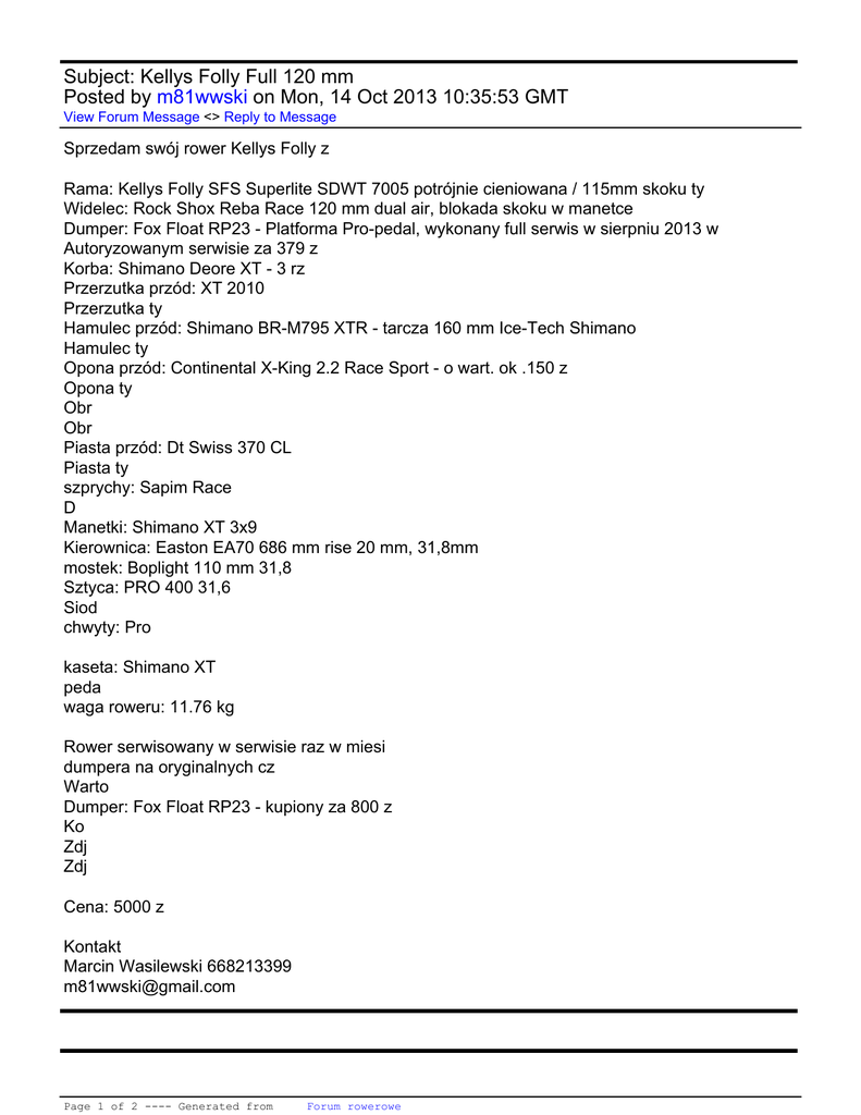 Subject: Kellys Folly Full 120 mm Posted by m81wwski on Mon, 14 Oct 2013 10:35:53 GMT View Forum Message <> Reply to Message Sprzedam swój rower Kellys Folly z Rama: Kellys Folly SFS Superlite SDWT 7005 potrójnie cieniowana / 115mm skoku ty Widelec: Rock Shox Reba Race 120 mm dual air, blokada skoku w manetce Dumper: Fox Float RP23 - Platforma Pro-pedal, wykonany full serwis w sierpniu 2013 w Autoryzowanym serwisie za 379 z Korba: Shimano Deore XT - 3 rz Przerzutka przód: XT 2010 Przerzutka ty Hamulec przód: Shimano BR-M795 XTR - tarcza 160 mm Ice-Tech Shimano Hamulec ty Opona przód: Continental X-King 2.2 Race Sport - o wart. ok .150 z Opona ty Obr Obr Piasta przód: Dt Swiss 370 CL Piasta ty szprychy: Sapim Race D Manetki: Shimano XT 3x9 Kierownica: Easton EA70 686 mm rise 20 mm, 31,8mm mostek: Boplight 110 mm 31,8 Sztyca: PRO 400 31,6 Siod chwyty: Pro kaseta: Shimano XT peda waga roweru: 11.76 kg Rower serwisowany w serwisie raz w miesi dumpera na oryginalnych cz Warto Dumper: Fox Float RP23 - kupiony za 800 z Ko Zdj Zdj Cena: 5000 z Kontakt Marcin Wasilewski 668213399 [email protected] Page 1 of 2 ---- Generated from Forum rowerowe Subject: Odp: Kellys Folly Full 120 mm Posted by m81wwski on Tue, 12 Nov 2013 14:11:50 GMT View Forum Message <> Reply to Message UP, nowa cena ALLEGRO Page 2 of 2 ---- Generated from Forum rowerowe