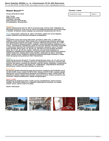 Biuro Podróży WIGRA s.c. ul. Człuchowska 25 01-360 Warszawa Tel. 22 665 06 06, 22 664 94 86, www.wigra.com.pl, e-mail: [email protected] Miami Beach*** Termin i cena Turcja 29.06-06.07.2016 29.06-06.07.2016 1999 zł Kraj: Turcja Miejscowość: Side Transport: Samolot Data ważności: 2016-06-29 Nr katalogowy: Wczasy/2015 Położenie Obiekt zlokalizowany jest ok. 600 m od antycznego centrum Side. Odległość od Manavgat wynosi ok. 5 km oraz ok. 65 km od międzynarodowego portu lotniczego w Antalyi. W pobliżu hotelu znajduje się przystanek autobusowy (ok. 60 m). Plaża: piaszczysta, oddalona ok. 100 m od hotelu, zejście do morza łagodne. Leżaki, materace oraz parasole dostępne są bezpłatnie. Hotel Poprzednio znany pod nazwą Side Point, powstał w 2003 roku, w 2009 roku poddany został renowacji. Hotel składa się z trzypiętrowego budynku głównego oraz piętrowego budynku bocznego i zajmuje całkowitą powierzchnię ok. 4 500 m2. Na terenie do dyspozycji gości: recepcja, restauracja główna podzielona na 2 części - wewnętrzną i zewnętrzną, kącik TV, bar przy basenie. Dla dzieci: krzesełka w restauracji, łóżeczka dla niemowląt (na życzenie), specjalne menu. Ponadto hotel posiada: basen (pow. ok. 90 m2, gł. 140-160 cm) oraz brodzik dla dzieci (pow. ok. 11 m2, gł. 36 cm). Leżaki, materace oraz parasole dostępne są bezpłatnie. Udogodnienia dodatkowe: wymiana walut, kącik internetowy (płatny), opieka medyczna, wypożyczanie samochodów, opiekunka do dzieci, wymiana walut, shisha corner, bezpłatny dostęp do bezprzewodowego Internetu w lobby. Hotel akceptuje karty płatnicze VISA i MasterCard. Pokoje Hotel oferuje łącznie 98 pokoi: 76 pokoi standardowych (pow. ok. 22 m2) oraz 22 pokoje ekonomiczne (w budynku bocznym). Wyposażenie stanowią: łazienka (WC, prysznic lub wanna, suszarka do włosów), mini bar (pusty, bezpłatny, uzupełnienie płatne), TV SAT, telefon, sejf (płatny ok. 2 EUR/dzień), indywidualnie sterowana klimatyzacja, balkon lub taras (pokoje na parterze). Wyżywienie Na terenie obiektu obowiązuje opcja All Inclusive: śniadanie (07:30-09:00), lunch (12:00-14:00), kawa i ciasto (16:00-17:00), kolacja (19:30-21:00). Lokalne napoje alkoholowe oraz bezalkoholowe dostępne są bezpłatnie w godz. 10:00-23:00. Za dodatkową opłatą: napoje importowane, kawa po turecku, świeżo wyciskane soki owocowe, napoje butelkowane, napoje energetyzujące. Sport i relaks Bezpłatnie do dyspozycji gości: rzutki, jacuzzi, backgammon, łaźnia turecka (wstęp). Na terenie hotelu raz w tygodniu odbywają się animacje. Za opłatą: masaż, sauna, sporty wodne na plaży. Wylot z Warszawy 1/1 Powered by TCPDF (www.tcpdf.org)