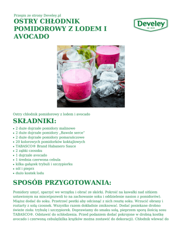 Przepis ze strony Develey.pl OSTRY CHŁODNIK POMIDOROWY Z LODEM I AVOCADO Ostry chłodnik pomidorowy z lodem i avocado SKŁADNIKI: ● ● ● ● ● ● ● ● ● ● ● 2 duże dojrzałe pomidory malinowe 2 duże dojrzałe pomidory „Bawole serce” 2 duże dojrzałe pomidory pomarańczowe 20 kolorowych pomidorków koktajlowych TABASCO® Brand Habanero Sauce 2 ząbki czosnku 1 dojrzałe avocado 1 średnia czerwona cebula kilka gałązek trybuli i szczypiorku sól i pieprz dużo kostek lodu SPOSÓB PRZYGOTOWANIA: Pomidory umyć, sparzyć we wrzątku i obrać ze skórki. Pokroić na kawałki nad sitkiem ustawionym na misce(pozwoli to na zachowanie soku i oddzielenie nasion z pomidorów). Miąższ dodać do soku. Przetrzeć pestki aby odcisnąć z nich resztę soku. Wrzucić obrany i roztarty z solą czosnek. Wszystko razem dokładnie zmiksować. Dodać posiekane drobno świeże zioła: trybulę i szczypiorek. Doprawiamy do smaku solą, pieprzem sporą ilością sosu TABASCO®. Odstawić do schłodzenia. Przed podaniem dodać pokrojone w drobną kostkę avocado i czerwoną cebulę(kilka krążków można zostawić do dekoracji). Chłodnik wlewać do szklanek z dużą ilością kostek lodu.