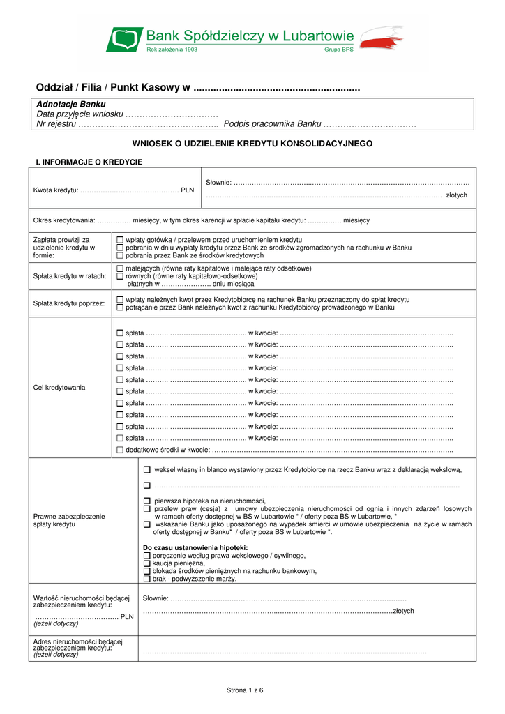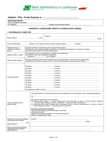 Oddział / Filia / Punkt Kasowy w ........................................................... Adnotacje Banku Data przyjęcia wniosku …………………………… Nr rejestru ………………………………………….. Podpis pracownika Banku …………………………… WNIOSEK O UDZIELENIE KREDYTU KONSOLIDACYJNEGO I. INFORMACJE O KREDYCIE Słownie: ……………………………..…………………….……………………………………… Kwota kredytu: …………….………………………. PLN ………………….………………………………..……………………………………… złotych Okres kredytowania: …………… miesięcy, w tym okres karencji w spłacie kapitału kredytu: …………… miesięcy Zapłata prowizji za udzielenie kredytu w formie: wpłaty gotówką / przelewem przed uruchomieniem kredytu pobrania w dniu wypłaty kredytu przez Bank ze środków zgromadzonych na rachunku w Banku pobrania przez Bank ze środków kredytowych Spłata kredytu w ratach: malejących (równe raty kapitałowe i malejące raty odsetkowe) równych (równe raty kapitałowo-odsetkowe) płatnych w …………………. dniu miesiąca Spłata kredytu poprzez: wpłaty należnych kwot przez Kredytobiorcę na rachunek Banku przeznaczony do spłat kredytu potrącanie przez Bank należnych kwot z rachunku Kredytobiorcy prowadzonego w Banku spłata ………. ……………………………. w kwocie: ………………………………………………………………….. spłata ………. ……………………………. w kwocie: ………………………………………………………………….. spłata ………. ……………………………. w kwocie: ………………………………………………………………….. spłata ………. ……………………………. w kwocie: ………………………………………………………………….. spłata ………. ……………………………. w kwocie: ………………………………………………………………….. Cel kredytowania spłata ………. ……………………………. w kwocie: ………………………………………………………………….. spłata ………. ……………………………. w kwocie: ………………………………………………………………….. spłata ………. ……………………………. w kwocie: ………………………………………………………………….. spłata ………. ……………………………. w kwocie: ………………………………………………………………….. spłata ………. ……………………………. w kwocie: ………………………………………………………………….. dodatkowe środki w kwocie: …………………………………………………………………………………………….. weksel własny in blanco wystawiony przez Kredytobiorcę na rzecz Banku wraz z deklaracją wekslową, ……………………………………………………………………………………………………………………… Prawne zabezpieczenie spłaty kredytu pierwsza hipoteka na nieruchomości, przelew praw (cesja) z umowy ubezpieczenia nieruchomości od ognia i innych zdarzeń losowych w ramach oferty dostępnej w BS w Lubartowie * / oferty poza BS w Lubartowie, * wskazanie Banku jako uposażonego na wypadek śmierci w umowie ubezpieczenia na życie w ramach oferty dostępnej w Banku* / oferty poza BS w Lubartowie *. Do czasu ustanowienia hipoteki: poręczenie według prawa wekslowego / cywilnego, kaucja pieniężna, blokada środków pieniężnych na rachunku bankowym, brak - podwyższenie marży. Wartość nieruchomości będącej zabezpieczeniem kredytu: ………………………………. PLN (jeżeli dotyczy) Adres nieruchomości będącej zabezpieczeniem kredytu: (jeżeli dotyczy) Słownie: ……………………………..…………………….……………………………………… ………………….………………………………..……………………………………………złotych ………………….………………………………..………………………………………………………… Strona 1 z 6 II. INFORMACJE O WNIOSKODAWCACH Wnioskodawca I Wnioskodawca II Imiona Nazwisko Imiona rodziców Nazwisko rodowe Nazwisko rodowe matki PESEL Stan cywilny zamężna/żonaty panna/kawaler separacja Małżeńska wspólnota majątkowa tak Cechy dokumentu tożsamości Adres zamieszkania Adres do korespondencji / (jeżeli jest inny niż adres zamieszkania) Nr telefonu (do wyboru) nie wdowa/wdowiec rozwiedziona/y nie dotyczy zamężna/żonaty panna/kawaler separacja tak nie wdowa/wdowiec rozwiedziona/y nie dotyczy Nazwa: …………………………………………. Nazwa: ………………………….………………. Seria…………………………………………….. Seria…………………………….……………….. Nr dokumentu: ……………….………………… Nr dokumentu: …………….…….……………… Wydany przez: ................................................ Wydany przez: ................................................. Ulica: ………………………….…………………. Ulica: ……………………………………………... Nr domu: ………………….…………………….. Nr domu: …………………………………………. Nr lokalu………………….……………………… Nr lokalu: …………………….…………………… Kod: ……………………………………………... Kod: …………………………….………………… Miejscowość: …………………….……………… Miejscowość………………….………………….. Kraj: ………………………