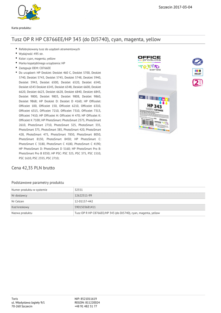 Szczecin 2017-03-04 Karta produktu: Tusz OP R HP C8766EE/HP 343 (do DJ5740), cyan, magenta, yellow Refabrykowany tusz do uządzeń atramentowych Wydajność: 495 str. Kolor: cyan, magenta, yellow Marka kopatyblinego urządzenia: HP Zastępuje OEM: C8766EE Do urządzeń: HP DeskJet: DeskJet 460 C, DeskJet 5700, DeskJet 5740, DeskJet 5743, DeskJet 5745, DeskJet 5748, DeskJet 5940, DeskJet 5943, DeskJet 6500, DeskJet 6520, DeskJet 6540, DeskJet 6543 DeskJet 6545, DeskJet 6548, DeskJet 6600, DeskJet 6620, DeskJet 6623, DeskJet 6628, DeskJet 6840, DeskJet 6843, DeskJet 9800, DeskJet 9803, DeskJet 9808, DeskJet 9860, DeskJet 9868; HP DeskJet D: DeskJet D 4160; HP OfficeJet: OfficeJet 100, OfficeJet 150, OfficeJet 6210, OfficeJet 6310, OfficeJet 6315, OfficeJet 7210, OfficeJet 7310, OfficeJet 7313, OfficeJet 7410; HP OfficeJet H: OfficeJet H 470; HP OfficeJet K: OfficeJet K 7100; HP PhotoSmart: PhotoSmart 2575, PhotoSmart 2610, PhotoSmart 2710, PhotoSmart 325, PhotoSmart 335, PhotoSmart 375, PhotoSmart 385, PhotoSmart 420, PhotoSmart 428, PhotoSmart 475, PhotoSmart 7850, PhotoSmart 8050, PhotoSmart 8150, PhotoSmart 8450; HP PhotoSmart C: PhotoSmart C 3180, PhotoSmart C 4180, PhotoSmart C 4190; HP PhotoSmart D: PhotoSmart D 5160; HP PhotoSmart Pro B: PhotoSmart Pro B 8350; HP PSC: PSC 325, PSC 375, PSC 1510, PSC 1610, PSC 2355, PSC 2710; Cena 42,35 PLN brutto Podstawowe parametry produktu Numer produktu w systemie 32551 Nr dostawcy 12622511-99 Nr Celcen 12-01157-442 Kod kreskowy 5901503681411 Nazwa produktu Tusz OP R HP C8766EE/HP 343 (do DJ5740), cyan, magenta, yellow Toris ul. Władysława Jagieły 9/1 70-260 Szczecin NIP: 8521011619 REGON: 811220024 +48 91 482 51 77 Szczecin 2017-03-04 Karta katalogowa produktu cd. Tusz OP R HP C8766EE/HP 343 (do DJ5740), cyan, magenta, yellow Opis Refabrykowany tusz do uządzeń atramentowych; wydajność: 495 str.; kolor: cyan, magenta, yellow; marka kopatyblinego urządzenia: HP; zastępuje OEM: C8766EE; do urządzeń: HP DeskJet: DeskJet 460 C, DeskJet 5700, DeskJet 5740, DeskJet 5743, DeskJet 5745, DeskJet 5748, DeskJet 5940, DeskJet 5943, DeskJet 6500, DeskJet 6520, DeskJet 6540, DeskJet 6543 DeskJet 6545, DeskJet 6548, DeskJet 6600, DeskJet 6620, DeskJet 6623, DeskJet 6628, DeskJet 6840, DeskJet 6843, DeskJet 9800, DeskJet 9803, DeskJet 9808, DeskJet 9860, DeskJet 9868; HP DeskJet D: DeskJet D 4160; HP OfficeJet: OfficeJet 100, OfficeJet 150, OfficeJet 6210, OfficeJet 6310, OfficeJet 6315, OfficeJet 7210, OfficeJet 7310, OfficeJet 7313, OfficeJet 7410; HP OfficeJet H: OfficeJet H 470; HP OfficeJet K: OfficeJet K 7100; HP PhotoSmart: PhotoSmart 2575, PhotoSmart 2610, PhotoSmart 2710, PhotoSmart 325, PhotoSmart 335, PhotoSmart 375, PhotoSmart 385, PhotoSmart 420, PhotoSmart 428, PhotoSmart 475, PhotoSmart 7850, PhotoSmart 8050, PhotoSmart 8150, PhotoSmart 8450; HP PhotoSmart C: PhotoSmart C 3180, PhotoSmart C 4180, PhotoSmart C 4190; HP PhotoSmart D: PhotoSmart D 5160; HP PhotoSmart Pro B: PhotoSmart Pro B 8350; HP PSC: PSC 325, PSC 375, PSC 1510, PSC 1610, PSC 2355, PSC 2710; Kategoria Tusze Klasa Ekonomiczne Marka HP Kolor Kolor Cyan, magenta, yellow Cecha W ofercie od 2016-07 Produkt HP Typ Refabrykowany Wspólny słownik zamówień CPV 30192113-6 Wkłady drukujące Certyfikaty Nowy produkt w ofercie Standard Hit Standard Zastosowanie Zastosowanie Do urządzeń atramentowych Serdecznie zapraszamy do współpracy Toris ul. Władysława Jagieły 9/1 70-260 Szczecin NIP: 8521011619 REGON: 811220024 +48 91 482 51 77 Szczecin 2017-03-04 Toris zespół. Toris ul. Władysława Jagieły 9/1 70-260 Szczecin NIP: 8521011619 REGON: 811220024 +48 91 482 51 77