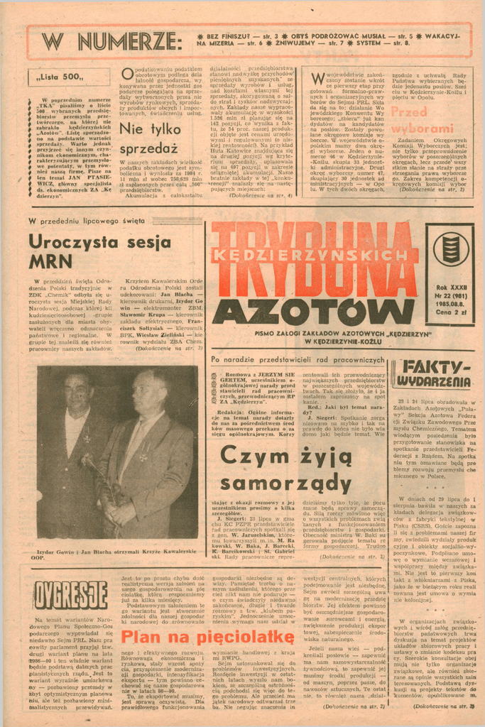 rW NUMERZE: ,Lista 5 0 0 " W poprzednim numerze „TKA" pisaliśmy o liście 500 wybranych przedsiębiorstw przemysłu przetwórczego, na której nie zabrakło kędzierzyńskich „Azotów". Listę sporządzono na podstawie wartości sprzedaży. Warto jednak przyjrzeć *ię innym czynnikom ekonomicznym, charakteryzującym przemysłowe potentaty, w tym również naszą firmę. Pisze na ten temat JAN PTASIEWICZ, główny specjalista ds. ekonomicznych ZA „Kę dzierzyn". # BEZ FINISZU? — str. 3 # O B Y Ś P O D R Ó Ż O W A Ć MUSIAŁ — słr. 5 # NA MIZERIA — str. 6 # ŻNIWUJEMY — słr. 7 # SYSTEM - - słr. 8. podatkowaniu podatkiem obrotowym podlega dzia łalność gospodarcza, wy konywana przez jednostki gos podarcze polegająca na sprzedaży wytworzonych przez nie wyrobów rynkowych, sprzedaży produktów obcych i importowanych, świadczeniu usług. O N i e tylko sprzedaż W naszych zakładach wielkość podatku obrotowego jest symboliczna i wyniosła za 1984 r. 11 min zł wobec 758.628 min zł zapłaconych przez całą „500" przedsiębiorstw. Akumulacja z całokształtu WAKACYJ- ÏK iff działalności przedsiębiorstwa stanowi nadwyżkę przychodów' pieniężnych uzyskanych" ze sprzedaży wyrobów i usług r nad kosztami własnymi tej sprzedaży, skorygowaną o saldo strat i zysków nadzwyczajnych. Zakłady nasze wypracowały akumulację w wysokości 1.526 min zł plasując się na 142 pozycji, co 'wynika z faktu, że 54 proc. naszej produkcji objęte jest cenami urzędowymi i regulowanymi (o niskiej rentowności). Na przykład • Huta Katowice znajdująca się na drugiej pozycji wg kryterium sprzedaży, uplasowała się na 497 pozycji w zakresie osiągniętej akumulacji. Nasze bratnie zakłady w tej „konkur e n c j i " znalazły się na następujących miejscach: (Dokończenie na str. 4) W województwie zakończony zostanie wkrót ce pierwszy etap przy gotowań formalno-prawnych i organizacyjnych wy borów do Sejmu PRL. Skła da się na to: działanie Wo jewódzkiegp Konwentu Wy borczego; „zbiera" już kan dydatów na kandydatów na posłów. Zostały powołane okręgowe komisje wy borcze. W województwie opolskim mamy dwa okręgi wyborcze. Jeden o numerze 46 w Kędzierzynie-Koźlu, skupia 33 jednostki administracyjne. Drugi okręg wyborczy numer 47, skupiający 30 jednostek ad ministracyjnych — w Opo lu. W tych dwóch okręgach, zgodnie z uchwałą Rady Państwa wybieranych będzie jedenastu posłów. Sześ ciu w Kędzierzynie-Koźlu i pięciu w Opolu. Przed wybora Zadaniem Okręgowych Komisji Wyborczych jest; nie tylko przeprowadzenie wyborów w poszczególnych okręgach, lecz przede^ wszy stkim stanie na straży prze strzegania prawa wyborcze go. Zakres kompetencji okręgowych komisji wybór (Dokończenie na str. 2) W przededniu lipcowego święta Uroczysta sesja MRN W przeddzień święta Odrodzenia Polski tradycyjnie w ZDK „Chemik" odbyła się uroczysta sesja Miejskiej Rady Narodowej, podczas której kil kudziesięcioosobowej .grupie zasłużonych dla miasta obywateli wręczono odznaczenia państwowe i regionalne. W grupie tej. znaleźli się również pracownicy naszych zakładów. Krzyżem Kawalerskim Orde ru Odrodzenia Polski zostali udekorowani: J a n Blacha — kierownik drukarni, Izydor Go win — elektromonter ZBM, Sławomir Krupa — kierownik zakładu elektrycznego, Franciszek Sołtysiak — kierownik BPK, Wiesław Zieliński — kie równik wydziału ZBA Chem. (Dokończenie na str. 3) AZOTÓW PISMO Z A t O G I ZAKŁADÓW A Z O T O W Y C H „KĘDZIERZYN" W KIDZIERZYNIC K O Ż L U Po naradzie przedstawicieli > Rozmowa z JERZYM SIE GERTEM, uczestnikiem ogólnokrajowej narady przed stawicieli rad pracowniczych, przewodniczącym RP $2 ZA „Kędzierzyn". Redakcja: Ogólne informacje na temat narady dotarły do nas za pośrednictwem środ ków masowego przekazu o za sięgu ogólnokrajowym. Korzy rad pracowniczych zentowali ich przewodniczący największych przedsiębiorstw w poszczególnych województwach. Tak się złożyło, że i ja zostałem zaproszony na spot kanie. Red.: Jaki był temat narady? J. Siegert: Spotkanie zorga nizowano na szybko i tak na prawdę do końca nie było wia domo jaki będzie temat. Wie C z y m żyją samorządy stając z okazji rozmowy z j e j uczestnikiem prosimy o kilka szczegółów. J. Siegert: 23 lipca w gma chu KC PZPR przedstawiciele rad pracowniczych spotkali się z gen. W. Jaruzelskim, któremu towarzyszyli m. in. M. Ra kowski, W. Baka, J. Barecki, IC. Barcikowski i St. Gabriel ski. Rady pracownicze repre- dzieliśmy tylko tyle, że poru szane będą sprawy samorządu. Siłą rzeczy mówiono więc o wszystkich problemach zwią żanych z funkcjonowaniem przedsiębiorstw i gospodarki. Obecność ministra W. Baki su gerowała podjęcie tematu re formy gospodarczej. Trudno Jest to po prostu chyba dość realistyczna wersja założeń na szego gospodarowania na pię ciolatkę, którą rozpoczniemy już za kilka miesięcy. Podstawowym założeniem te go wariantu jest stworzenie zdolności dla naszej gospodar ki narodowej do zrównoważo gospodarki niezbędne są dewizy. Pamiętać trzeba o naszym zadłużeniu, którego prze cież nikt nam nie podaruje o czym świadczyły niedawno zakończone, długie i twarde rozmowy z tzw. „klubem paryskim". Jednocześnie umocnienia wymaga nasz udział w westycji centralnych, których podejmowanie jest niezbędne, Sejm zwrócił szczególną uwa gę na modernizację przedsię biorstw. J e j efektem powinno być oszczędniejsze gospodarowanie surowcami i energią, zwiększenie produkcji ekspor towej, zabezpieczenie środowiska naturalnego. nego i efektywnego rozwoju. Równowaga ekonomiczna i rynkowa, stały wzrost spoży cia, przyspieszenie modernizacji gospodarki, intensyfikacja eksportu — tym powinno-cechować się nasze gospodarowa nie w latach 86—90. To, że eksportować musimy, jest sprawą oczywistą. Dla prawidłowego funkcjonowania wymianie handlowej z kraja mi RWPG. Sejm u