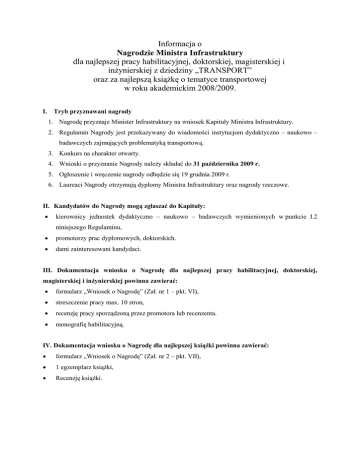 Informacja o Nagrodzie Ministra Infrastruktury dla najlepszej pracy habilitacyjnej, doktorskiej, magisterskiej i inŜynierskiej z dziedziny „TRANSPORT” oraz za najlepszą ksiąŜkę o tematyce transportowej w roku akademickim 2008/2009. I. Tryb przyznawani nagrody 1. Nagrodę przyznaje Minister Infrastruktury na wniosek Kapituły Ministra Infrastruktury. 2. Regulamin Nagrody jest przekazywany do wiadomości instytucjom dydaktyczno – naukowo – badawczych zajmujących problematyką transportową. 3. Konkurs na charakter otwarty. 4. Wnioski o przyznanie Nagrody naleŜy składać do 31 października 2009 r. 5. Ogłoszenie i wręczenie nagrody odbędzie się 19 grudnia 2009 r. 6. Laureaci Nagrody otrzymują dyplomy Ministra Infrastruktury oraz nagrody rzeczowe. II. Kandydatów do Nagrody mogą zgłaszać do Kapituły: • kierownicy jednostek dydaktyczno – naukowo – badawczych wymienionych w punkcie I.2 niniejszego Regulaminu, • promotorzy prac dyplomowych, doktorskich. • dami zainteresowani kandydaci. III. Dokumentacja wniosku o Nagrodę dla najlepszej pracy habilitacyjnej, doktorskiej, magisterskiej i inŜynierskiej powinna zawierać: • formularz „Wniosek o Nagrodę” (Zał. nr 1 – pkt. VI), • streszczenie pracy max. 10 stron, • recenzję pracy sporządzoną przez promotora lub recenzenta. • monografię habilitacyjną. IV. Dokumentacja wniosku o Nagrodę dla najlepszej ksiąŜki powinna zawierać: • formularz „Wniosek o Nagrodę” (Zał. nr 2 – pkt. VII), • 1 egzemplarz ksiąŜki, • Recenzję ksiąŜki. V. ZałoŜenia organizacyjne 1. Udział w Konkursie mogą wziąć prace obronione w roku akademickim 2007/2008 oraz ksiąŜki wydane w roku akademickim 2008/2009 i zgłoszone do biura organizacji konkursu tj: Katedra Transportu Szynowego Politechniki Śląskiej w Katowicach ul. Krasińskiego 8 40 – 019 Katowice, Tel./fax: (48 32) 603 43 64, Mail: [email protected] 2. Kapituła dokonuje oceny zgłaszanych prac biorąc pod uwagę w szczególności następujące kryteria: • zgodność tematyki pracy z ideą konkursu; • moŜliwość praktycznego wykorzystania pracy; • wartość naukową pracy. 3. Ogłoszenie wyników, wręczenie dyplomów i nagród odbędzie się 18 grudnia 2009 r. w Katowicach na spotkaniu z udziałem przedstawicieli Ministra Infrastruktury, władz administracyjno – samorządowych oraz przedstawicieli prasy, radia i telewizji. 4. Jednocześnie przesyłamy proponowane tematy do podjęcia w ramach konkursu na najlepszą pracę habilitacyjną, doktorską, magisterską i inŜynierską na następne lata (Zał. 2). VI. Podstawowe informacje dotyczące zgłoszonej do konkursu pracy: Załącznik nr 1. WYSZCZEGÓLNIENIE Tytuł, imię i nazwisko autora pracy Rodzaj pracy (habilitacyjna, doktorska, magisterska, inŜynierska, dyplomowa szkoły średniej) Tytuł Pracy Data Obrony Adres domowy autora pracy Telefon, e-mail Imię i nazwisko, stopień naukowy promotora pracy Adres domowy, telefon kontaktowy Adres, telefon Instytucji DANE VII. Podstawowe informacje dotyczące zgłoszonej do konkursu ksiąŜki: Załącznik nr 2. WYSZCZEGÓLNIENIE Tytuł, imię i nazwisko autora ksiąŜki Tytuł ksiąŜki Wydawnictwo Recenzenci Adres domowy lub słuŜbowy autora ksiąŜki, telefon, e-mail DANE VIII. Proponowane tematy do podjęcia w ramach konkursu na najlepsze pracę habilitacyjną, doktorską, magisterską, i inŜynierską z dziedziny TRANSPORT 1. Wpływ rozwoju infrastruktury transportowej na aktywację wybranego regionu – Polska – Kraje UE. 2. Polityka transportowa w aspekcie integracji a UE. 3. Finansowanie inwestycji miejskich. Rola środków pomocowych i innych źródeł finansowania. 4. Finansowanie inwestycji infrastruktury transportowej z wykorzystaniem środków pomocowych Unii Europejskiej. 5. Prognozowanie potrzeb transportowych w warunkach przekształceń strukturalnych gospodarki. 6. Współpraca miedzygałęziowa transportu /multimodalność/. 7. Skutki wprowadzenia systemów logistycznych dla rozwoju transportu. 8. Rola transportu w rozwoju gospodarczym krajów Basenu Morza Bałtyckiego. 9. Perspektywy rozwoju przewozów intermodalnych na przykładzie wybranych operatorów transportu kombinowanego. 10. Nieniszczące metody badań w transporcie. 11. Nowe metody projektowania konstrukcji transportowych. 12. Materiały i technologie w transporcie zmniejszające hałas i drgania. 13. Ekologia i ergonomia w transporcie. 14. Modelowa struktura organizacji zarządzania sektorem infrastruktury transportu kolejowego. 15. Badania i prognoza rozwoju lotnisk w Polsce. 16. Analiza wpływu lotnisk na zagospodarowanie przestrzenne regionu i Polski. 17. Analiza moŜliwości rozwoju usług logistycznych na zmodernizowanych ciągach transportowych. 18. Analiza konkurencyjności polskich portów morskich. 19. Wpływ rozwoju portów na środowisko i zagospodarowanie. 20. Metody zarządzania siecią teletransmisyjną oraz optymalizacja ruchu w sieci szkieletowej. 21. Zintegrowane systemy transportowe. 22. Nowe rozwiązania techniczne, ekonomiczne i organizacyjne w transporcie.