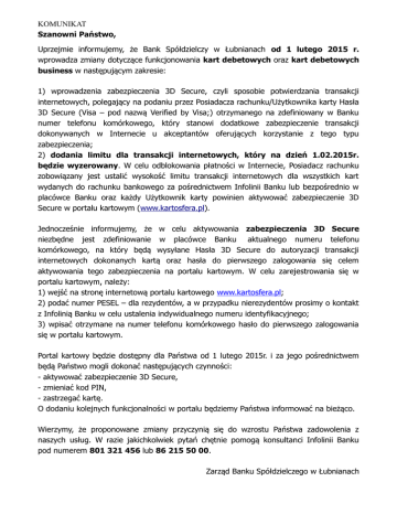 KOMUNIKAT Szanowni Państwo, Uprzejmie informujemy, że Bank Spółdzielczy w Łubnianach od 1 lutego 2015 r. wprowadza zmiany dotyczące funkcjonowania kart debetowych oraz kart debetowych business w następującym zakresie: 1) wprowadzenia zabezpieczenia 3D Secure, czyli sposobie potwierdzania transakcji internetowych, polegający na podaniu przez Posiadacza rachunku/Użytkownika karty Hasła 3D Secure (Visa – pod nazwą Verified by Visa;) otrzymanego na zdefiniowany w Banku numer telefonu komórkowego, który stanowi dodatkowe zabezpieczenie transakcji dokonywanych w Internecie u akceptantów oferujących korzystanie z tego typu zabezpieczenia; 2) dodania limitu dla transakcji internetowych, który na dzień 1.02.2015r. będzie wyzerowany. W celu odblokowania płatności w Internecie, Posiadacz rachunku zobowiązany jest ustalić wysokość limitu transakcji internetowych dla wszystkich kart wydanych do rachunku bankowego za pośrednictwem Infolinii Banku lub bezpośrednio w placówce Banku oraz każdy Użytkownik karty powinien aktywować zabezpieczenie 3D Secure w portalu kartowym (www.kartosfera.pl). Jednocześnie informujemy, że w celu aktywowania zabezpieczenia 3D Secure niezbędne jest zdefiniowanie w placówce Banku aktualnego numeru telefonu komórkowego, na który będą wysyłane Hasła 3D Secure do autoryzacji transakcji internetowych dokonanych kartą oraz hasła do pierwszego zalogowania się celem aktywowania tego zabezpieczenia na portalu kartowym. W celu zarejestrowania się w portalu kartowym, należy: 1) wejść na stronę internetową portalu kartowego www.kartosfera.pl; 2) podać numer PESEL – dla rezydentów, a w przypadku nierezydentów prosimy o kontakt z Infolinią Banku w celu ustalenia indywidualnego numeru identyfikacyjnego; 3) wpisać otrzymane na numer telefonu komórkowego hasło do pierwszego zalogowania się w portalu kartowym. Portal kartowy będzie dostępny dla Państwa od 1 lutego 2015r. i za jego pośrednictwem będą Państwo mogli dokonać następujących czynności: - aktywować zabezpieczenie 3D Secure, - zmieniać kod PIN, - zastrzegać kartę. O dodaniu kolejnych funkcjonalności w portalu będziemy Państwa informować na bieżąco. Wierzymy, że proponowane zmiany przyczynią się do wzrostu Państwa zadowolenia z naszych usług. W razie jakichkolwiek pytań chętnie pomogą konsultanci Infolinii Banku pod numerem 801 321 456 lub 86 215 50 00. Zarząd Banku Spółdzielczego w Łubnianach
