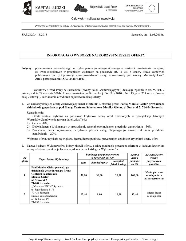 Człowiek – najlepsza inwestycja Przetarg nieograniczony na usługę „Organizacji i przeprowadzenia usługi szkoleniowej pod nazwą: Murarz/tynkarz”. ZP.3.2420.4.15.2013 Szczecin, dn. 11.03.2013r. INFORMACJA O WYBORZE NAJKORZYSTNIEJSZEJ OFERTY dotyczy: postępowania prowadzonego w trybie przetargu nieograniczonego o wartości zamówienia mniejszej od kwot określonych w przepisach wydanych na podstawie art. 11 ust. 8 ustawy Prawo zamówień publicznych pn.: „Organizacja i przeprowadzenie usługi szkoleniowej pod nazwą: Murarz/tynkarz”. Znak postępowania: ZP.3.2420.4.2013. Powiatowy Urząd Pracy w Szczecinie (zwany dalej „Zamawiającym”) działając zgodnie z art. 92 ust. 2 ustawy z dnia 29 stycznia 2004r. Prawo zamówień publicznych t.j. Dz. U. z 2010r., Nr 113, poz. 759 ze zm. (zwaną dalej „ustawą”), zawiadamia o wyborze najkorzystniejszej oferty. 1. Za najkorzystniejszą ofertę Zamawiający uznał ofertę nr 1, złożoną przez: Panią Monikę Gielar prowadzącą działalność gospodarczą pod firmą: Centrum Szkoleniowe Monika Gielar, ul Szarotki 7, 71-604 Szczecin: Uzasadnienie: Oferta została wybrana na podstawie kryteriów oceny ofert określonych w Specyfikacji Istotnych Warunków Zamówienia (zwaną dalej „siwz”) tj.: 1) Cena – 50%; 2) Doświadczenie Wykonawcy w prowadzeniu szkoleń obejmujących przedmiot zamówienia – 30%, 3) Posiadanie przez Wykonawcę certyfikatu jakości usług obejmującego swoim zakresem przedmiot zamówienia – 20%. Wybrana oferta, uzyskała największą, łączną liczbę punktów przyznanych zgodnie z kryteriami oceny ofert. 2. Nazwa i adresy Wykonawców, którzy złożyli oferty, a także punktacja przyznana ofertom w każdym kryterium oceny ofert oraz punktacja łączna uzyskana przez każdego z Wykonawców: Nr oferty 1. 2. Nazwa i adres Wykonawcy Pani Monika Gielar prowadząca działalność gospodarczą po firmą: Centrum Szkoleniowe Monika Gielar ul. Szarotki 7 71-604 Szczecin ,,Oświata – EWIN” Sp. z o.o. ul. Jagiellońska 91/8 70-436 Szczecin Biuro i korespondencja: ul. Wileńska 49 71-033 Szczecin Punktacja przyznana ofertom w kryteriach (w %): certyfikat cena doświadczenie jakości usług Łączna liczba punktów (w %) Kolejność ofert według przyznanych punktów 50,00 30,00 20,00 100,00 Oferta pierwsza w kolejności najkorzystniejsza 22,44 0,00 10,00 32,44 Oferta druga w kolejności Projekt współfinansowany ze środków Unii Europejskiej w ramach Europejskiego Funduszu Społecznego
